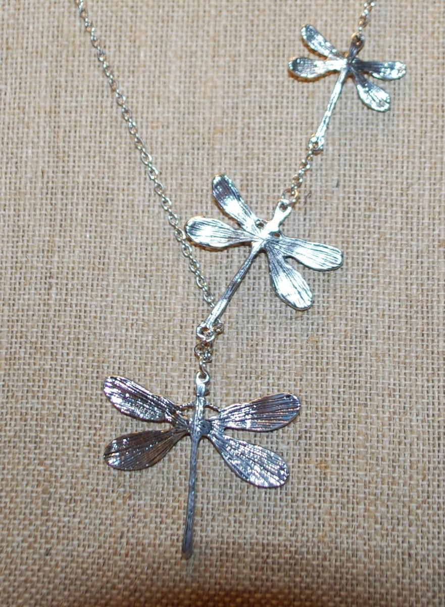 Triple Dragonflies Silver Tone PENDANTS (2" & Smaller) on a Silver Tone Long Necklace Chain 26" L