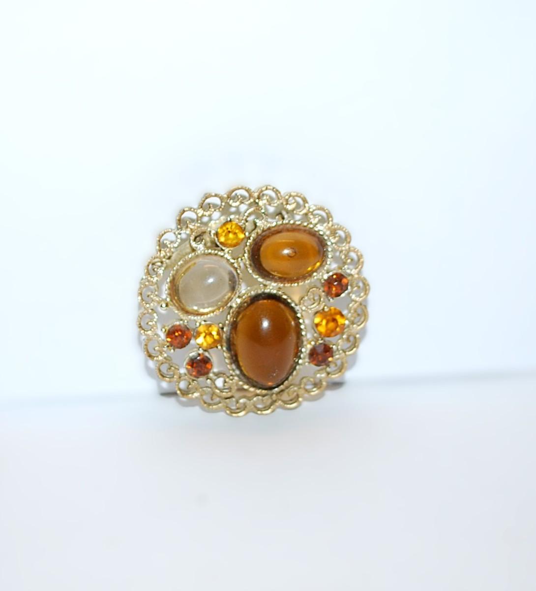 Triple Oval AMBER & WHITE STONES BROOCH (1½" Diam.) with Amber Accents Stones and Filagree Style Gold Tone Setting