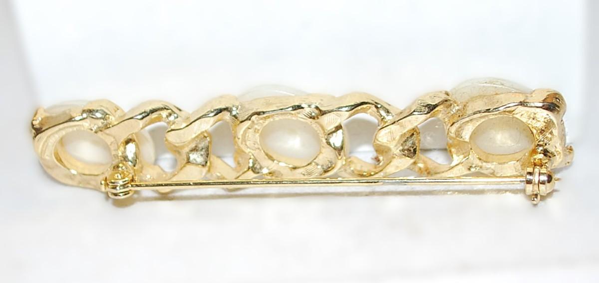 Triple Polymer White Oval Buttons BAR BROOCH (3" x ½") on a Chain Style Gold Tone Setting