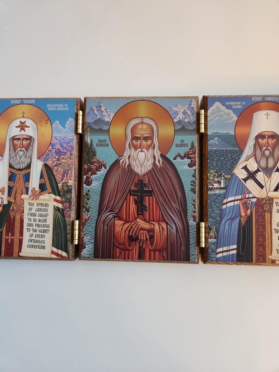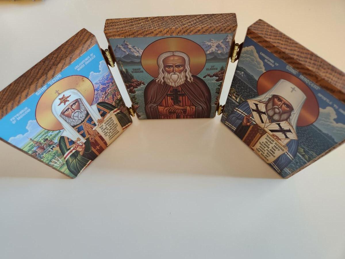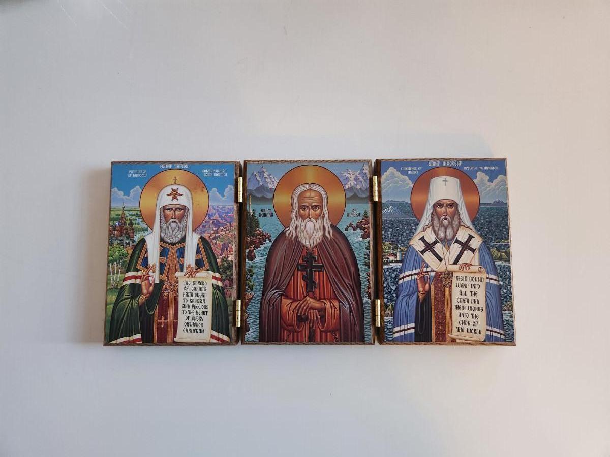 This auction lot is for a Triptych of Icons. This hinged gathering is just perfect for a small space display. The icons are printed on paper and fused to oak wood boards. This is a nice example of the art.