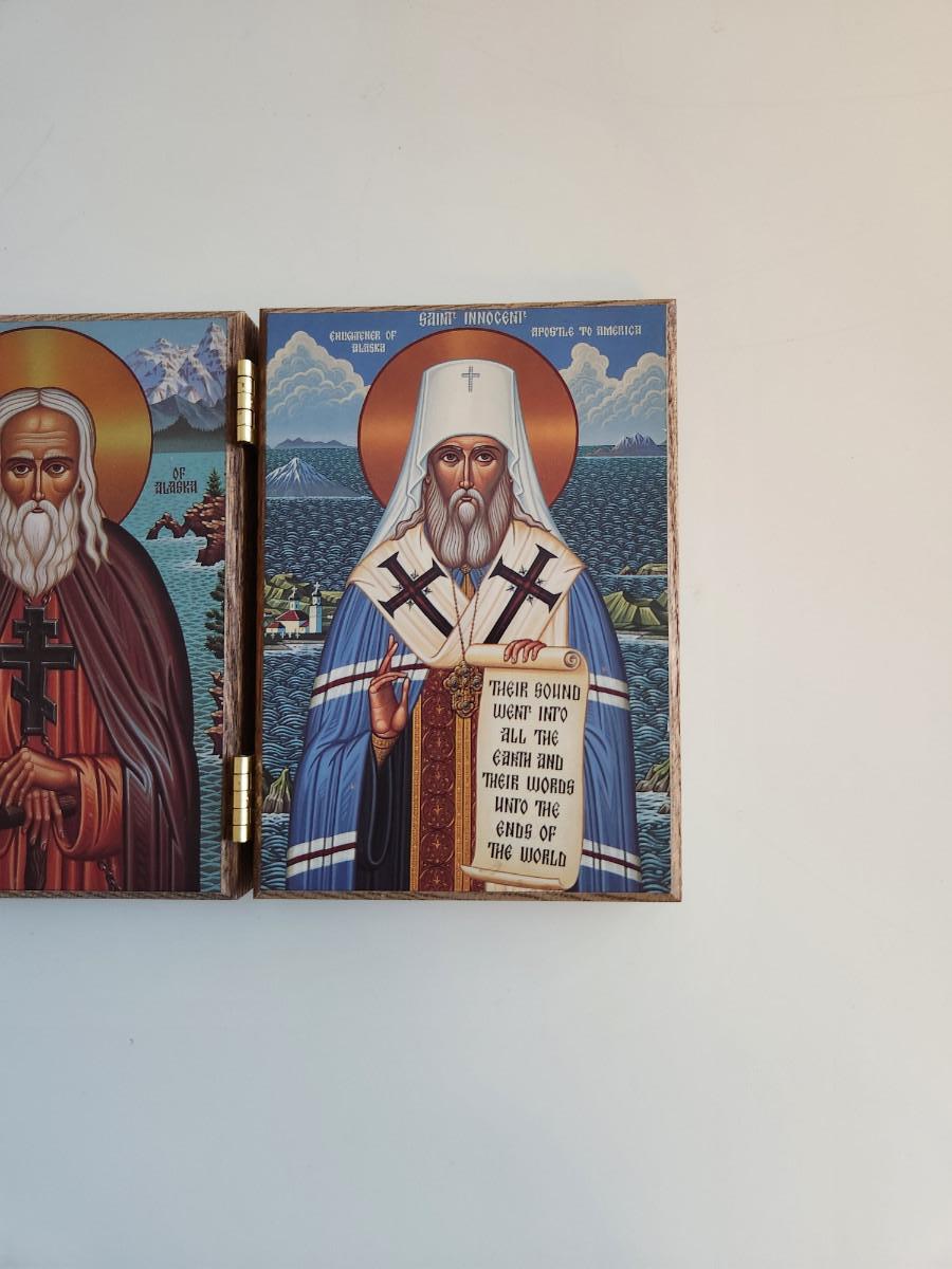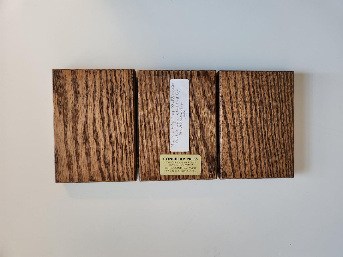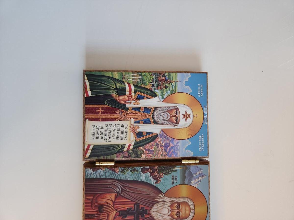 This auction lot is for a Triptych of Icons. This hinged gathering is just perfect for a small space display. The icons are printed on paper and fused to oak wood boards. This is a nice example of the art.