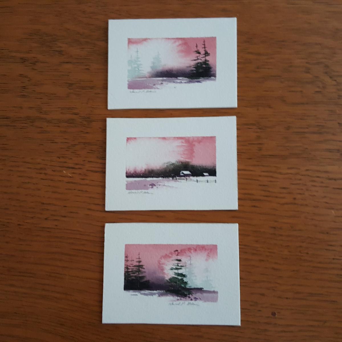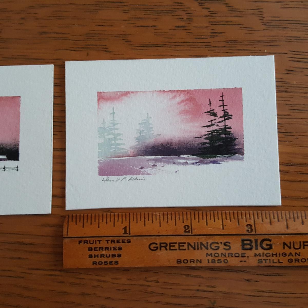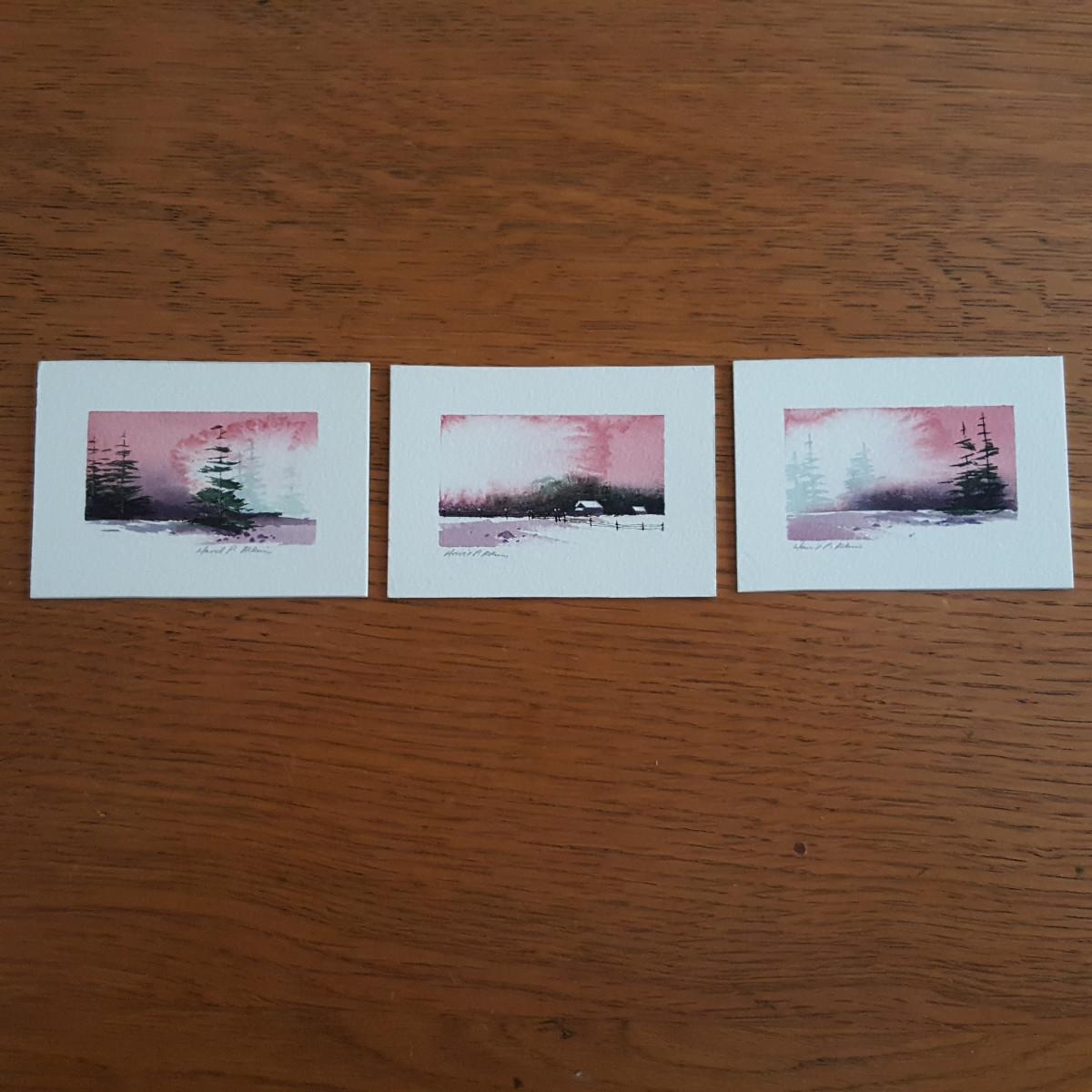 This auction lot is for a Triptych Watercolor Set of a Pink Winter Scene by David P. Atkins. The paintings are on heavy card stock, they measure about 3.5-inches long X 2.5-inches tall. Each of the 3 items in the triptych is pencil signed by DAVID P. ATKINS. Mr. Atkins of Mt. Orab, OH died on Tuesday, March 13, 2018 at the age of 66. He was a regionally known artist who was represented by Row House Gallery in Milford, OH. His work is sought by wise collectors.