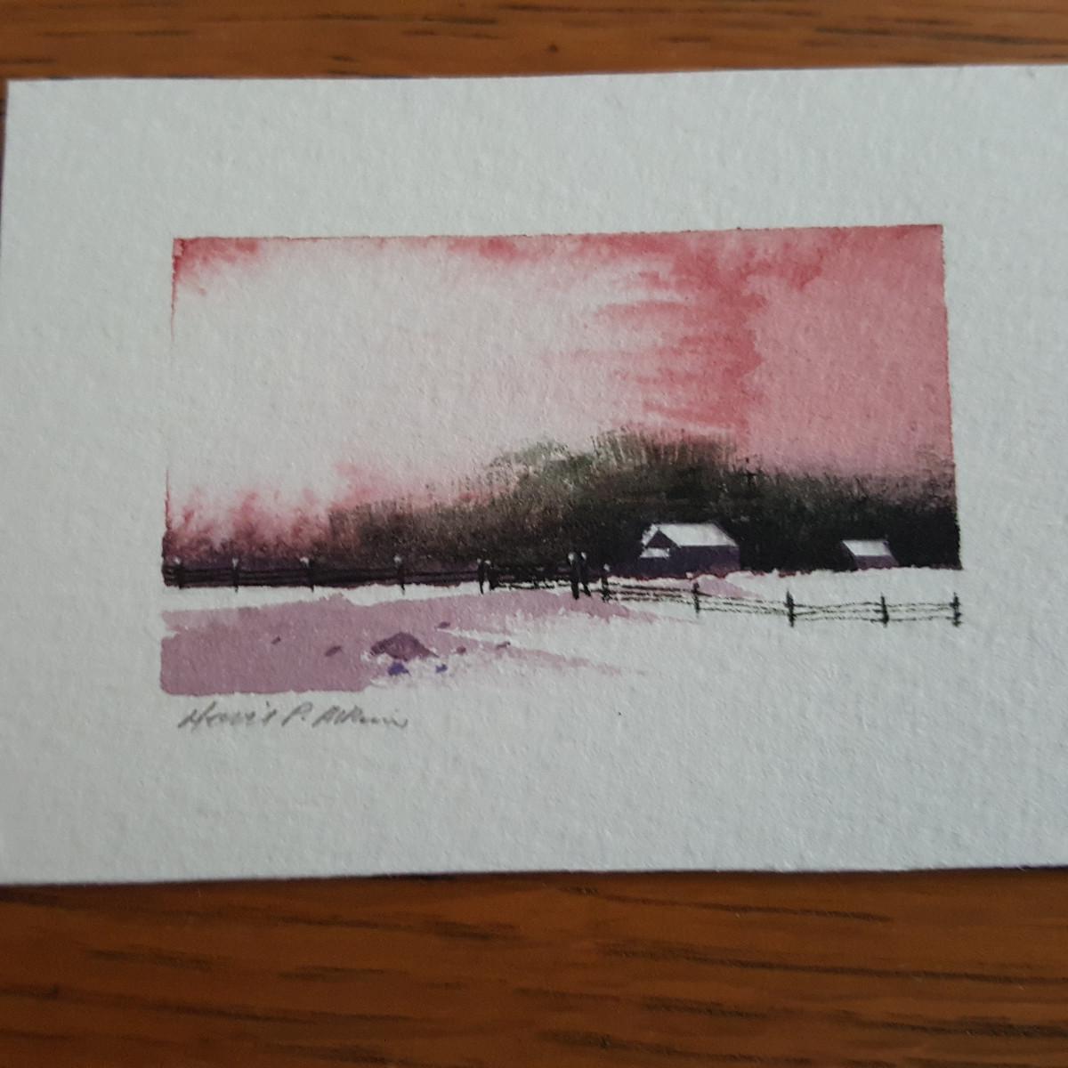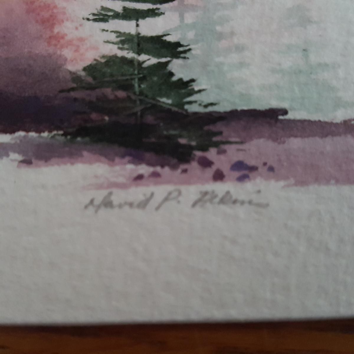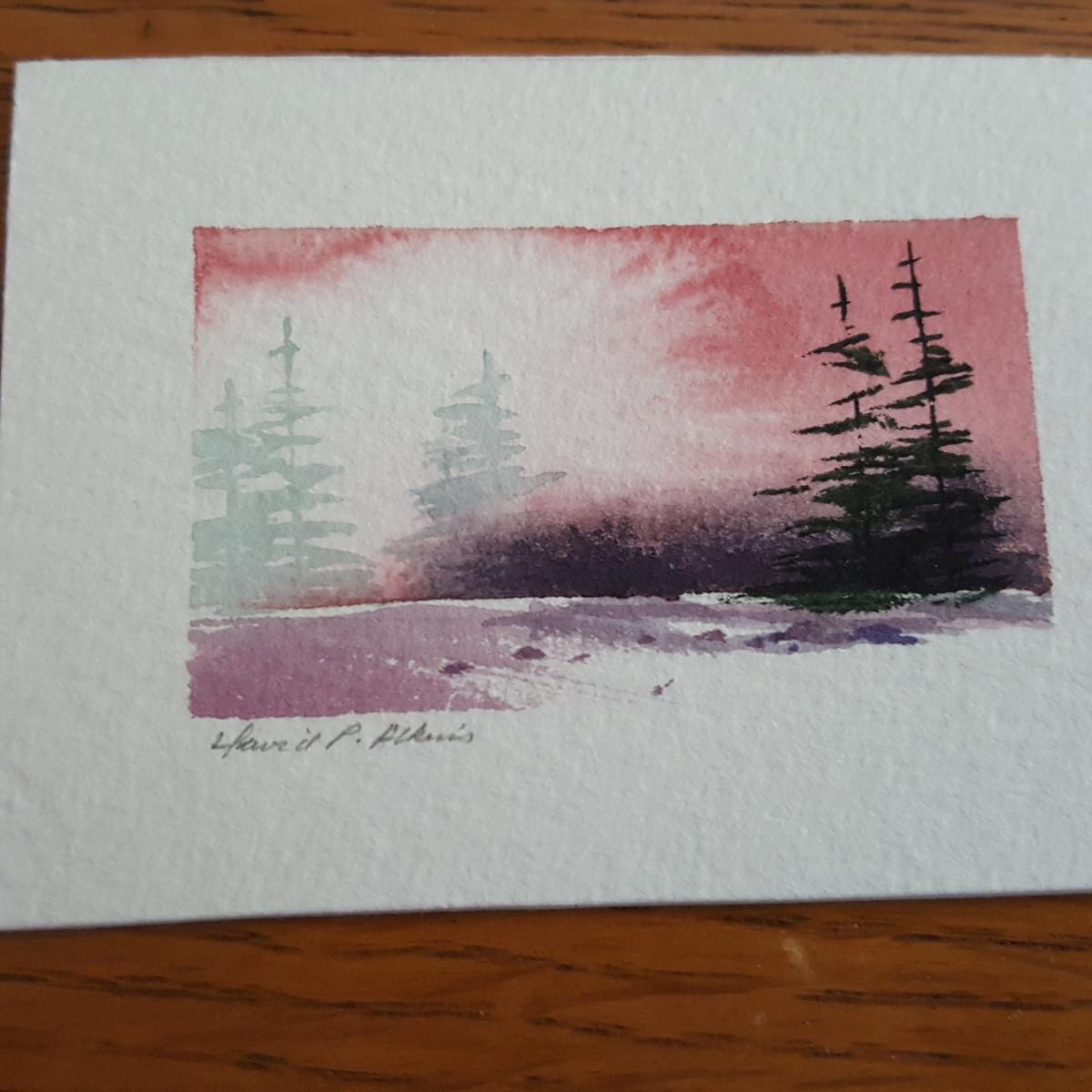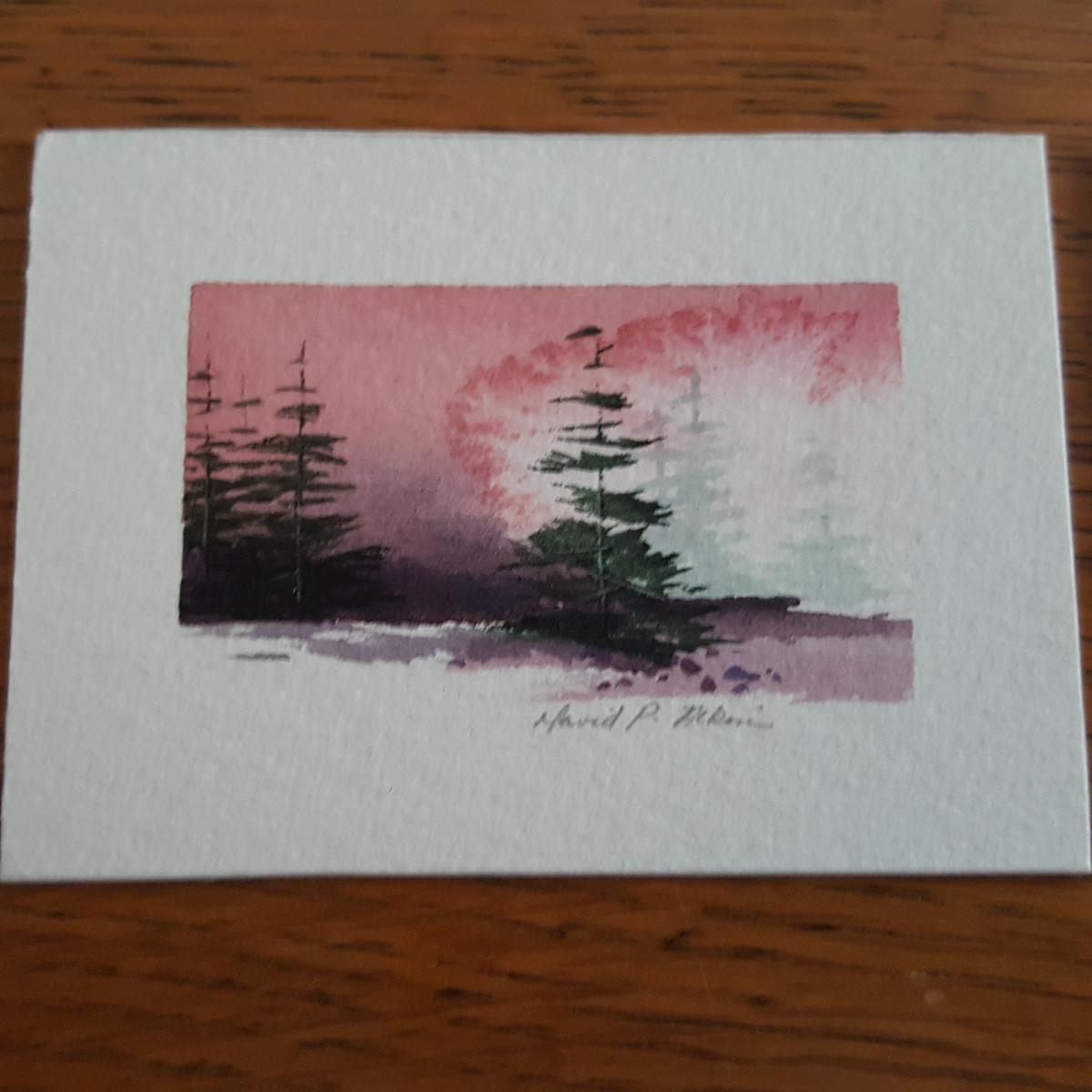 This auction lot is for a Triptych Watercolor Set of a Pink Winter Scene by David P. Atkins. The paintings are on heavy card stock, they measure about 3.5-inches long X 2.5-inches tall. Each of the 3 items in the triptych is pencil signed by DAVID P. ATKINS. Mr. Atkins of Mt. Orab, OH died on Tuesday, March 13, 2018 at the age of 66. He was a regionally known artist who was represented by Row House Gallery in Milford, OH. His work is sought by wise collectors.