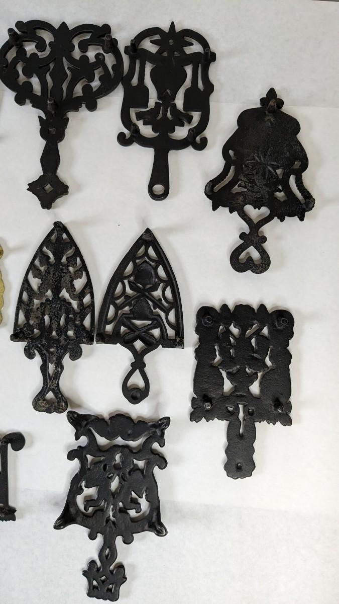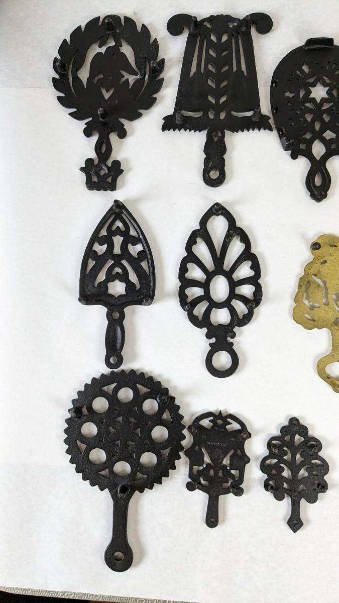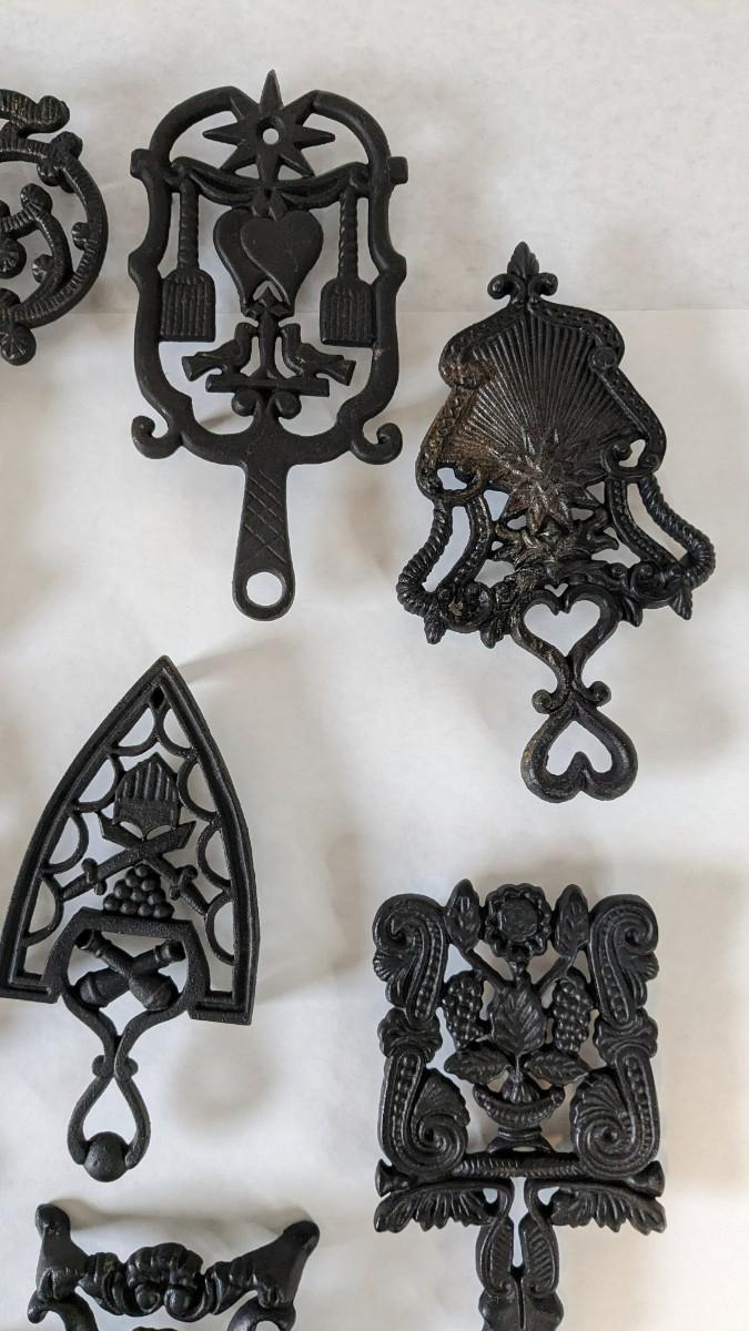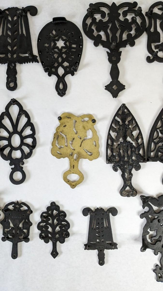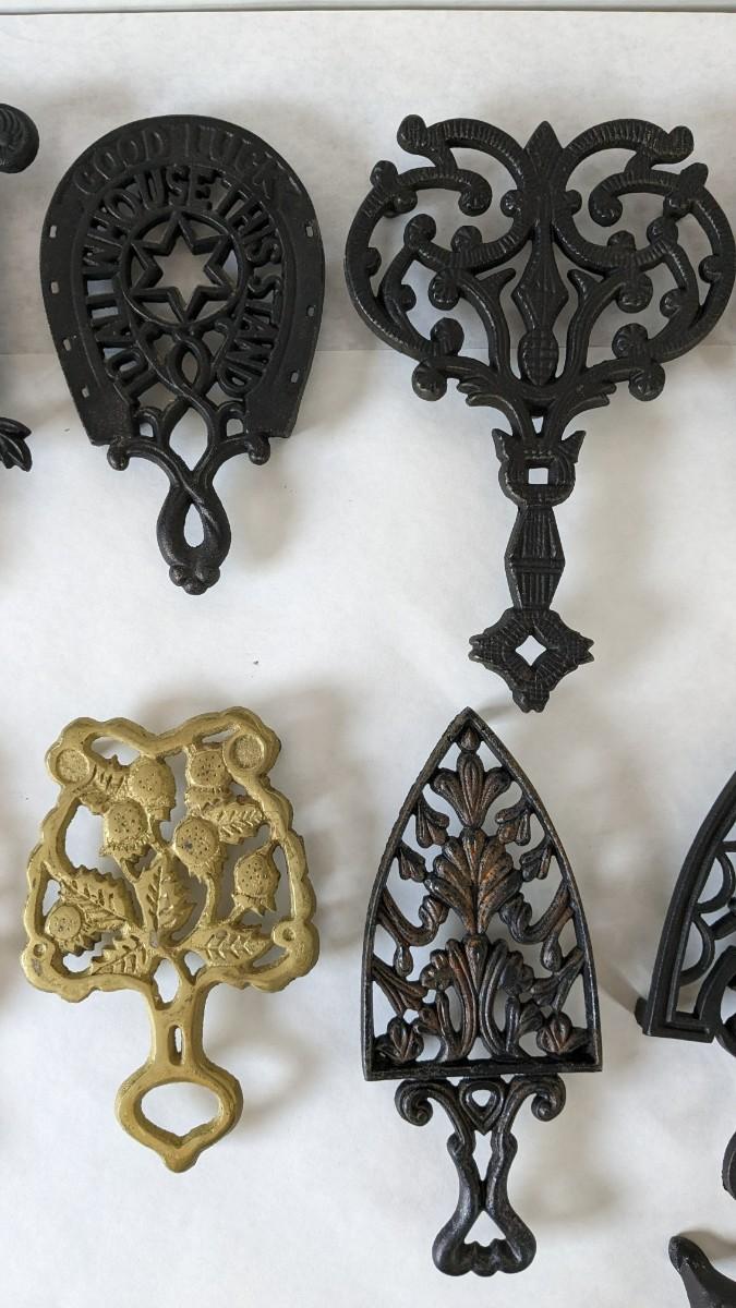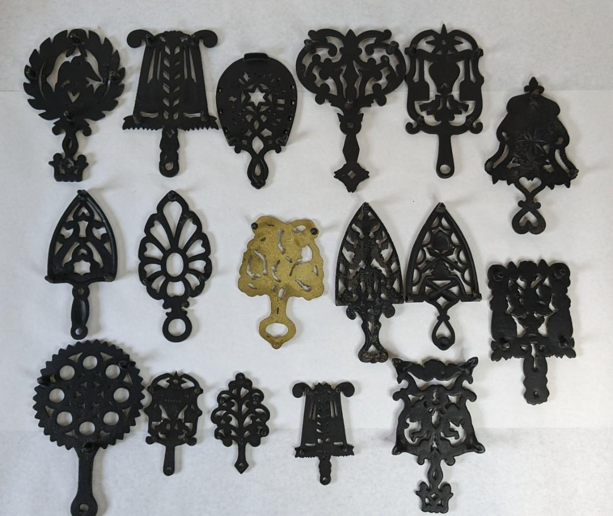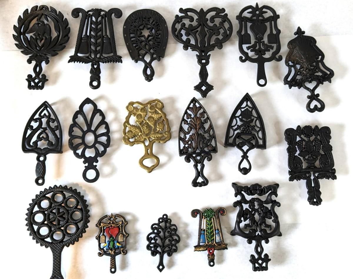 17 stunning and ALL different metal/iron trivets. 2 small hand painted pieces included as well as a lovely brass pieces. All show some level of patina but the majority is in overwhelmingly great shape for age. Notable wear shown in photos.