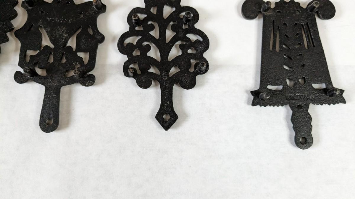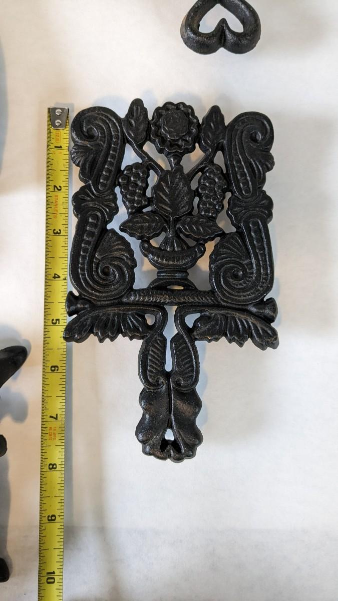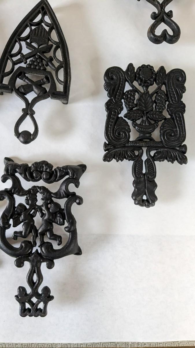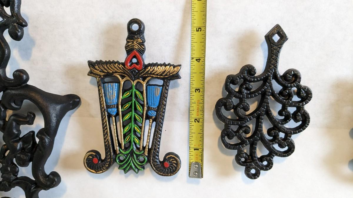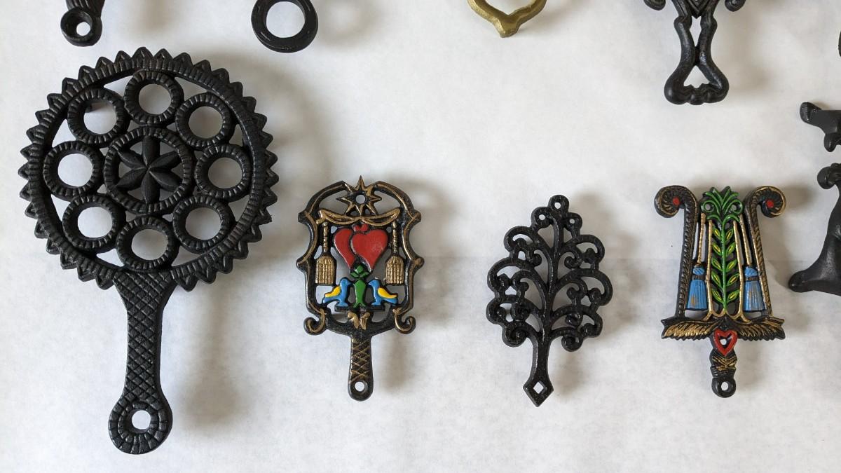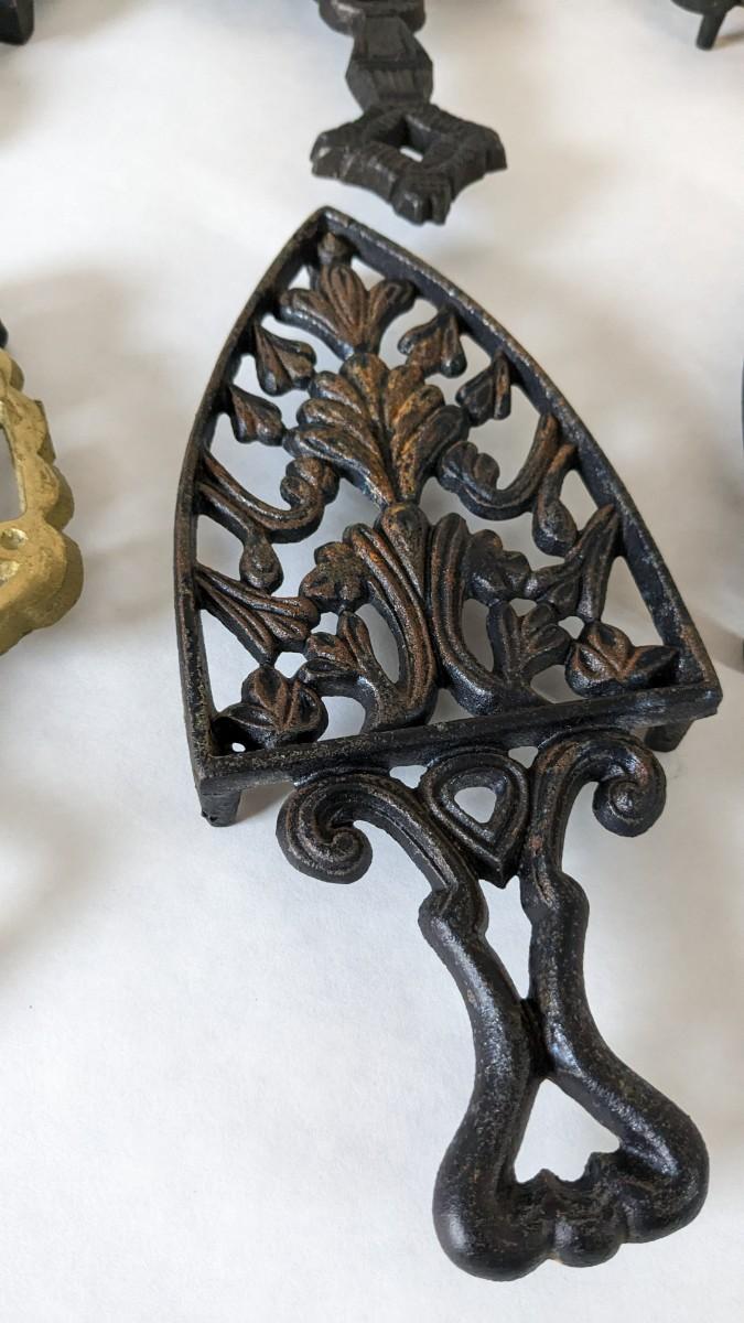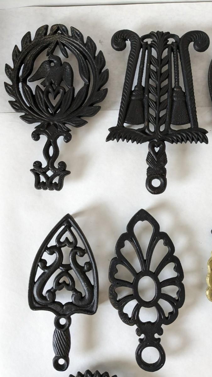 17 stunning and ALL different metal/iron trivets. 2 small hand painted pieces included as well as a lovely brass pieces. All show some level of patina but the majority is in overwhelmingly great shape for age. Notable wear shown in photos.