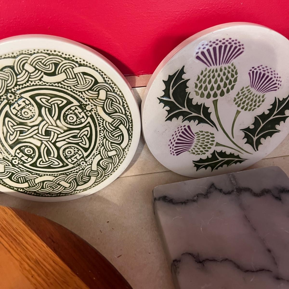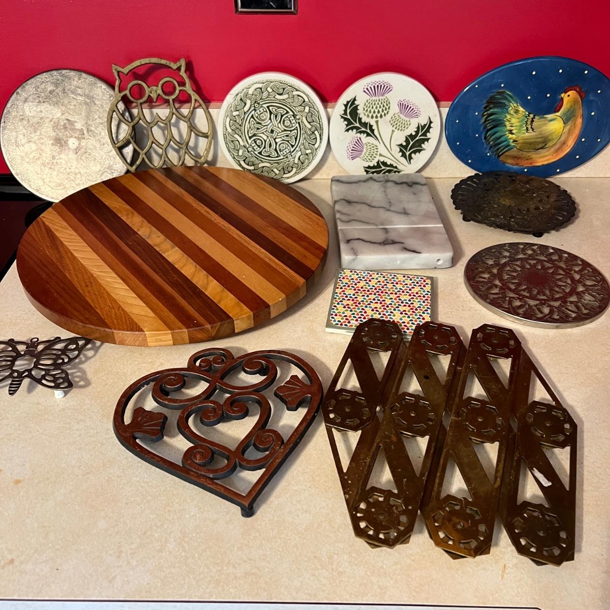 Mixed Trivet Lot - Scottish Ceramic, Wood, Silver Plated