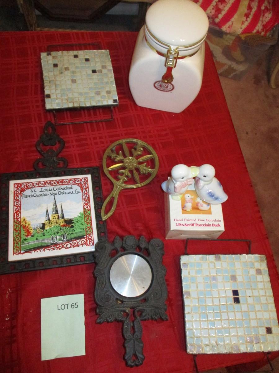 Various trivets. porcelain ducks. 1 Coffee Canister