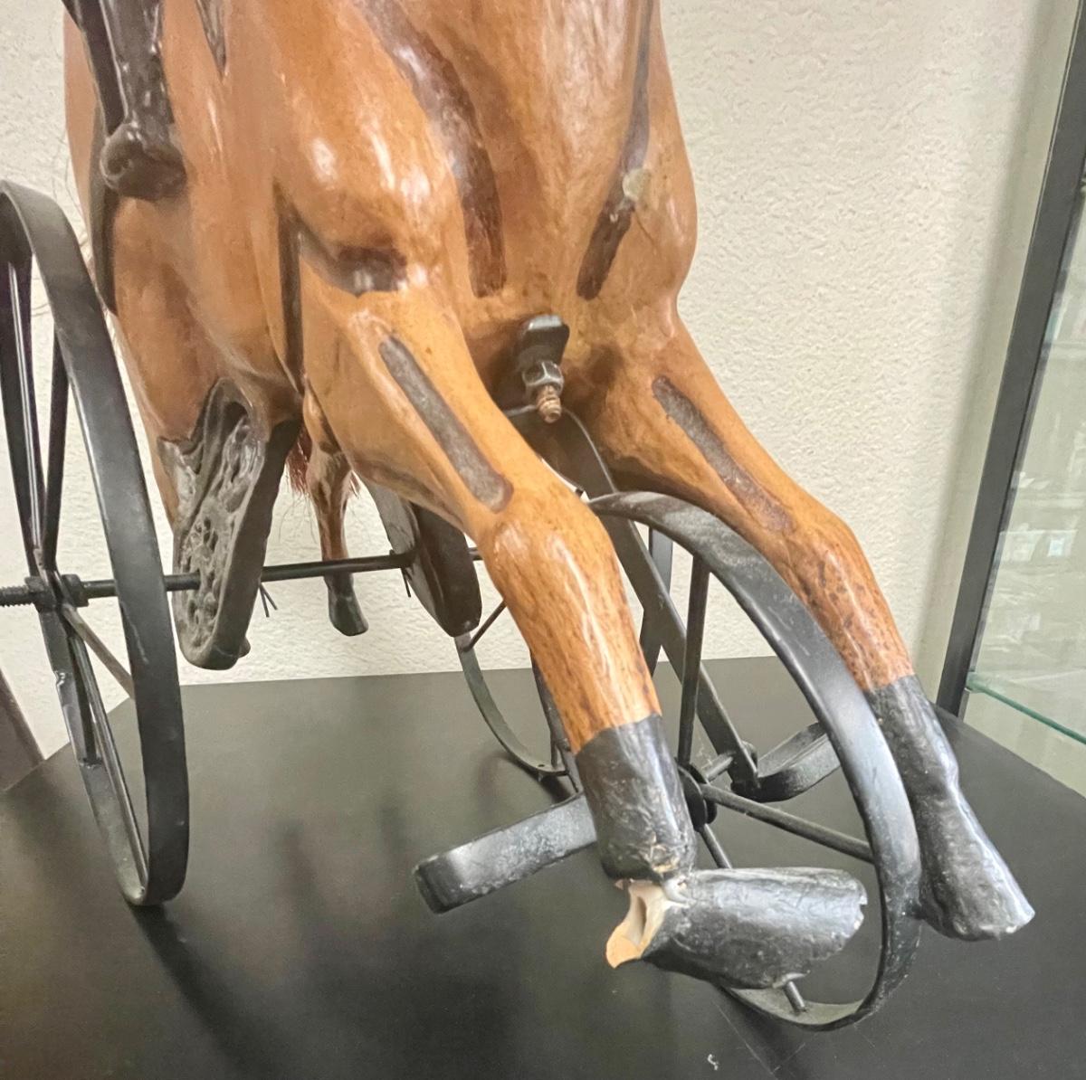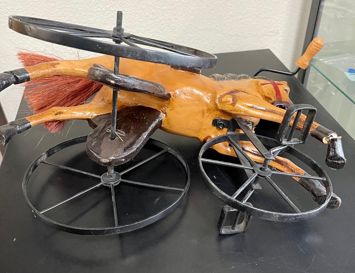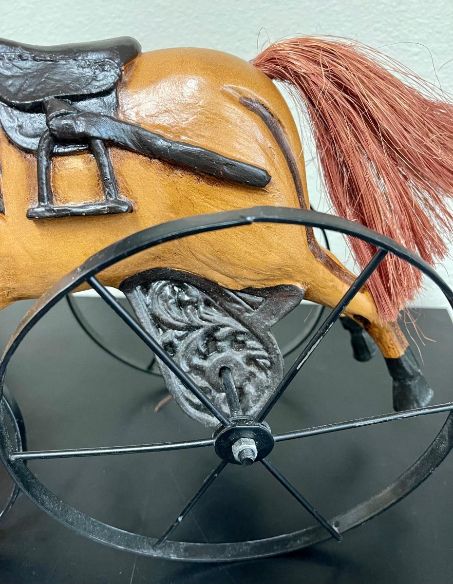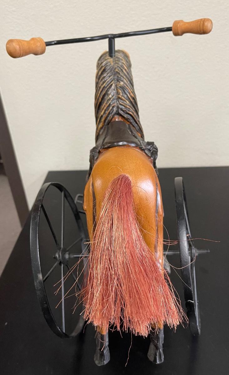 Vintage horse toy tricycle with 3 wheels. Approx. 15" tall. Has damage to the right front hoof, see photos for details.