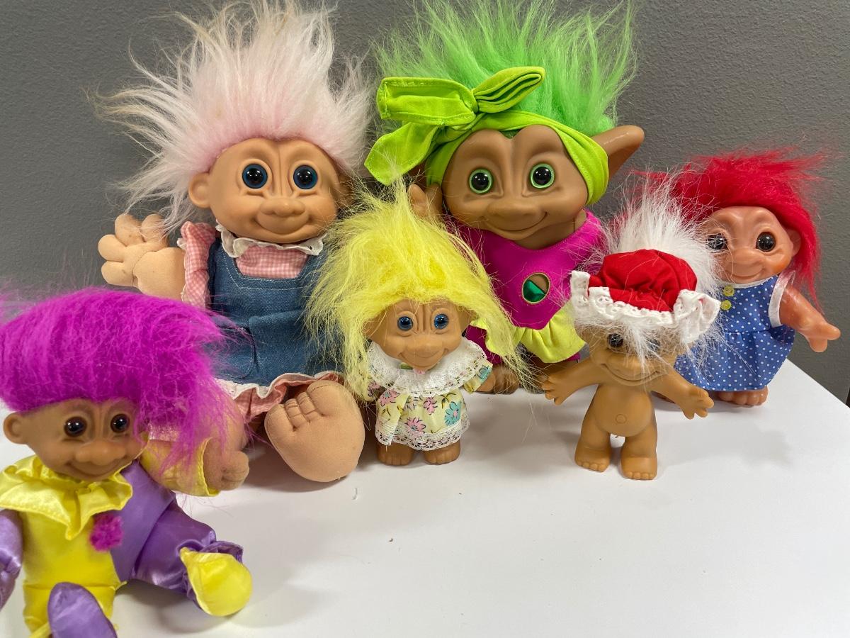 1 soft body troll, 1 large plastic body doll and 4 smaller trolls