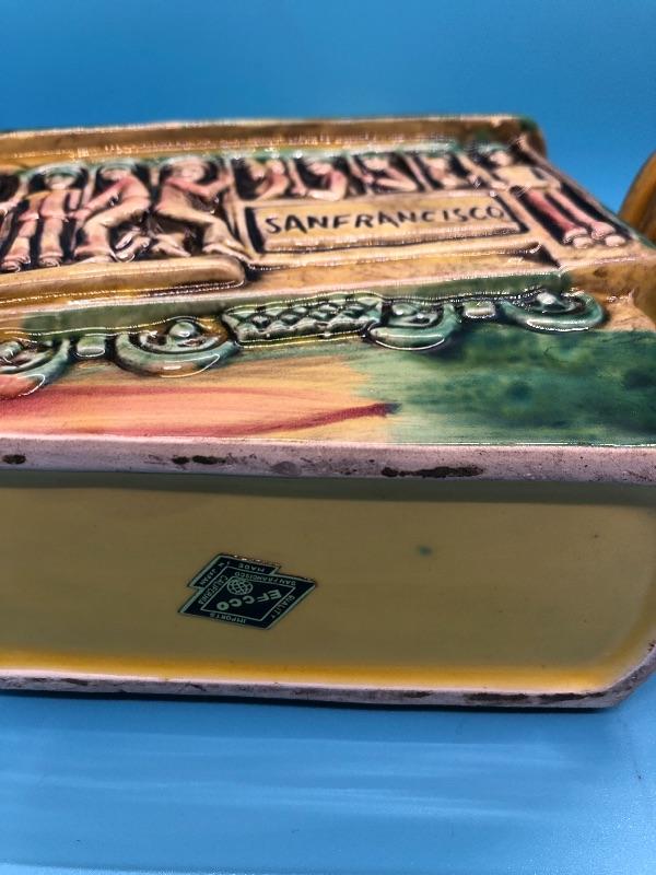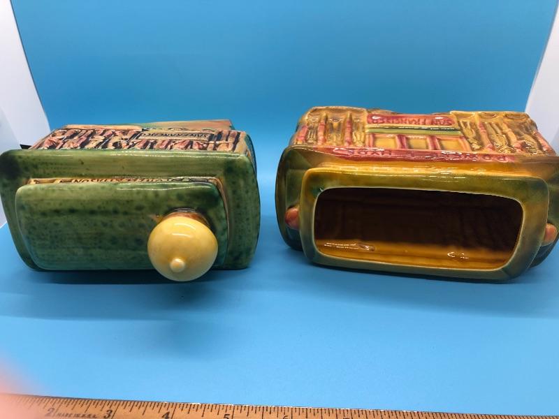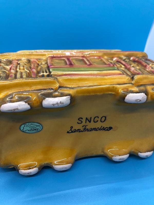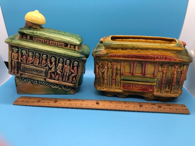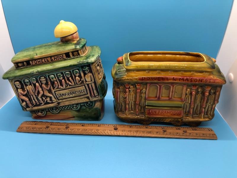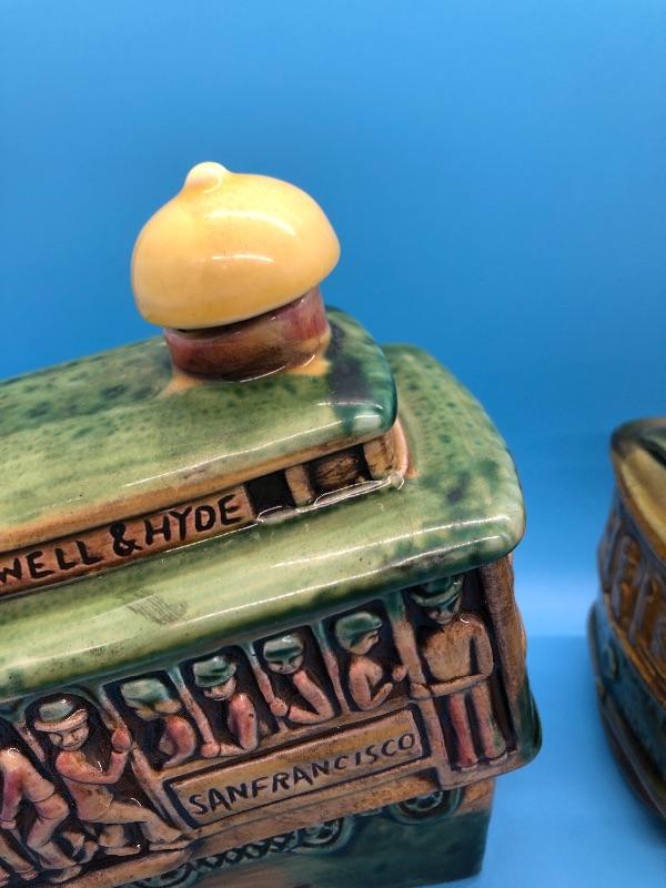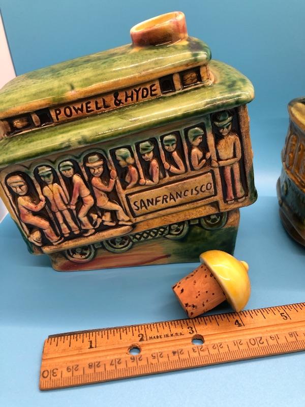 Vintage San Francisco trolley car souvenirs. One is a cork top decanter, the other is a planter. Both are ceramic is great vintage condition.