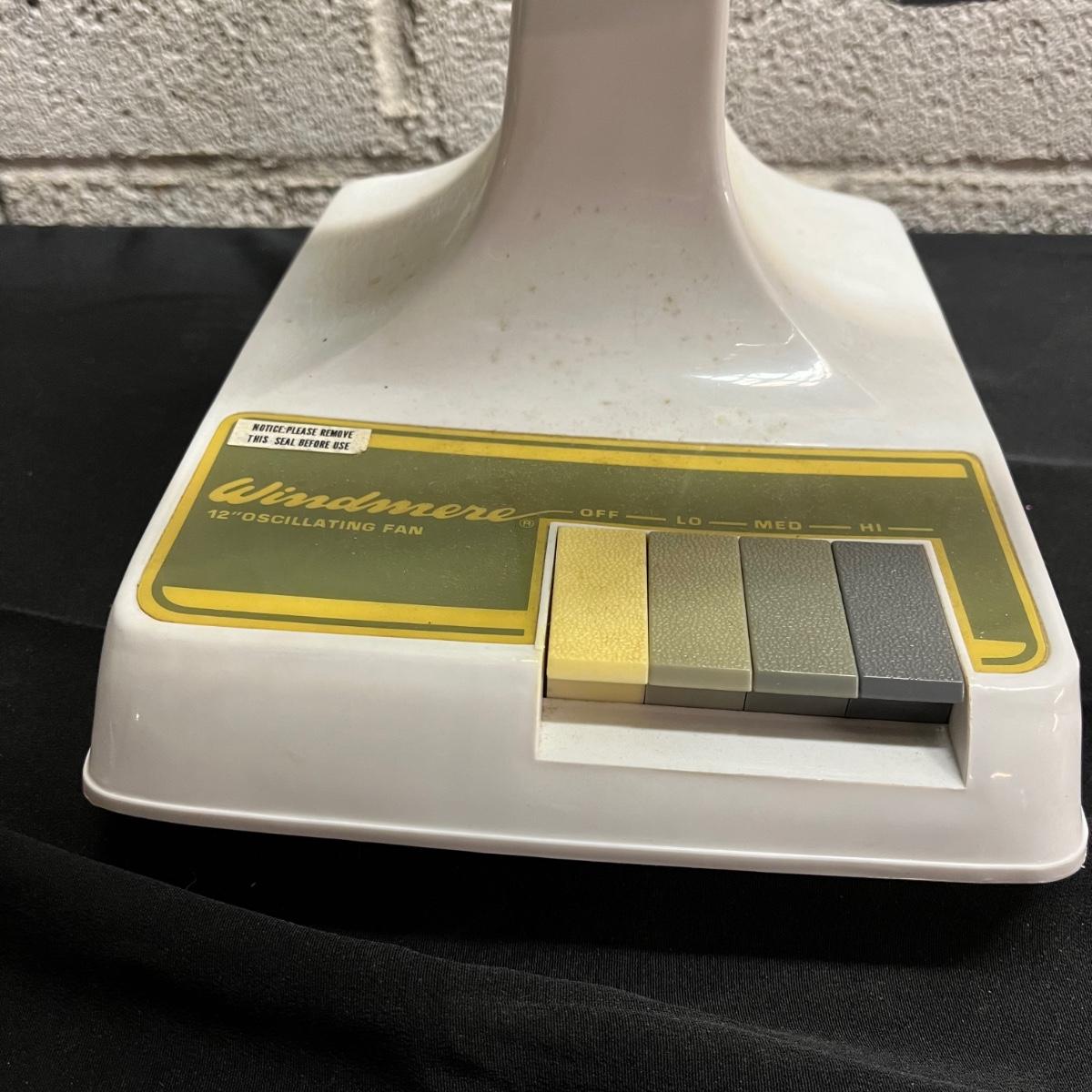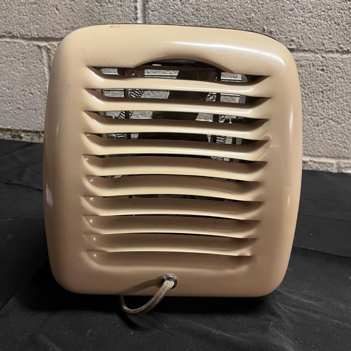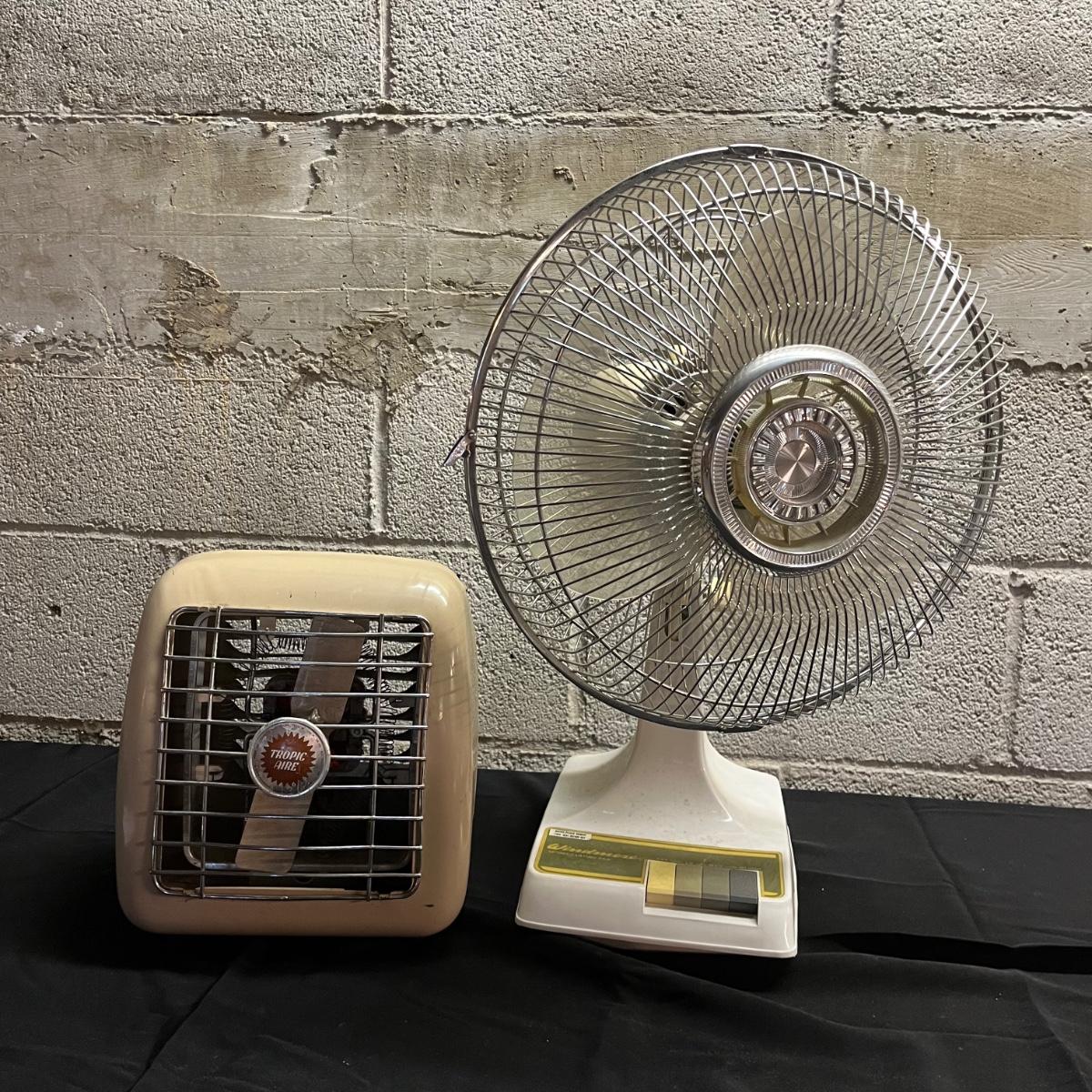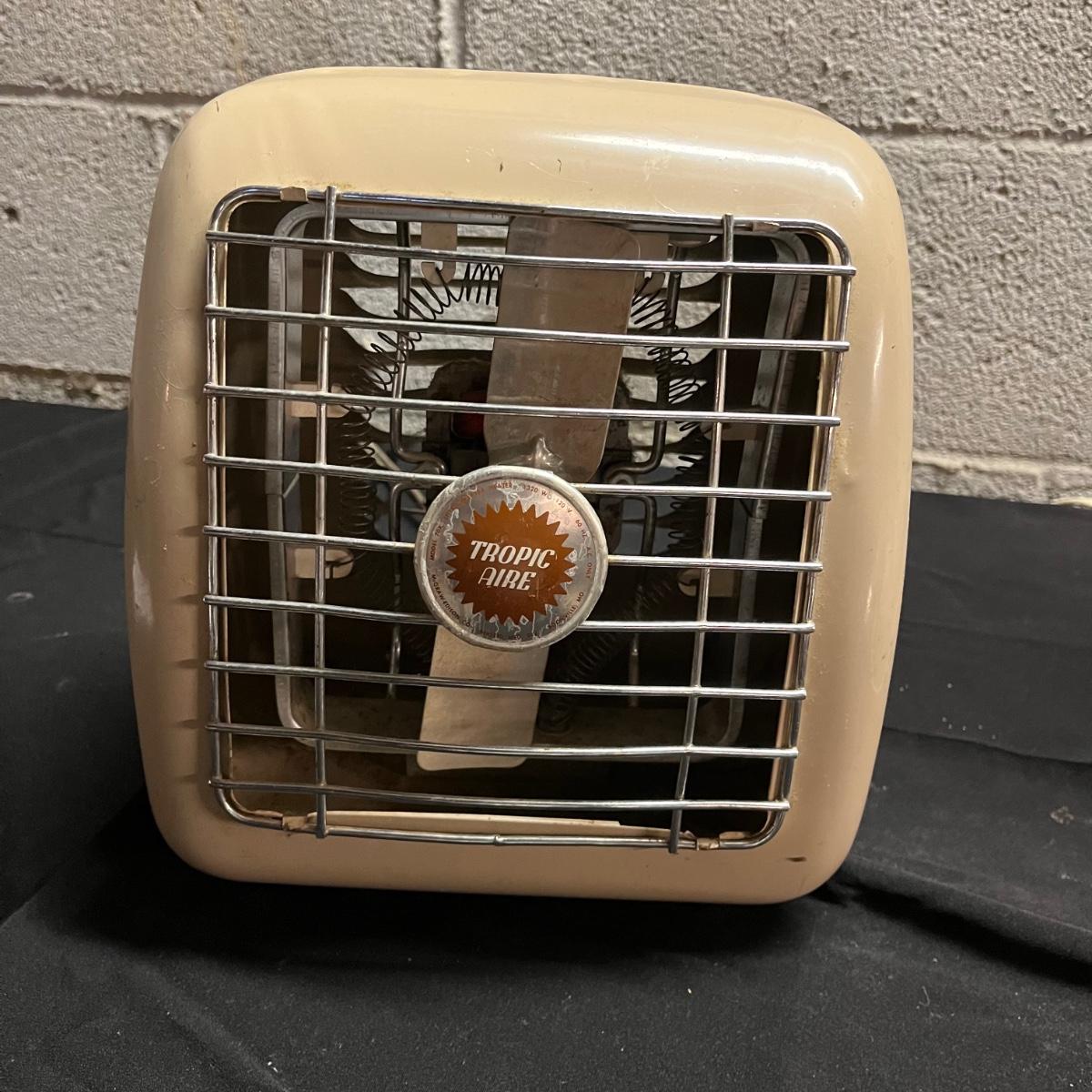 Lot includes a vintage Tropic Aire electric heater that powered on when tested. Also includes a Windmere 12” oscillating fan that worked when tested. Heater measures 7” x 9” x 10”.