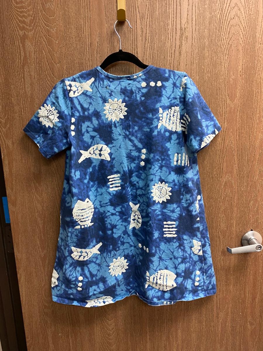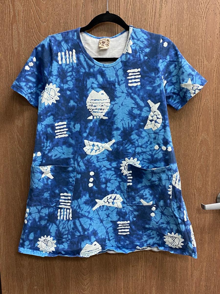 Tiedyed blue loungewear coverup with fish on it. Double front pockets. Size tag is worn out. Might be a one size fits most, no bigger than large though.
