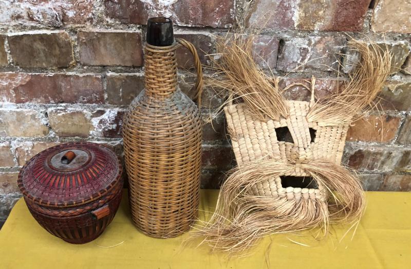 A basket..a woven cane rum bottle protector and a wicker mask...Tropical theme...