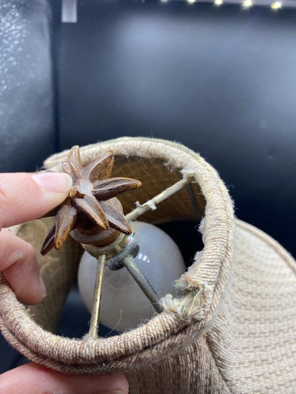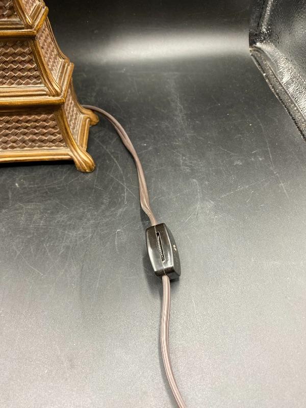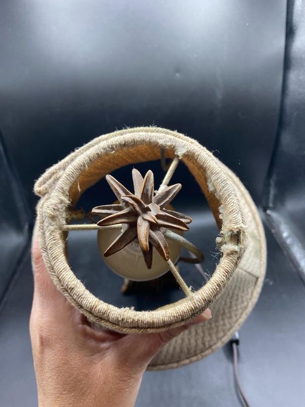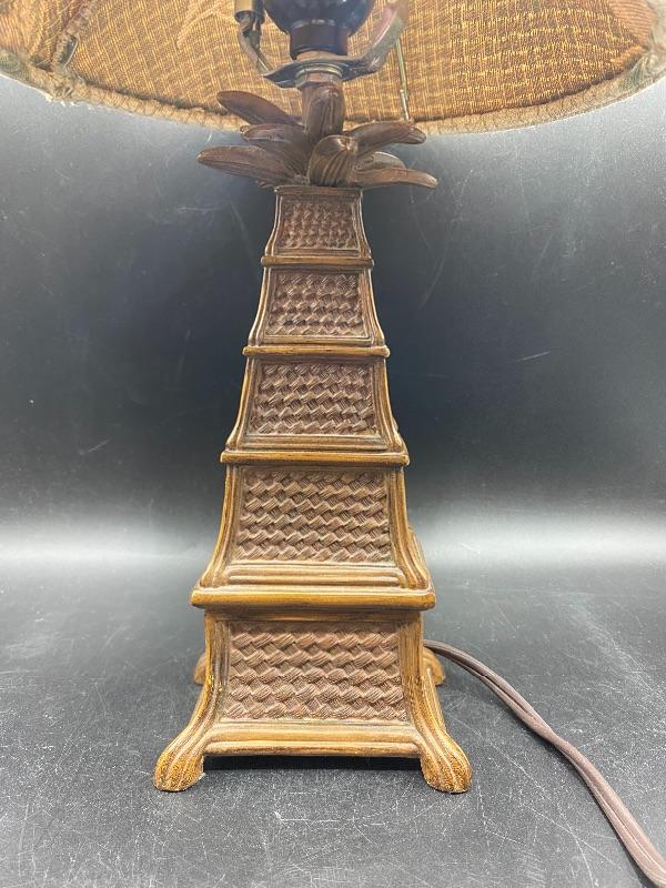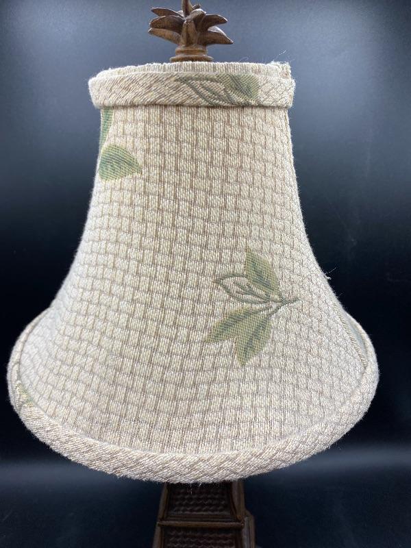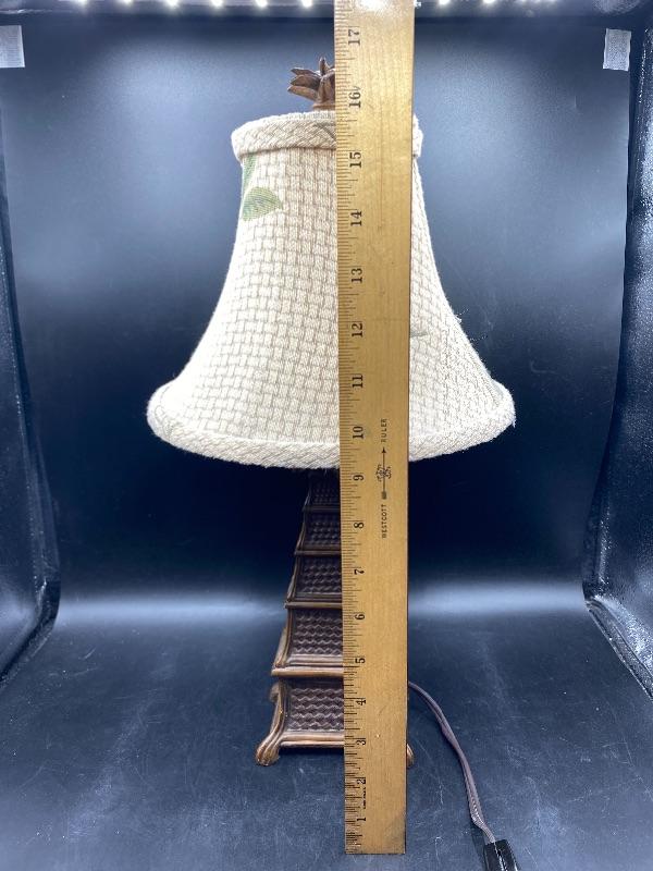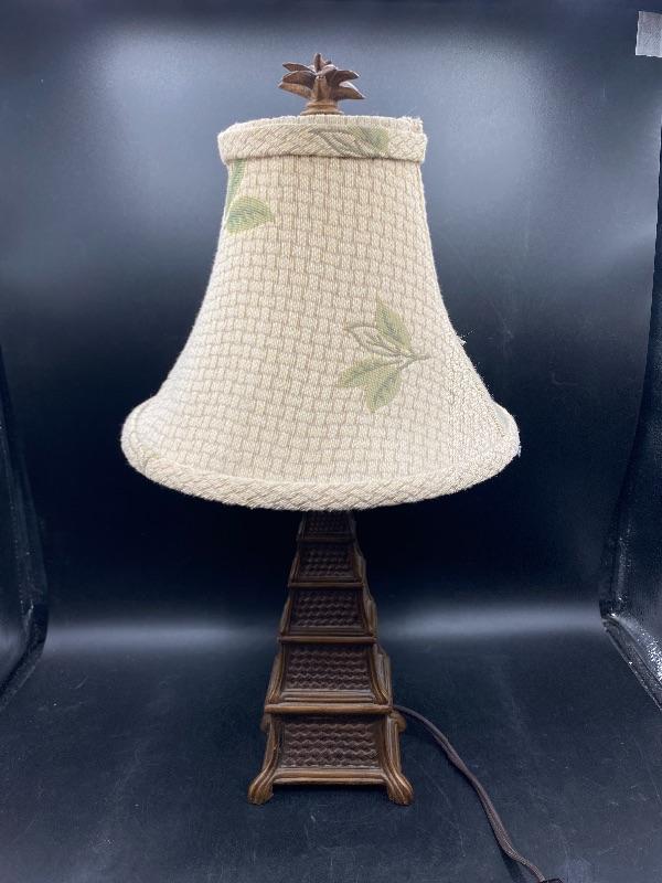 Small tropical style table lamp. Faux basket weave base with a pineapple palm tree top & finial. Beige lamp shade with green leaves. There is a broken piece on the finial. Stands almost 18" tall. Shade is dusty from use. On/off switch on cord.