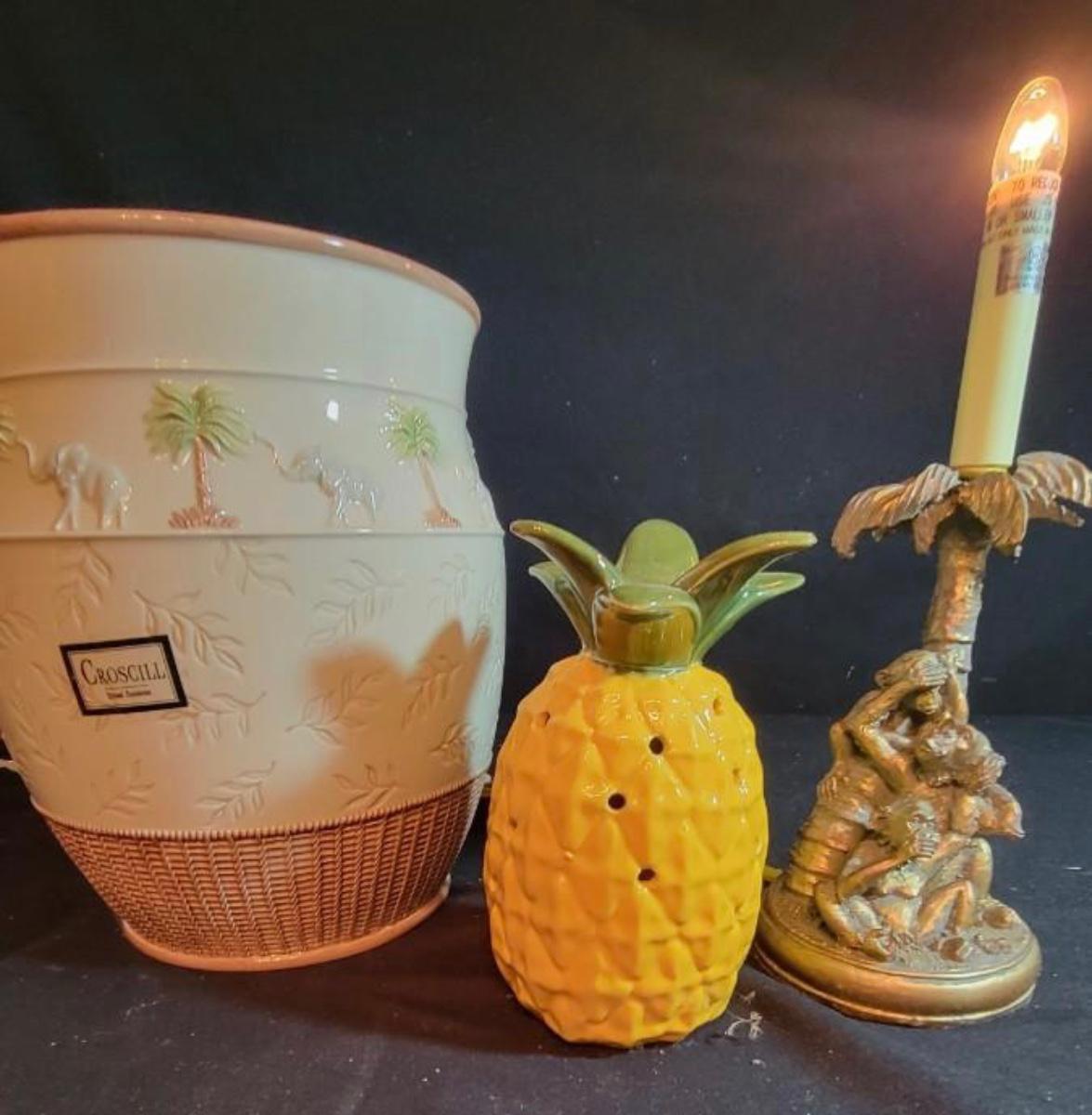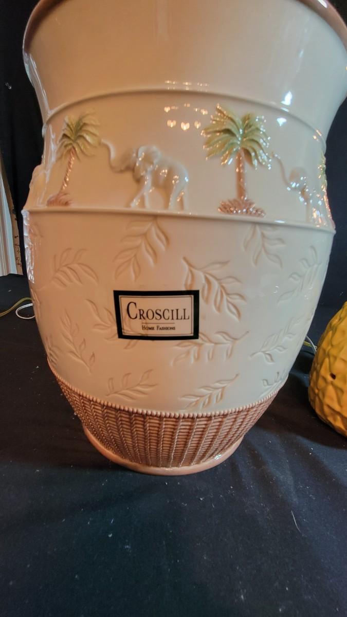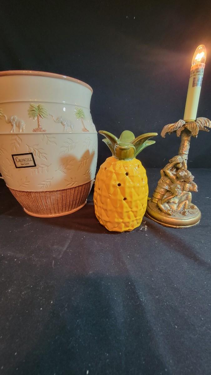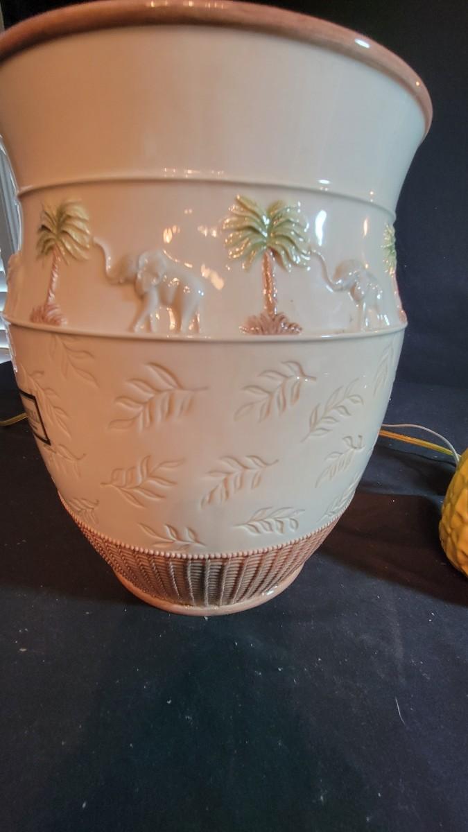 Ceramic pot with elephant and palms and a base with a wicker pattern. Measures approximately 10" x 10". Plug in ceramic pineapple lamp, new with tag still attached. Table lamp with monkeys and palm, no shade. Lamp appears to be a resin mold with antique gold finish. Both lamps work. Shipping available