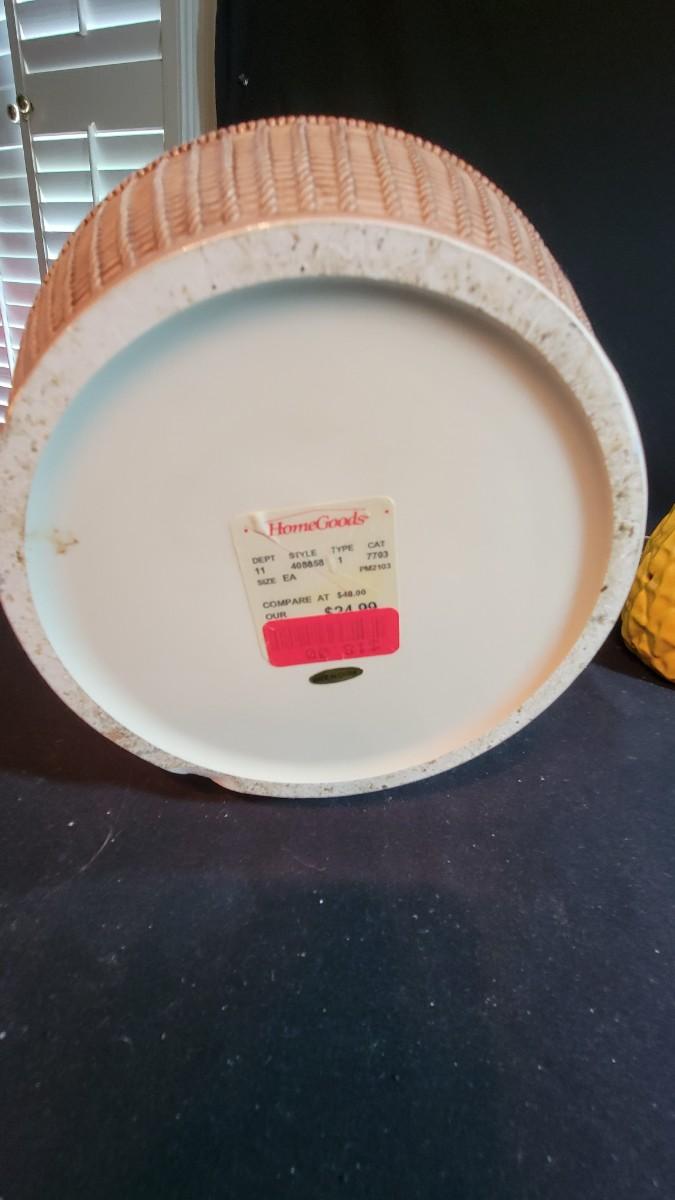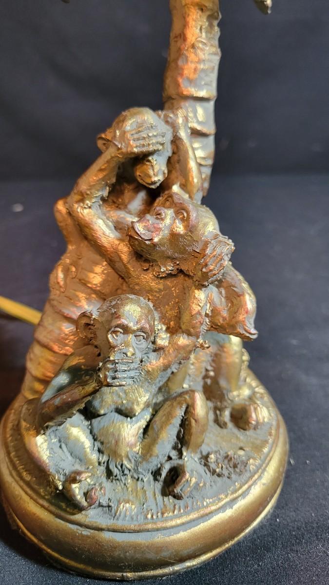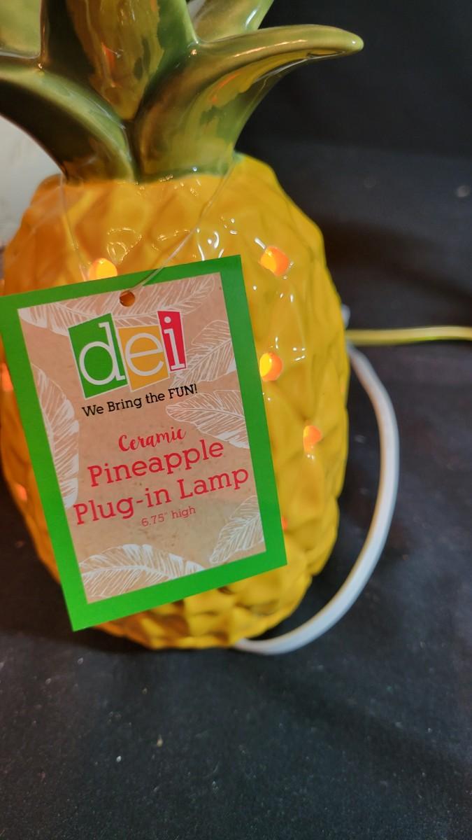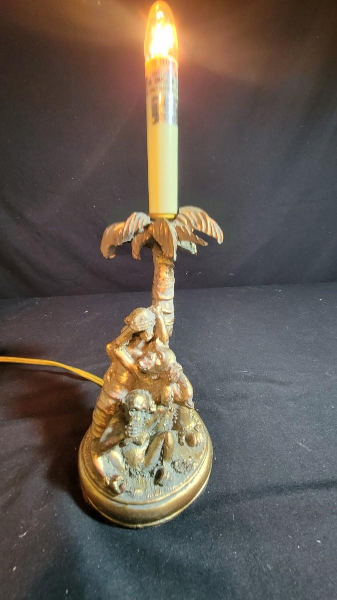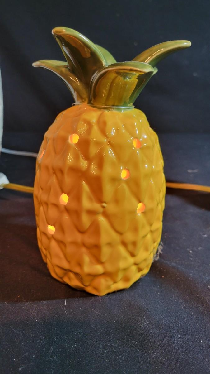Ceramic pot with elephant and palms and a base with a wicker pattern. Measures approximately 10" x 10". Plug in ceramic pineapple lamp, new with tag still attached. Table lamp with monkeys and palm, no shade. Lamp appears to be a resin mold with antique gold finish. Both lamps work. Shipping available