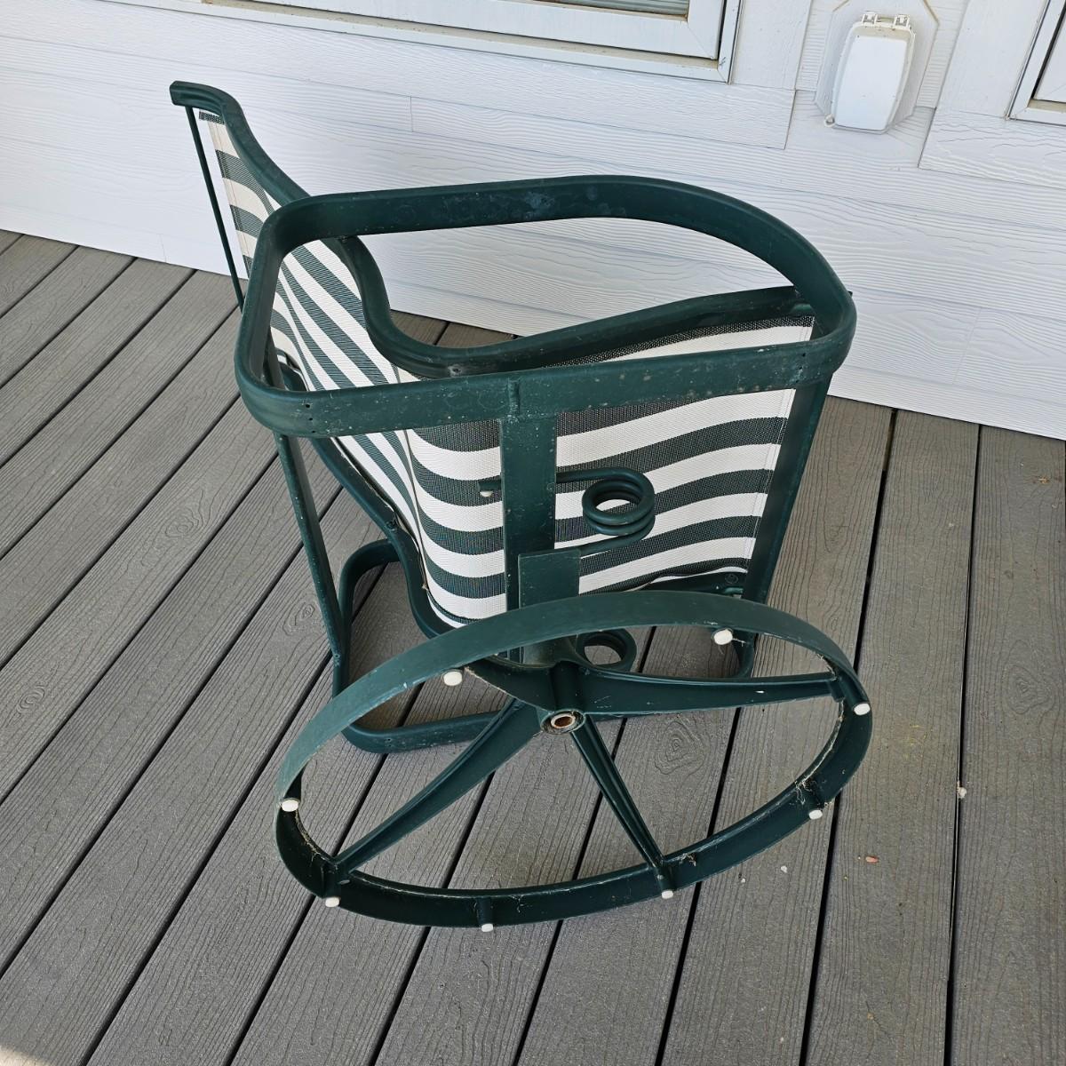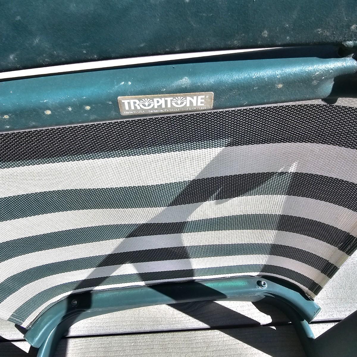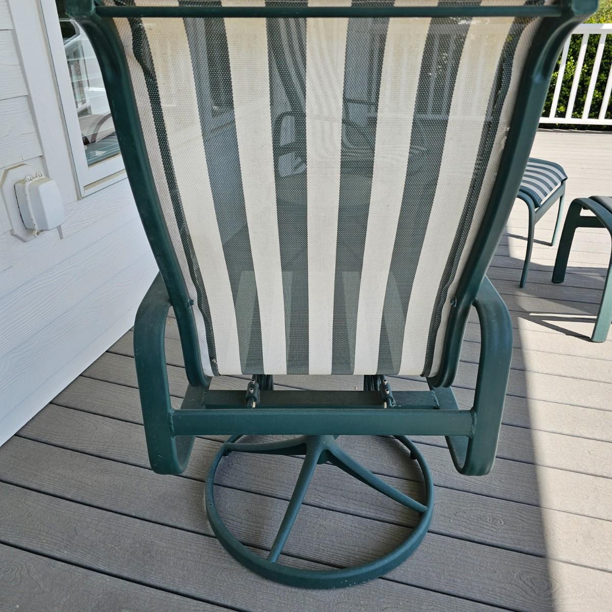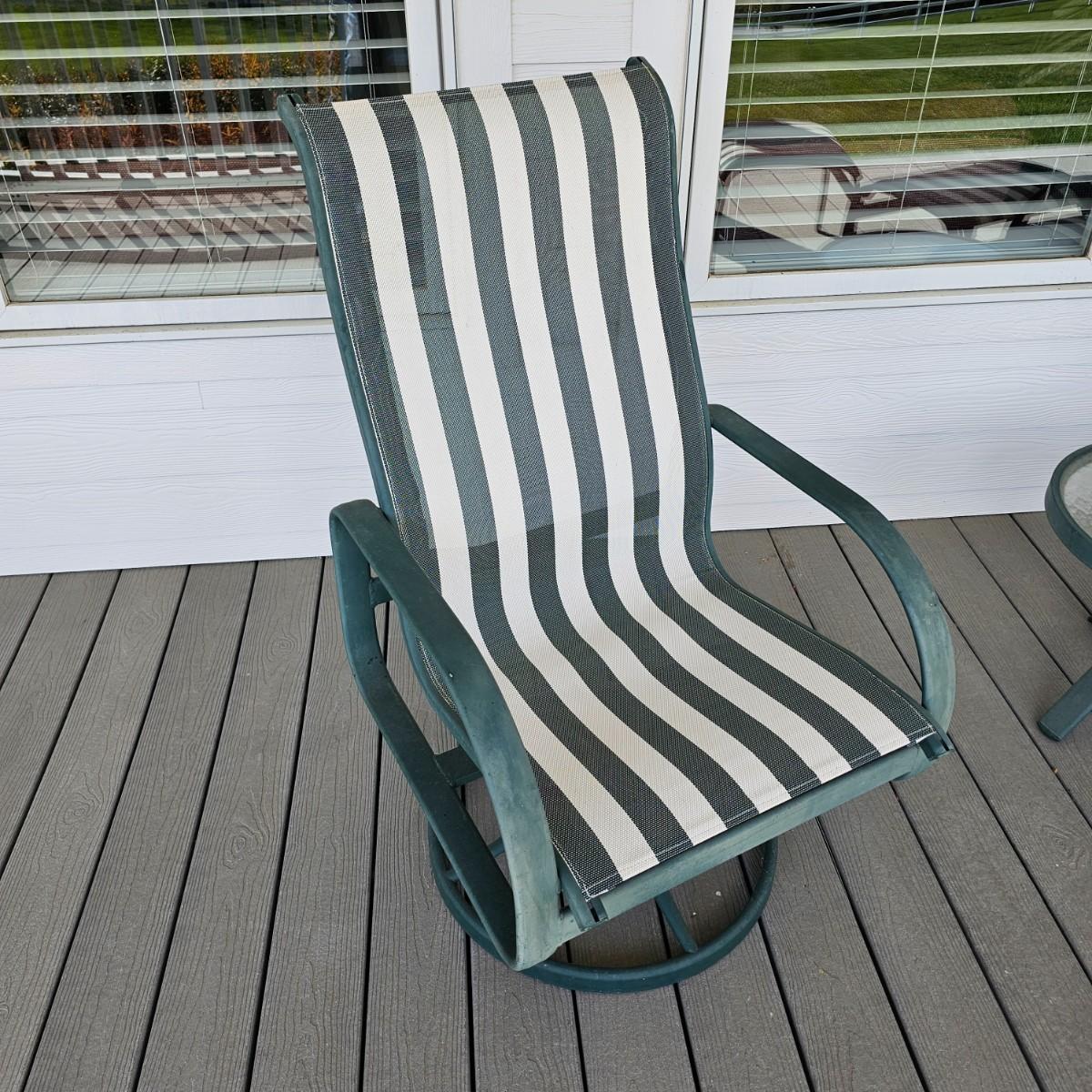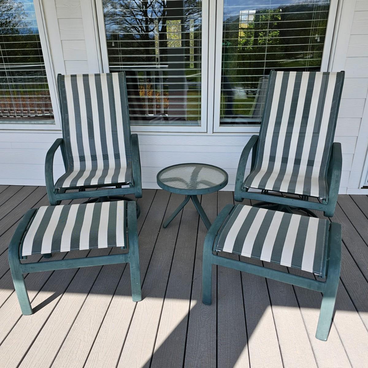 Pair of Tropitone brand patio rockers, two foot stools and a small table. Rockers have green/white mesh seats and backs, footstools have same covering. Rockers are 28" x 24.5" x 42"H, seat height 17. Footstool are 20" x 24.5" x 16"H. Small table is 20.5"D and 16"H. Rockers have double spring action. See photos for details. Local pickup only.