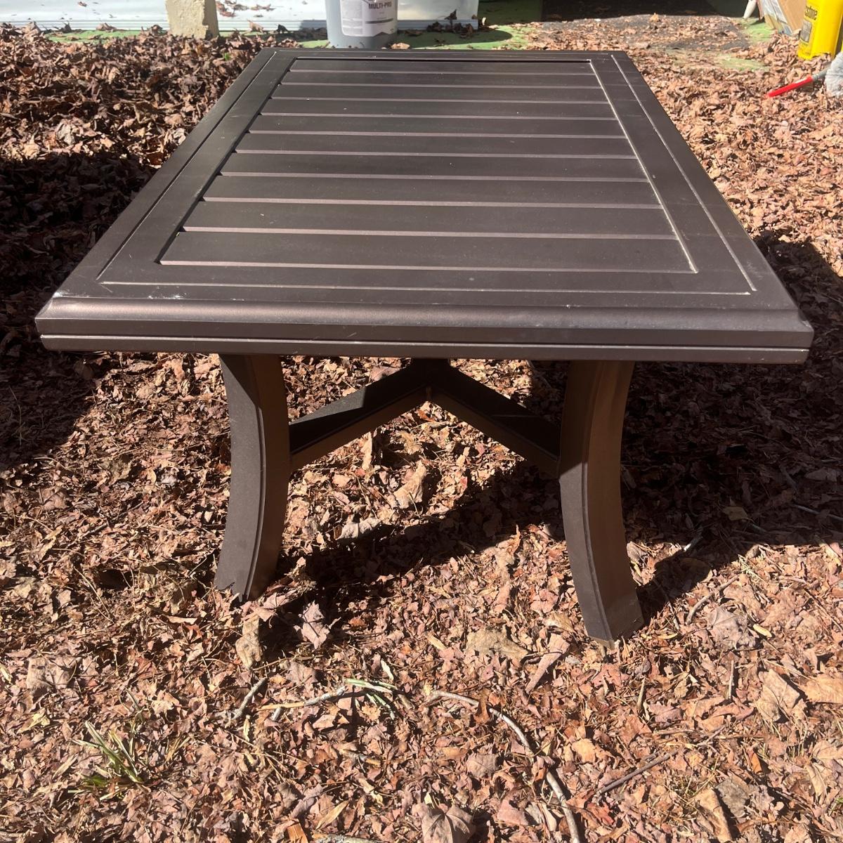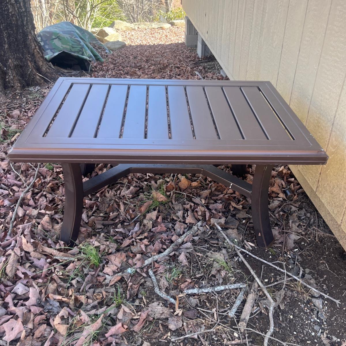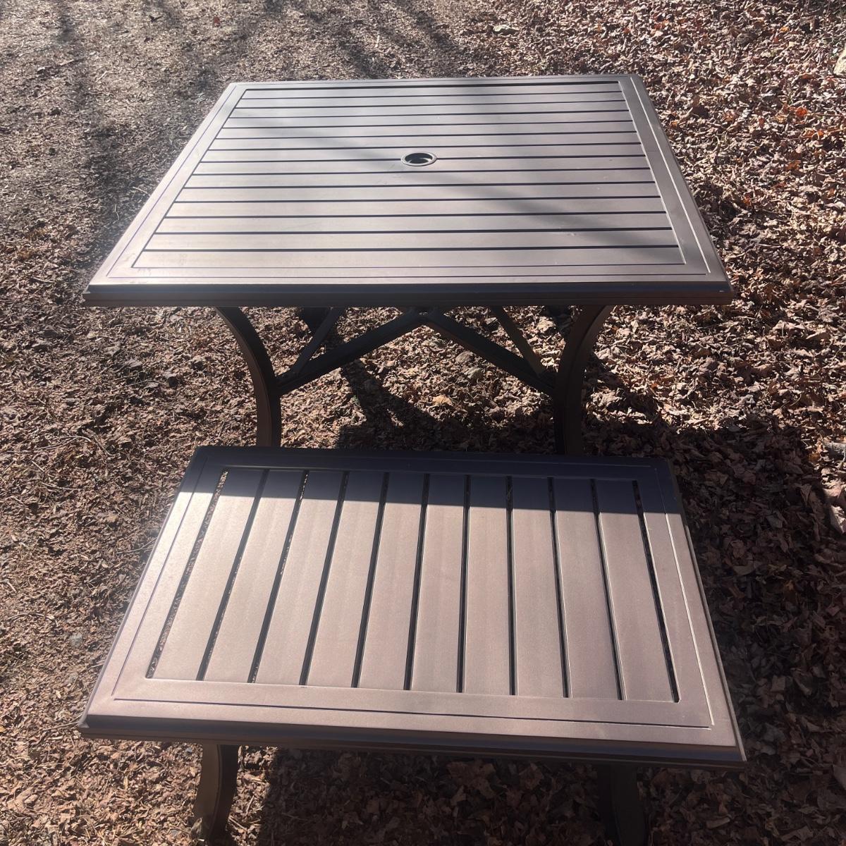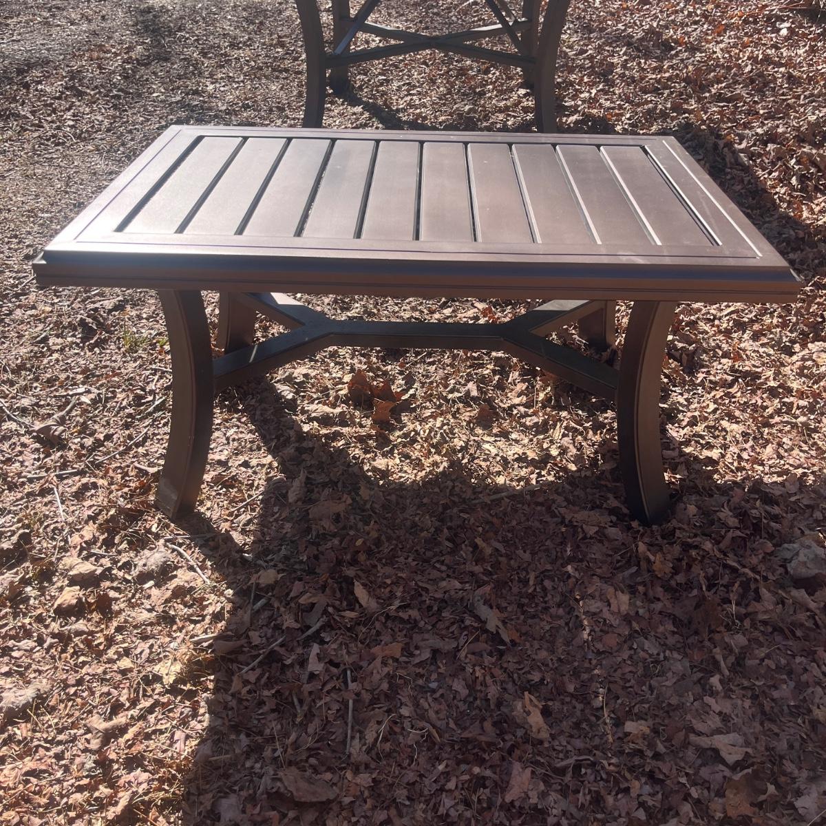 Lot includes two Tropitone aluminum bronze colored patio tables. Largest table measures 48” x 48” x 29”H.