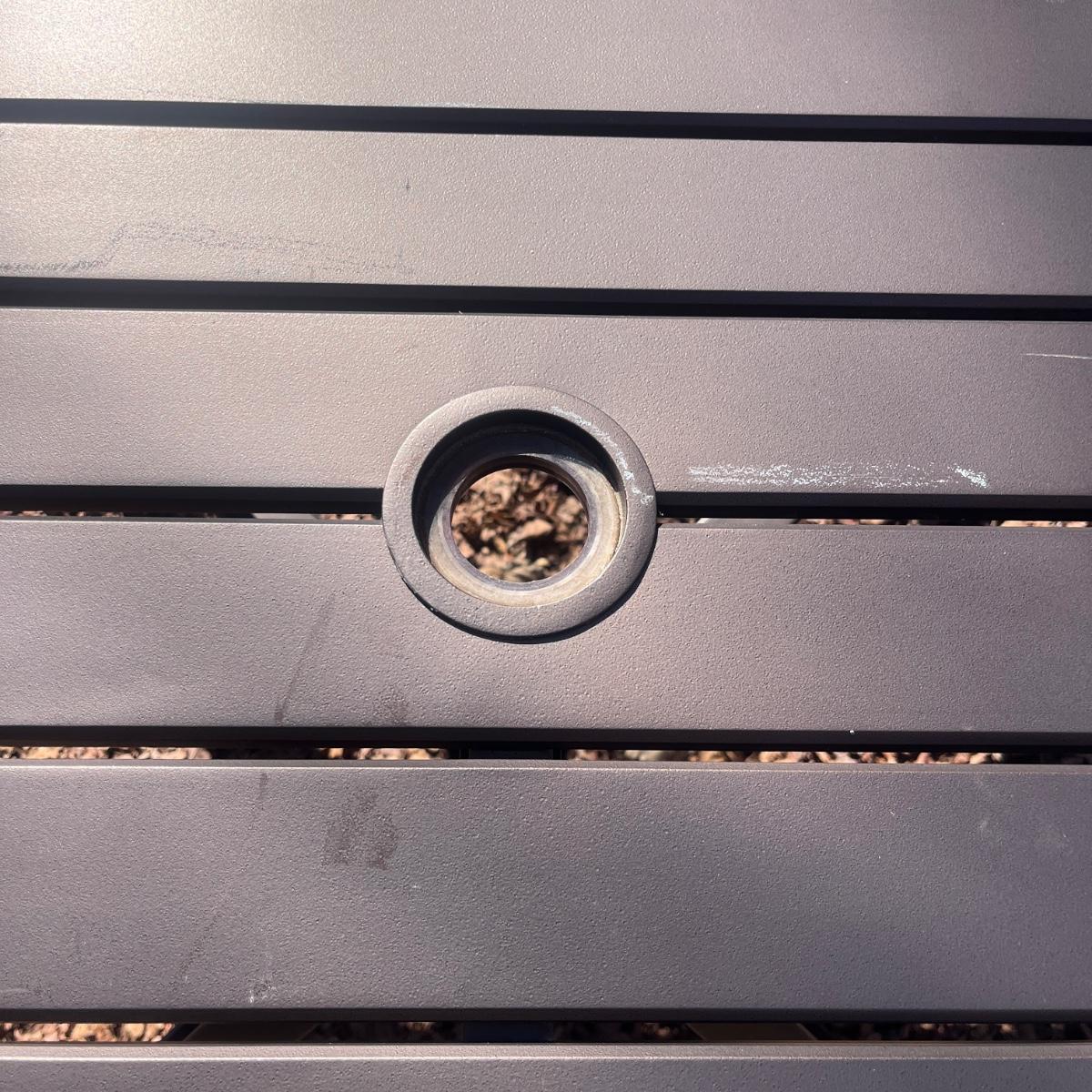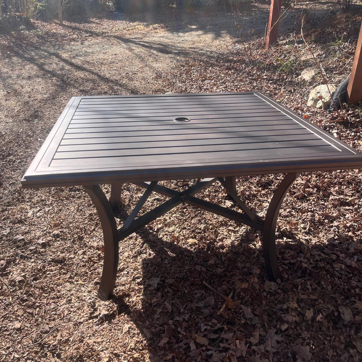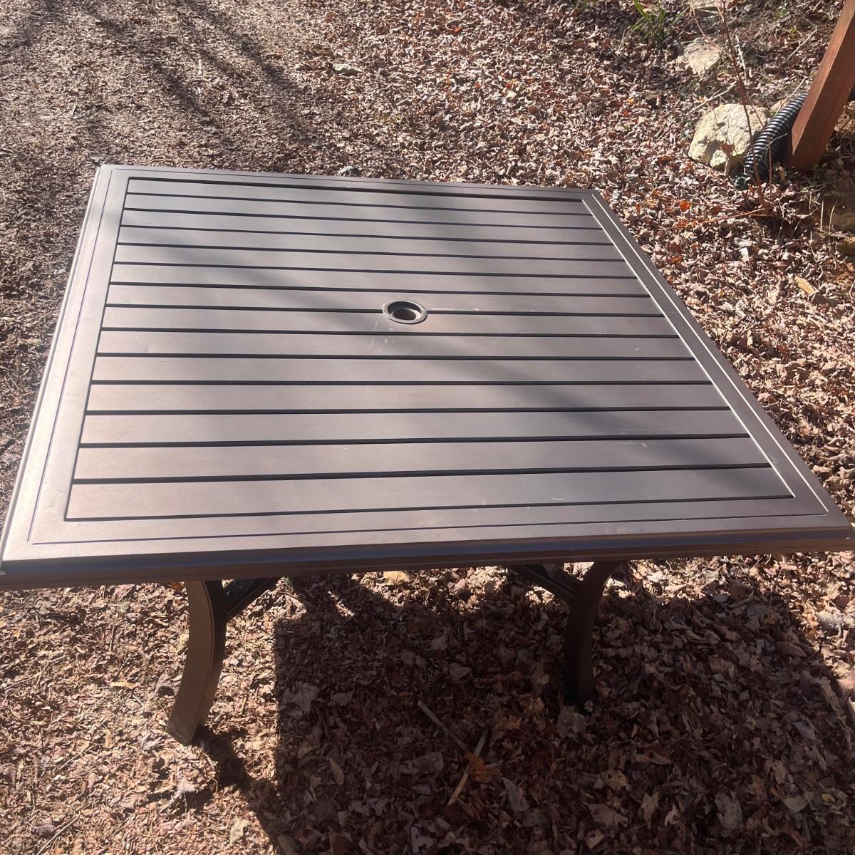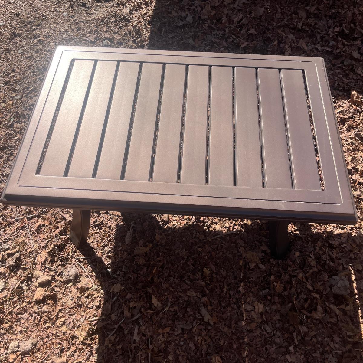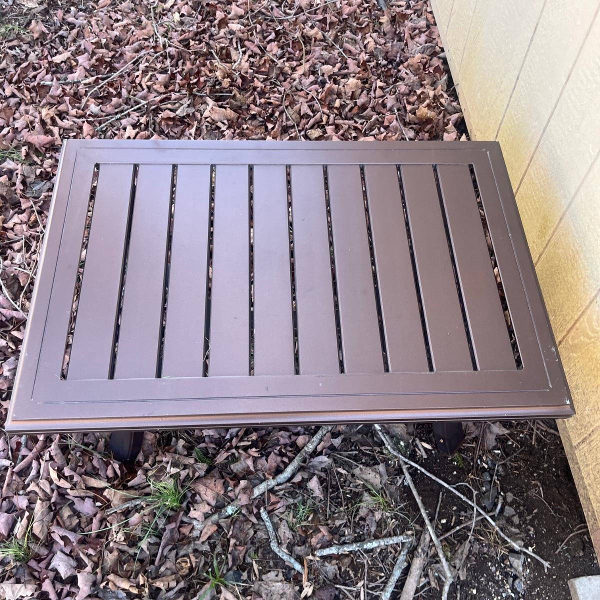 Lot includes two Tropitone aluminum bronze colored patio tables. Largest table measures 48” x 48” x 29”H.