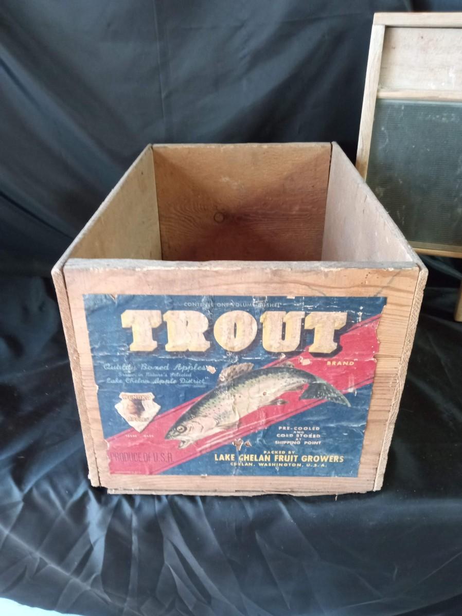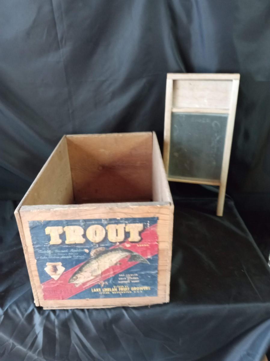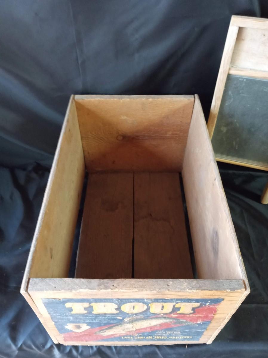 TROUT WOODEN CRATE AND A GLASS WASHBOARD