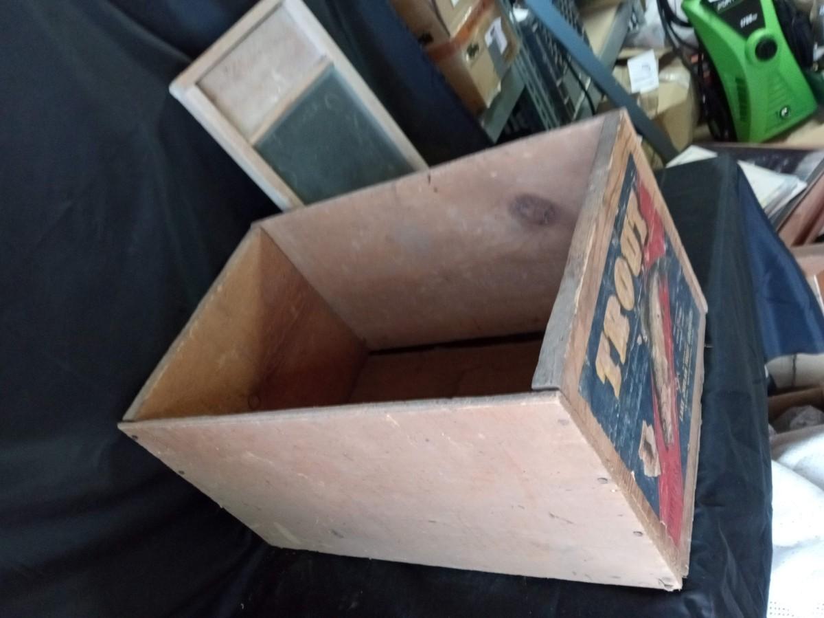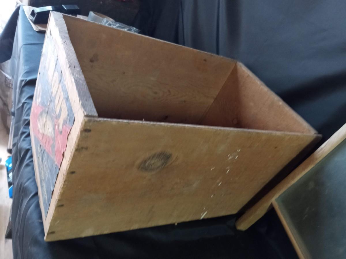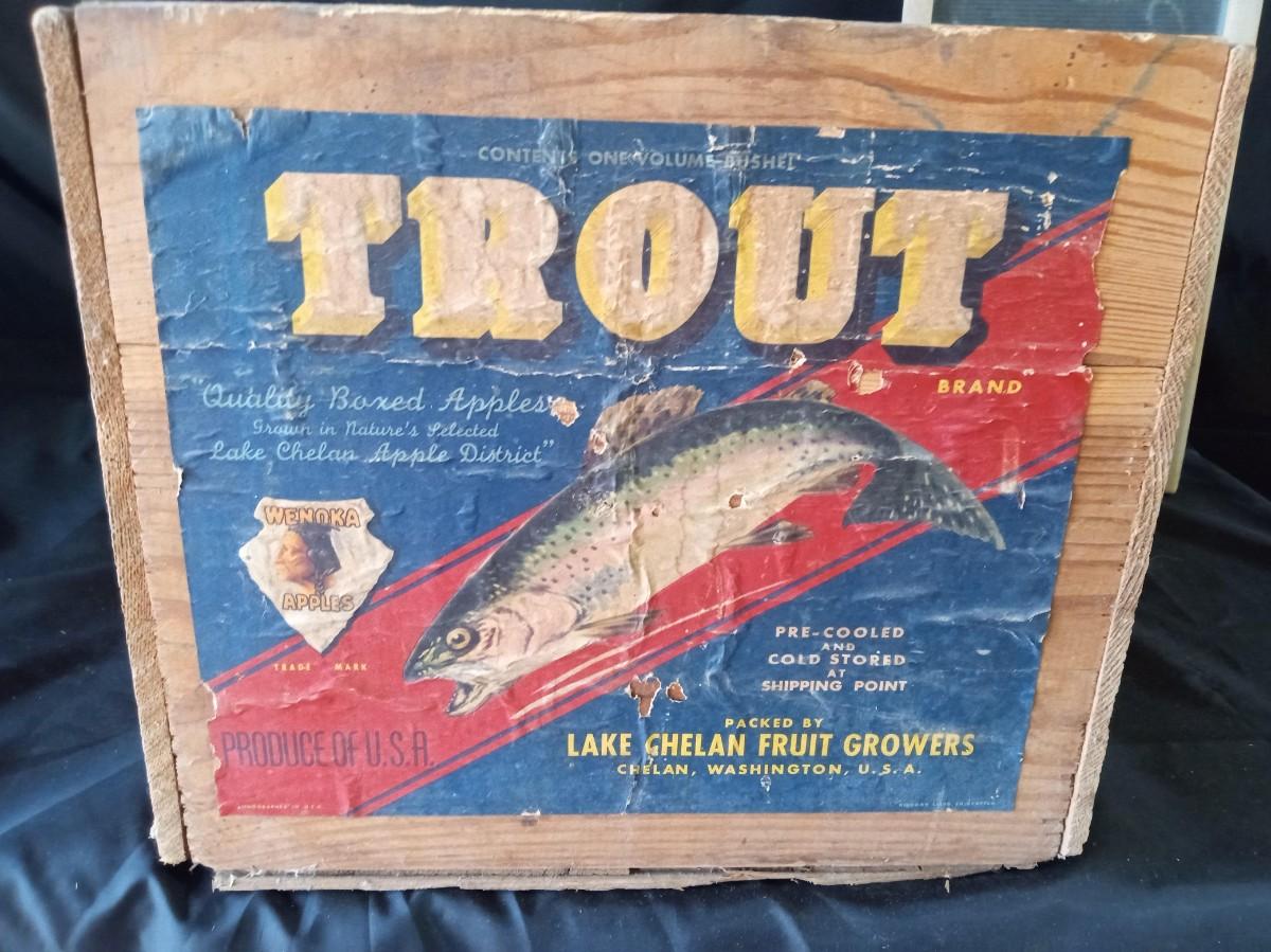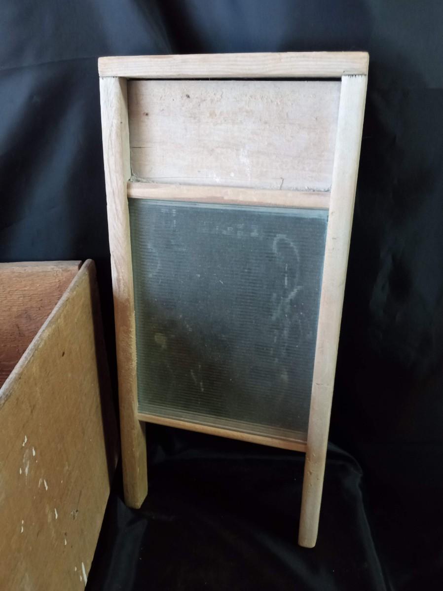 TROUT WOODEN CRATE AND A GLASS WASHBOARD