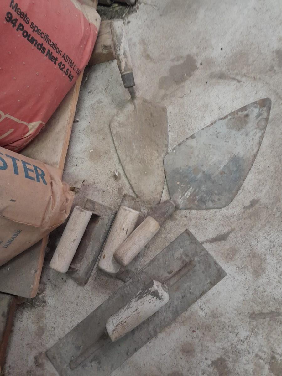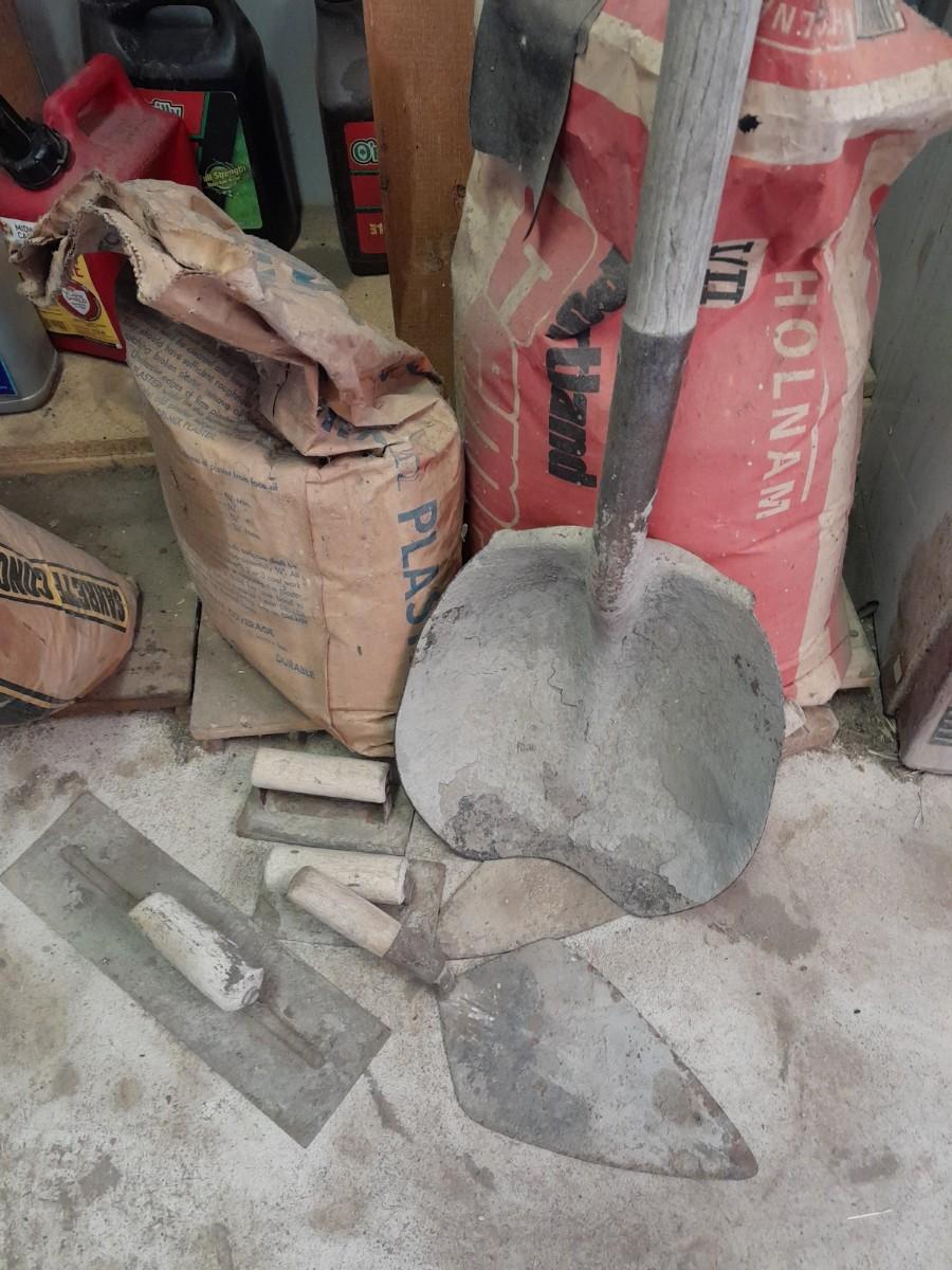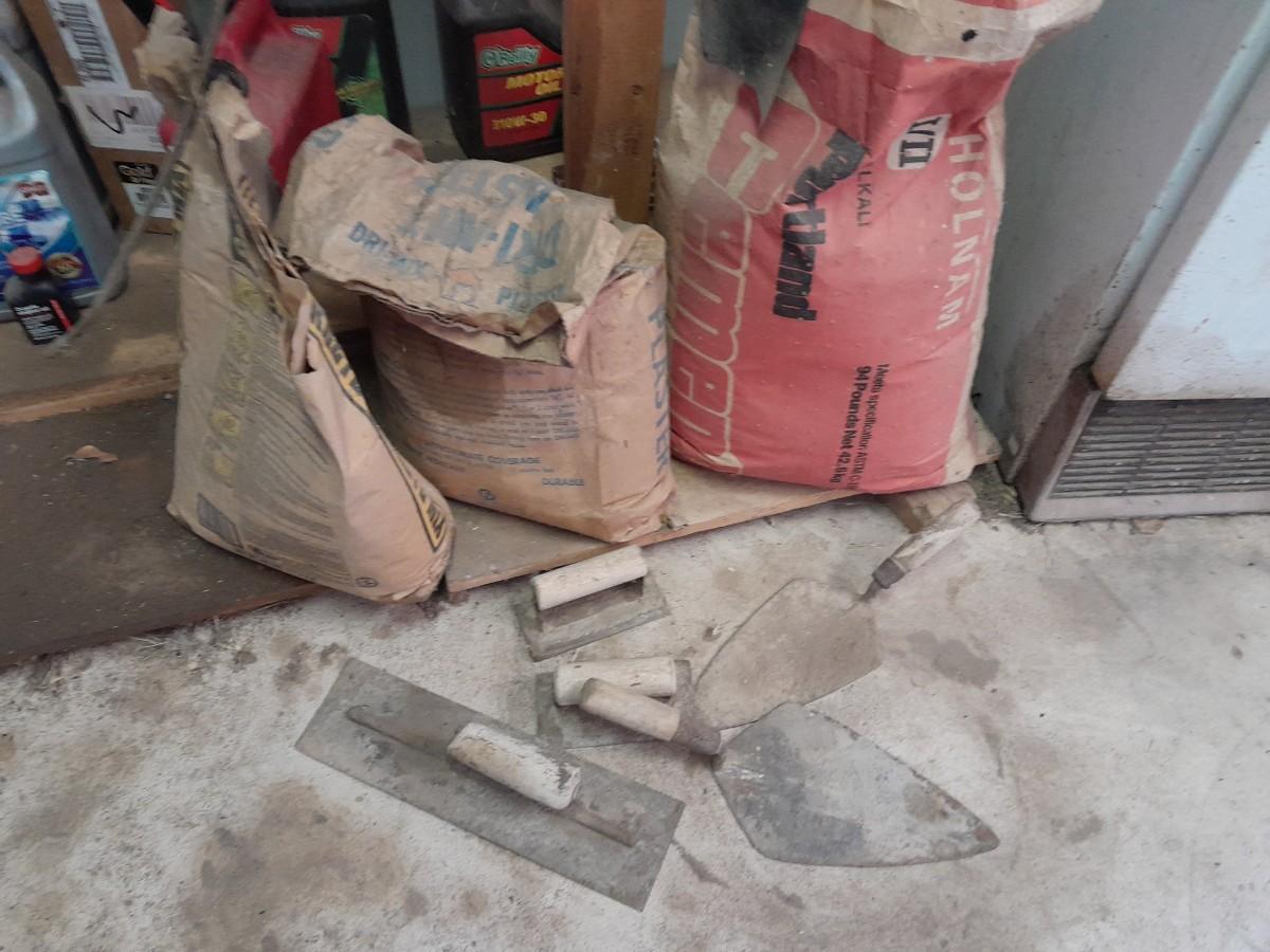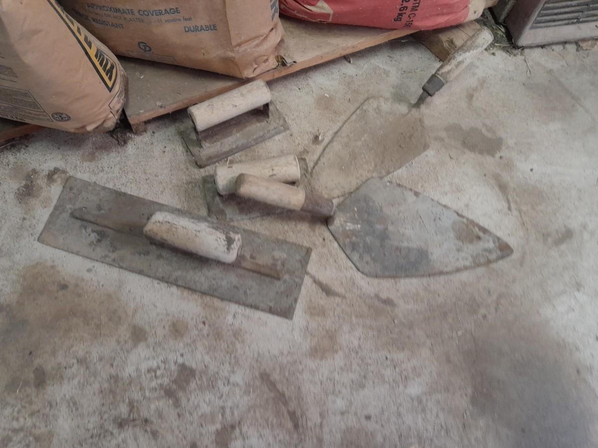 ASSORTMENT OF TROWELS AND BAGS OF PLASTER AND SAKRETE CONCRETE MIX OPEN BAGS, AND OLD SHOVEL