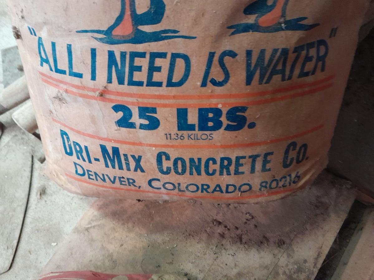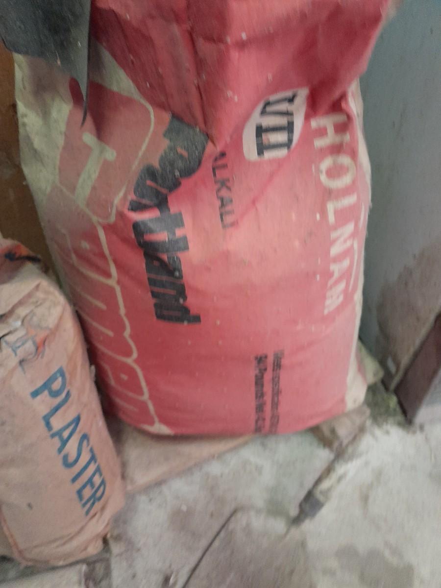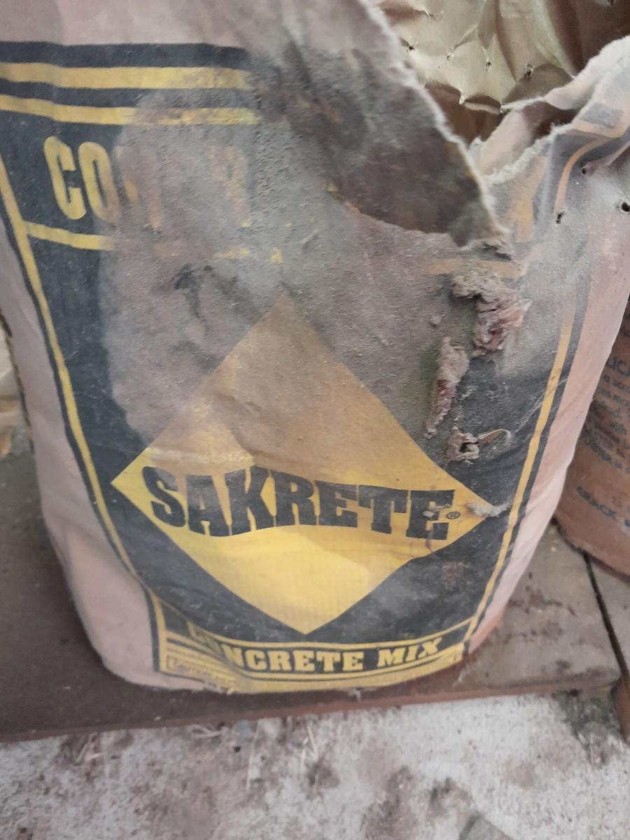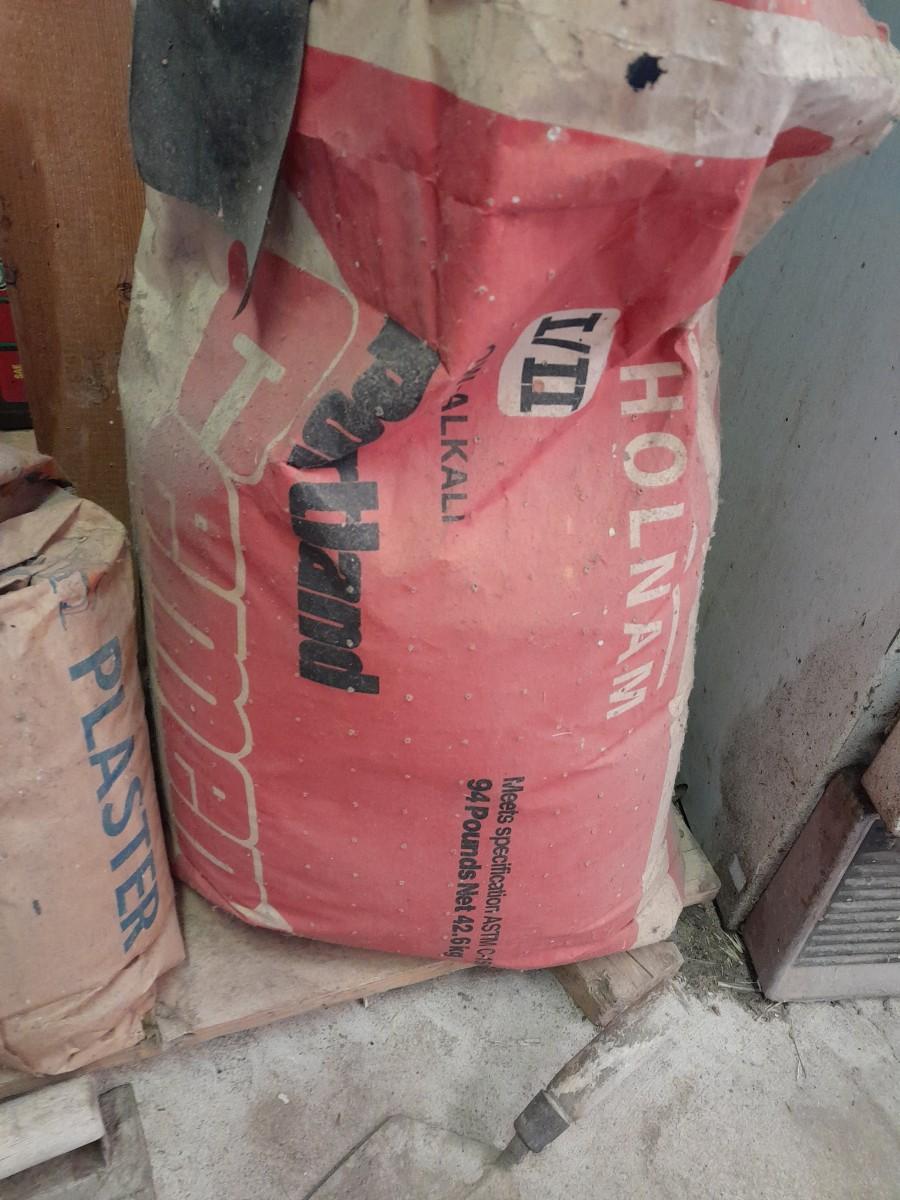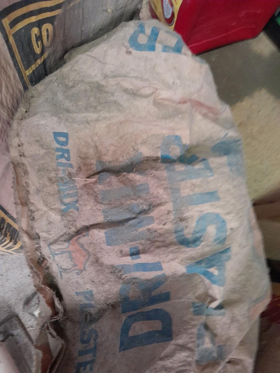 ASSORTMENT OF TROWELS AND BAGS OF PLASTER AND SAKRETE CONCRETE MIX OPEN BAGS, AND OLD SHOVEL