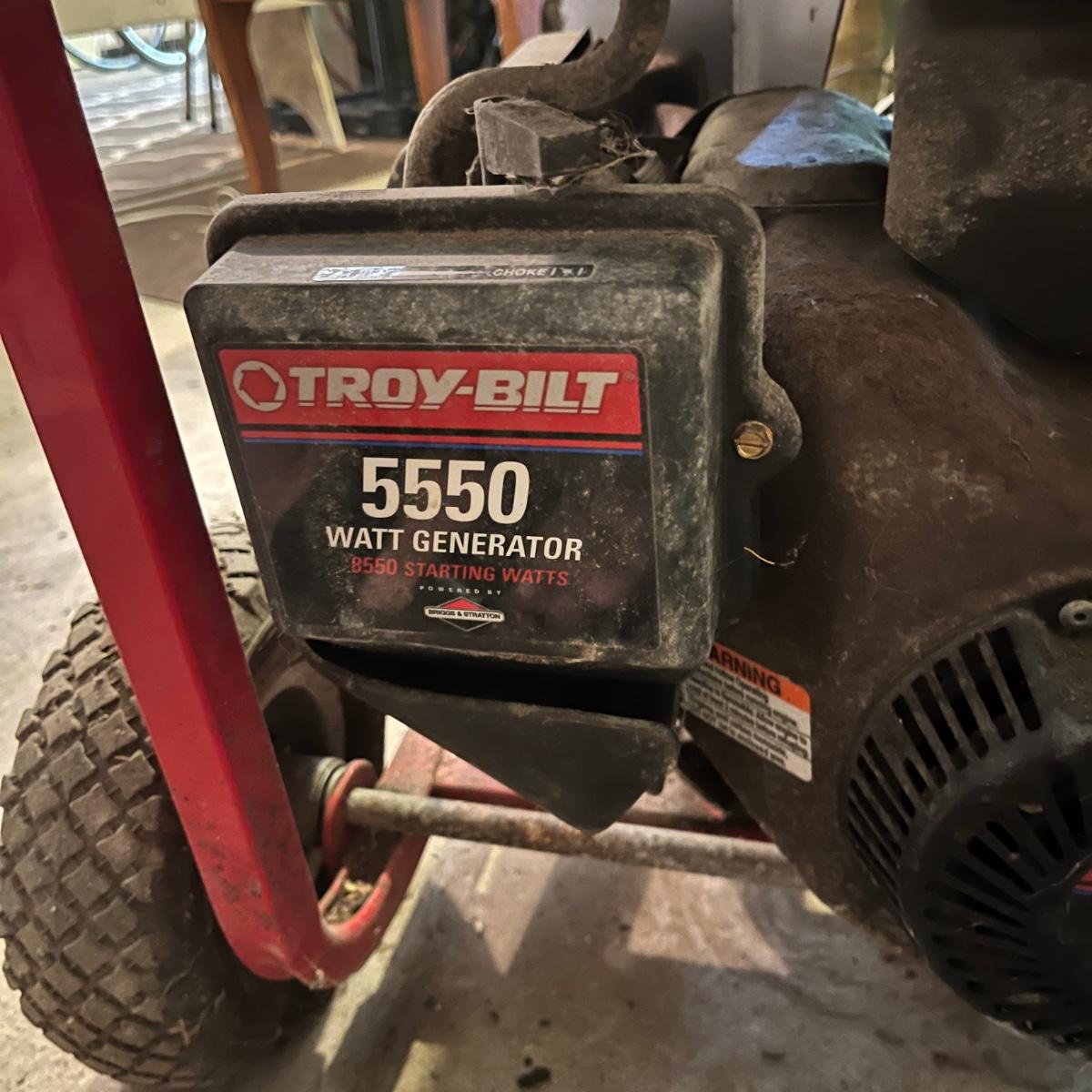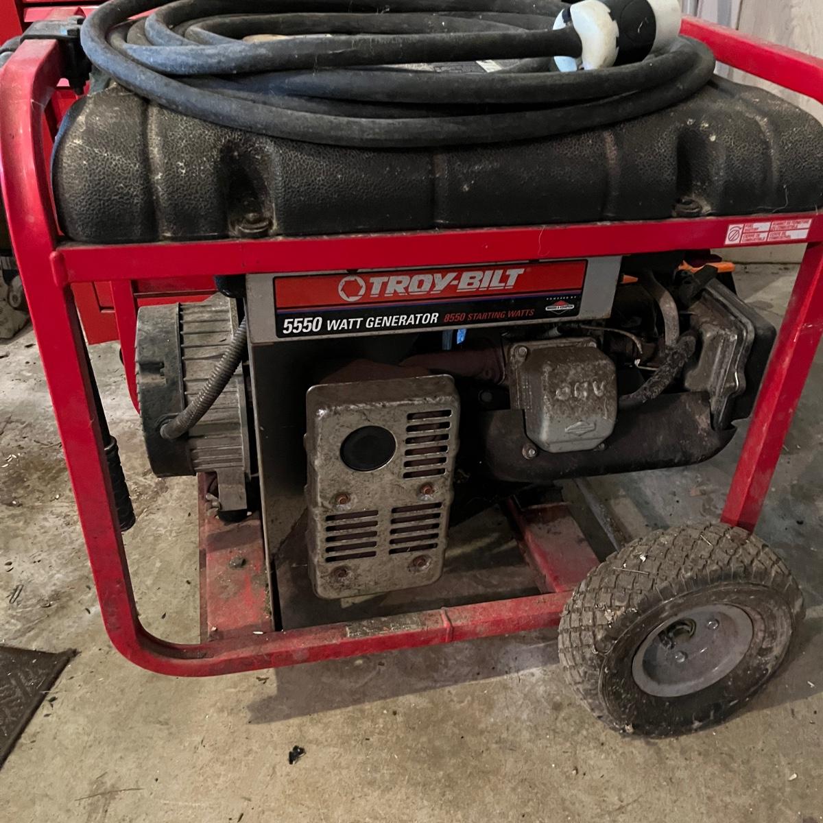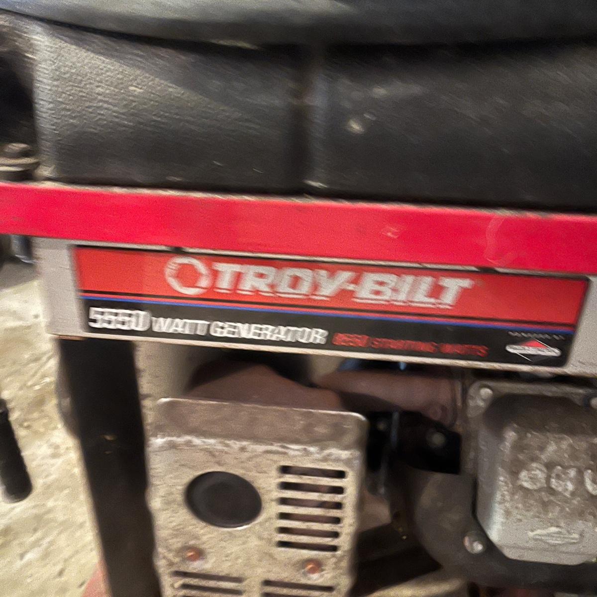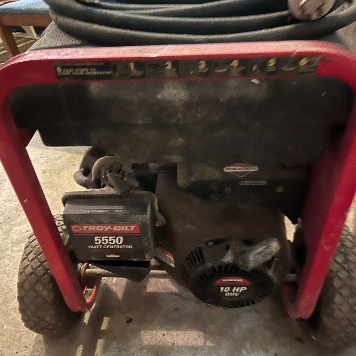 This Troy Bilt generator is 5550 watts and has a 10HP Briggs & Stratton motor. Also includes cable. Engine started when cord pulled but generator was not tested.