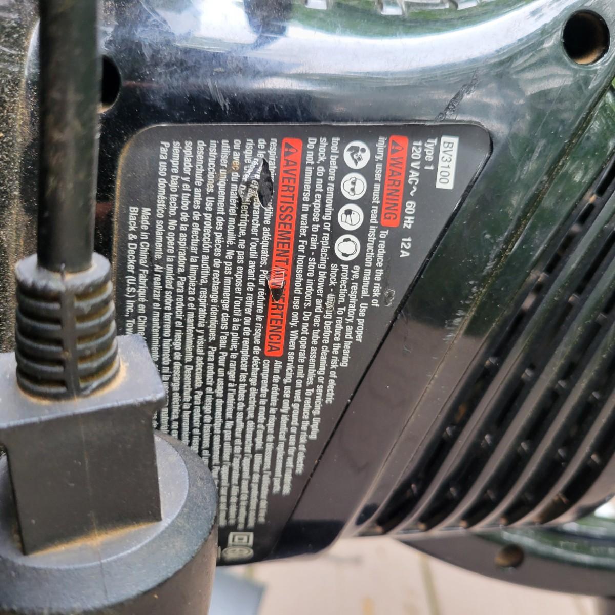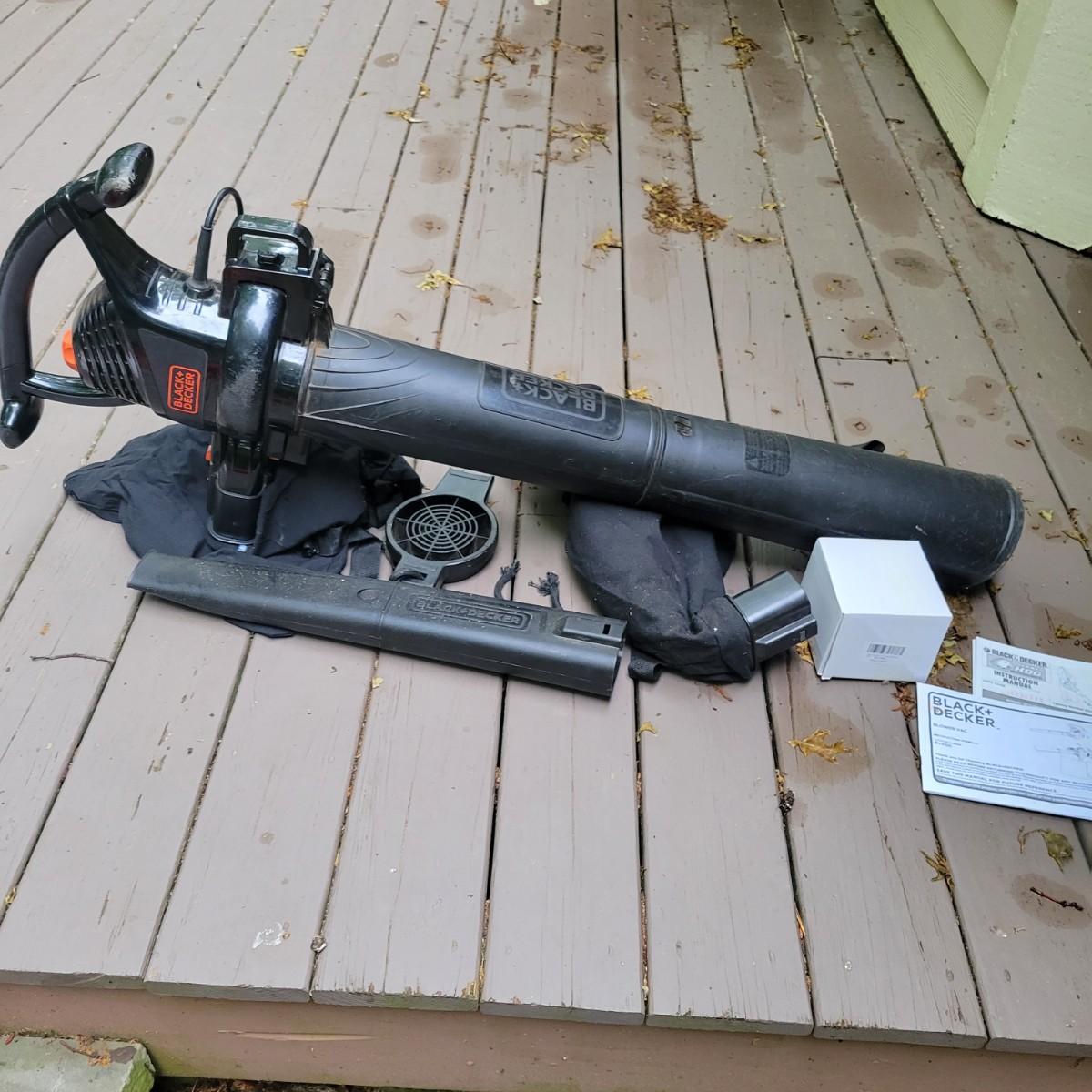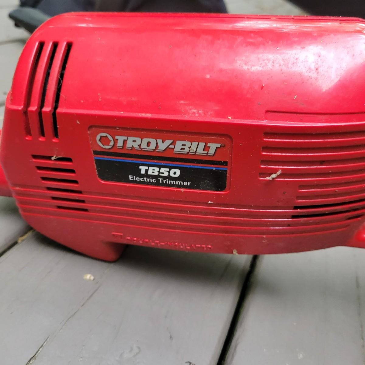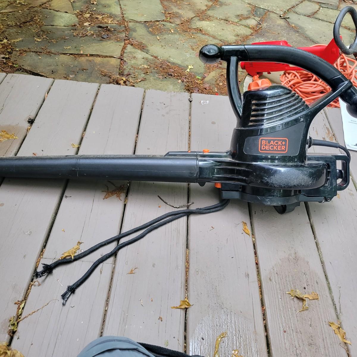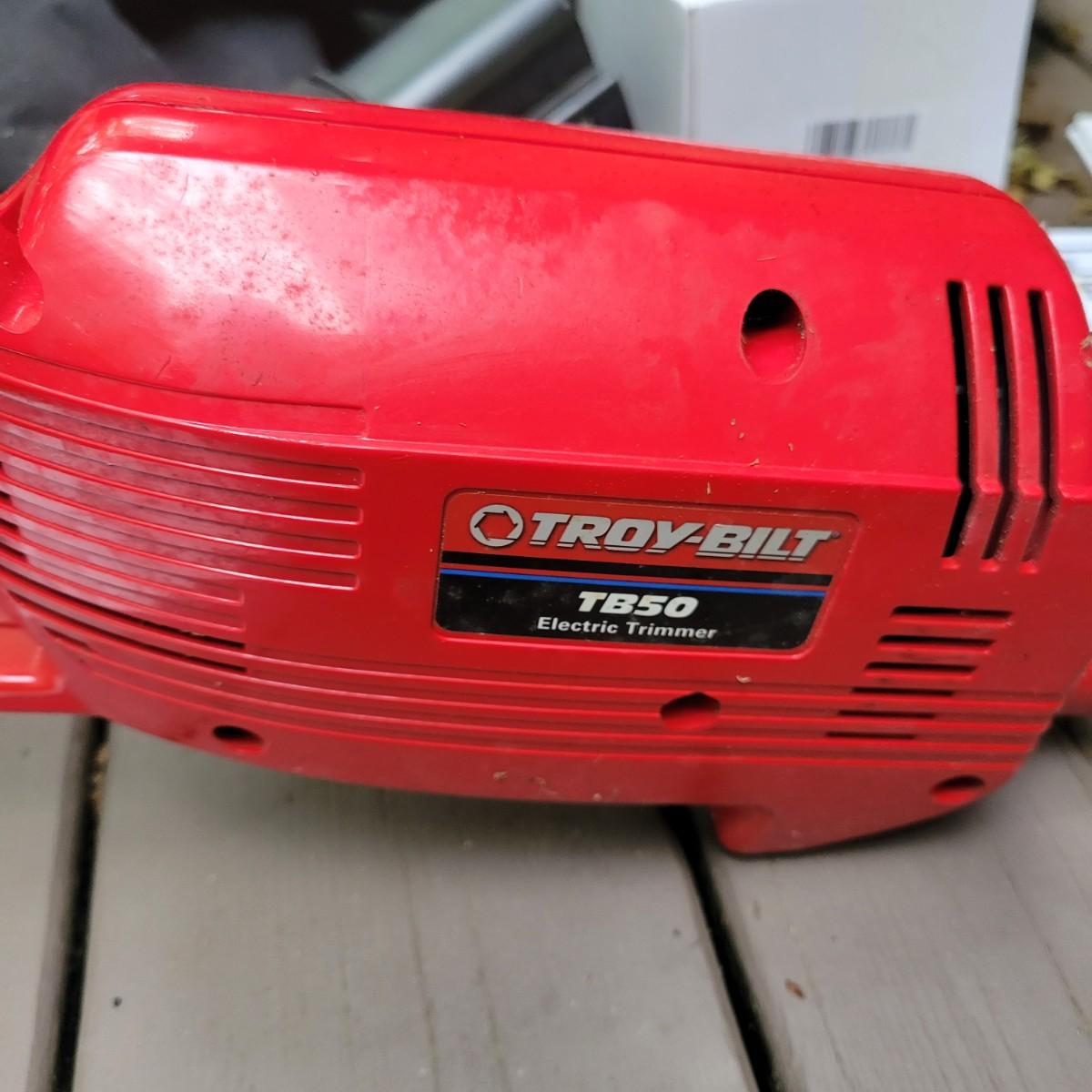 A Troy-Bilt electric string trimmer that powered on when plugged in and comes with its original manual. Lot also includes a Black & Decker blower vac that powered on when plugged in. It includes three leaf bags and a vacuum attachment. The bottom fan guard is broken at its hinge. Also includes a 100' extension cord. Local pickup only