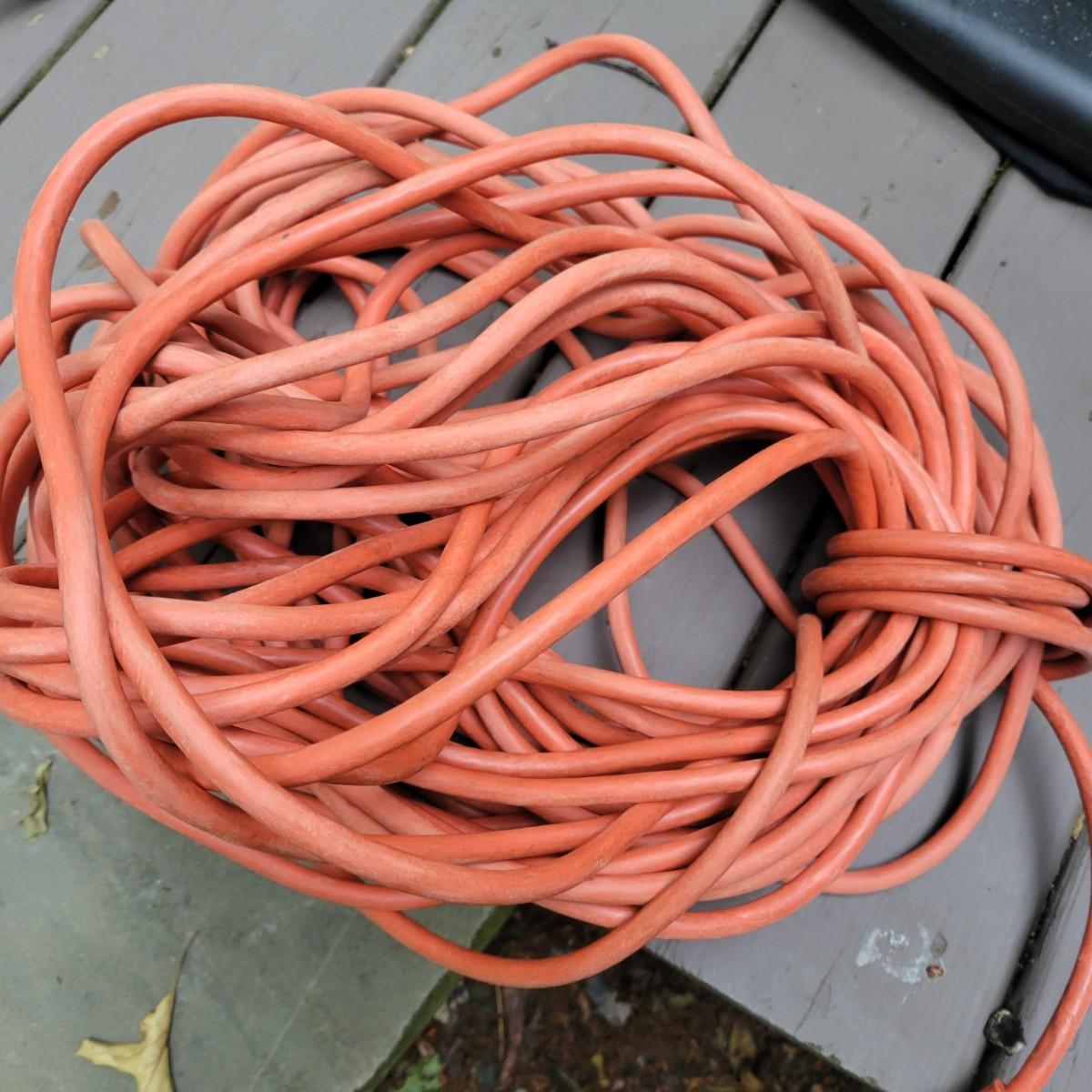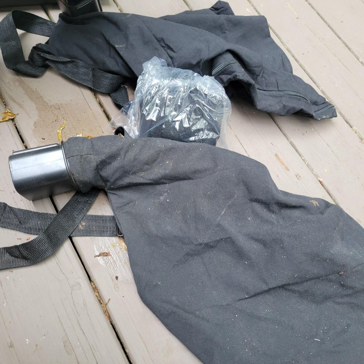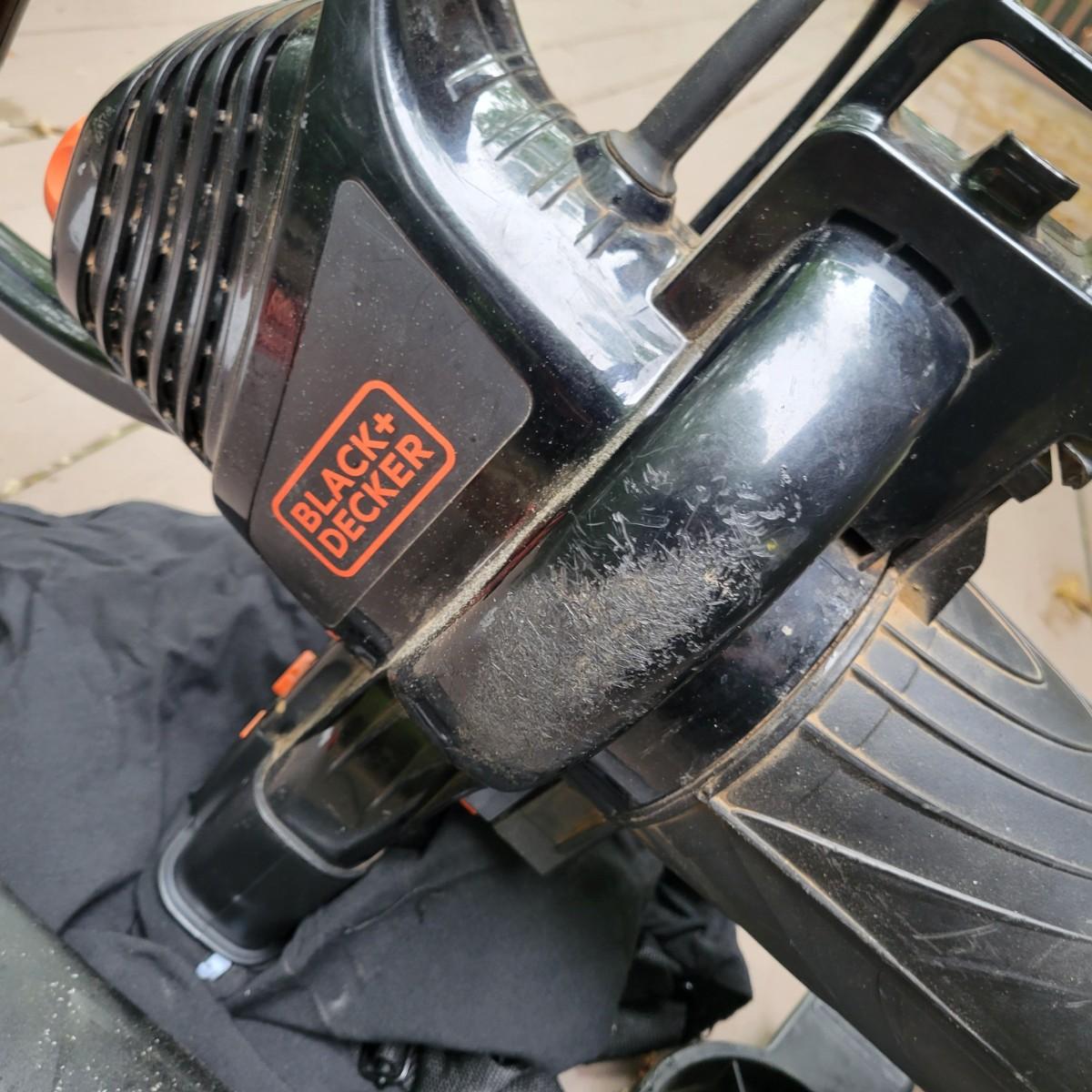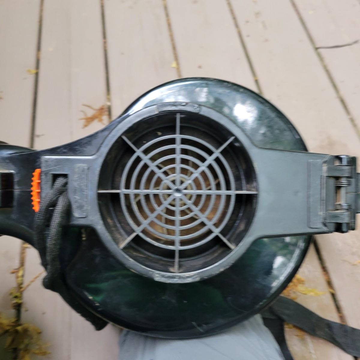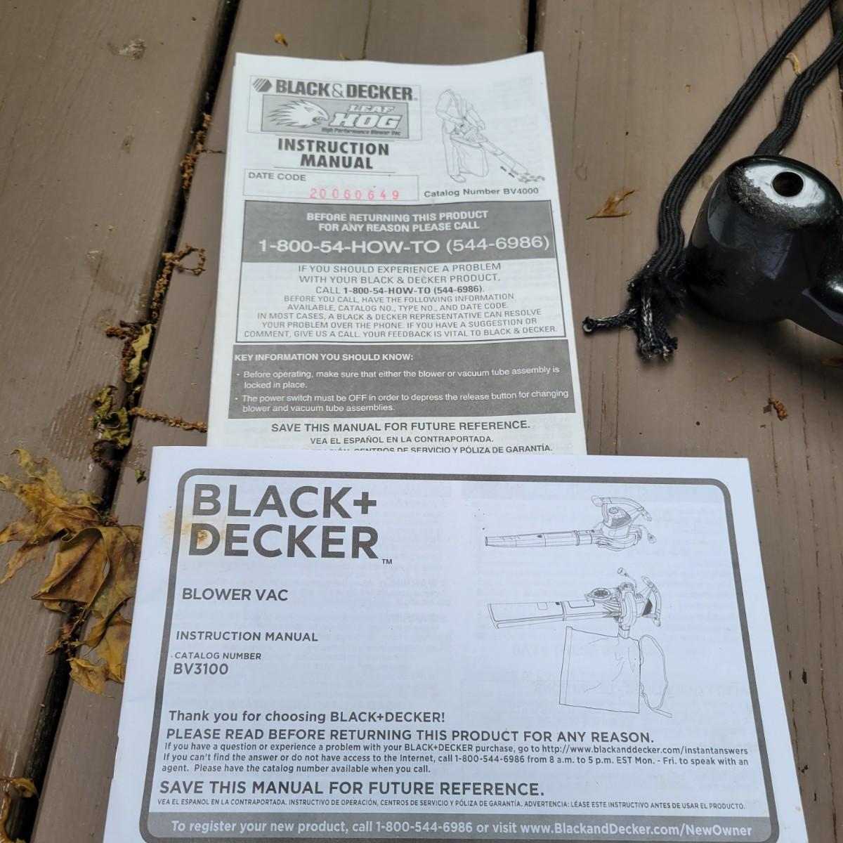 A Troy-Bilt electric string trimmer that powered on when plugged in and comes with its original manual. Lot also includes a Black & Decker blower vac that powered on when plugged in. It includes three leaf bags and a vacuum attachment. The bottom fan guard is broken at its hinge. Also includes a 100' extension cord. Local pickup only