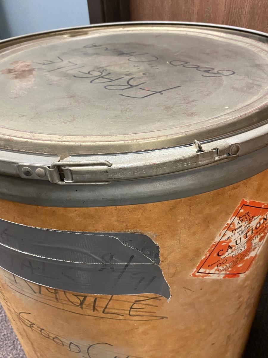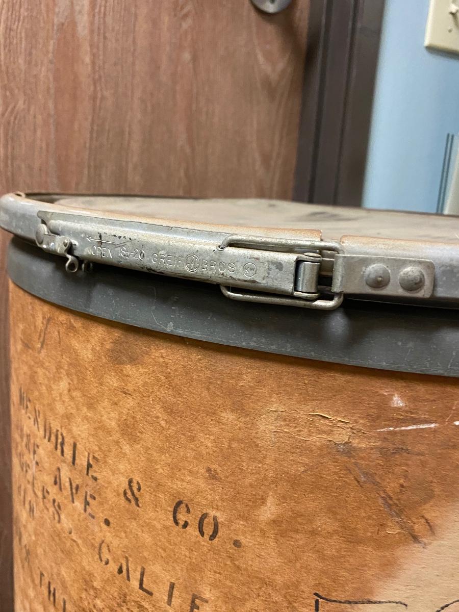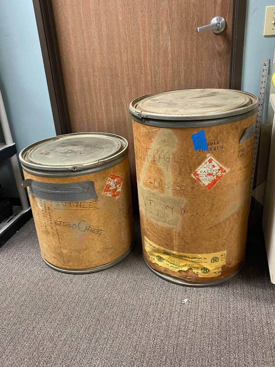 Vintage Storage Barrels Drums. In fair condition. Not sure how to open so don't know what the inside looks like. Original company info still on them but hard to read. Have been written on by past owners, someone used them for packing china dishes at one time.