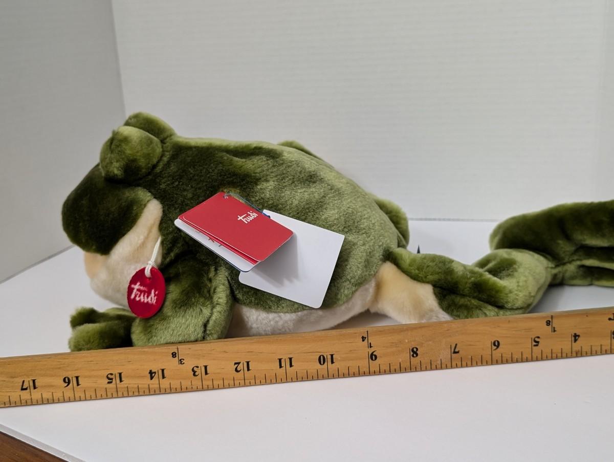 Adorable Trudi plush frog with soft green fur, embroidered details, and signature red Trudi tag. Known for high-quality craftsmanship, Trudi plush toys are collectible and cherished worldwide. This frog makes a perfect gift, display piece, or addition to any plush or Trudi collection.