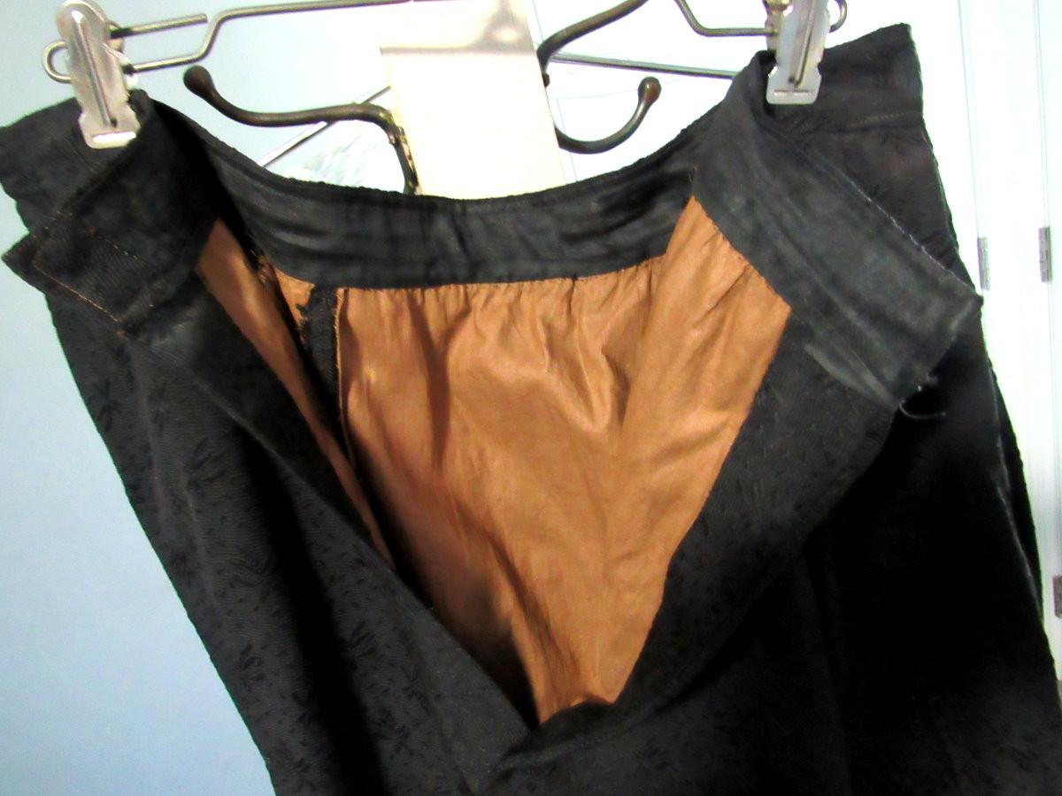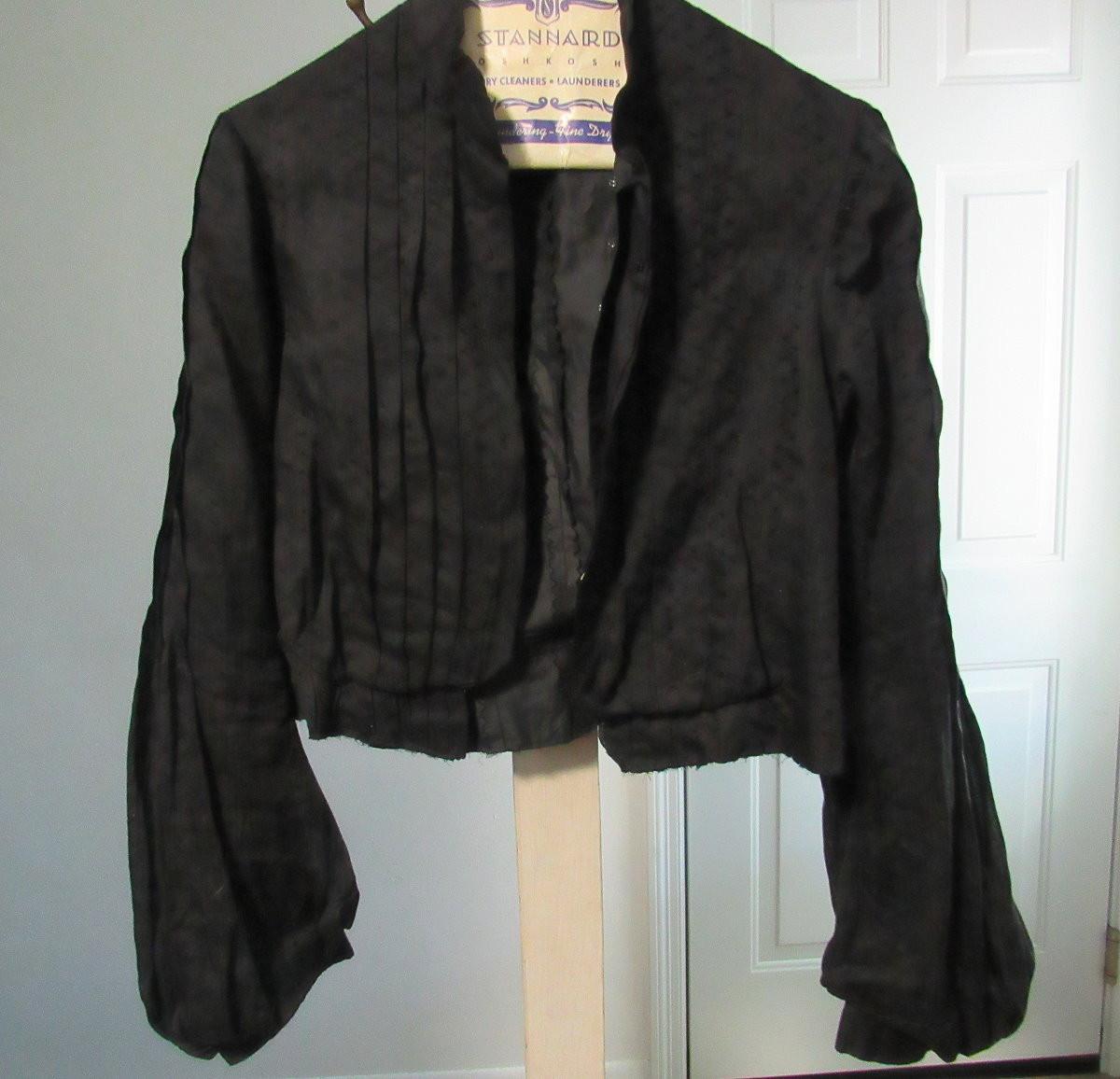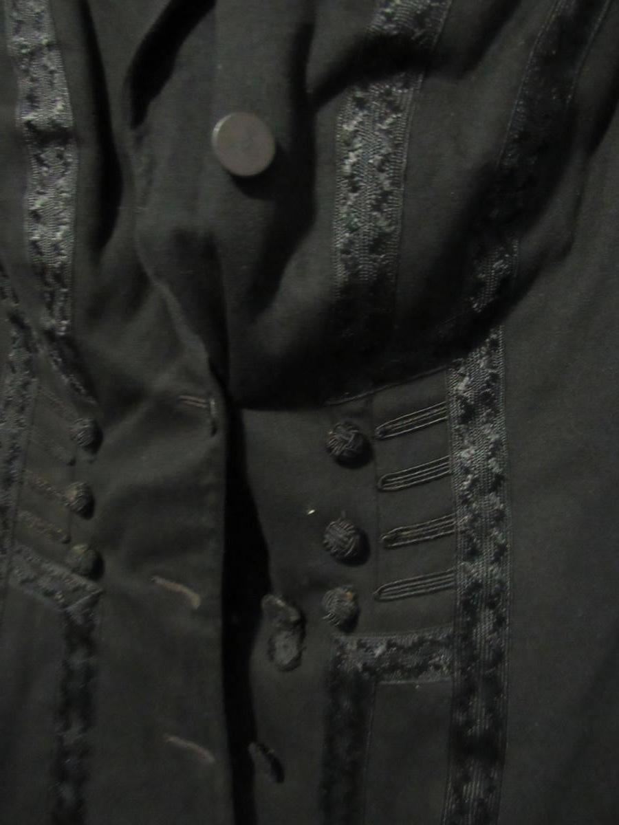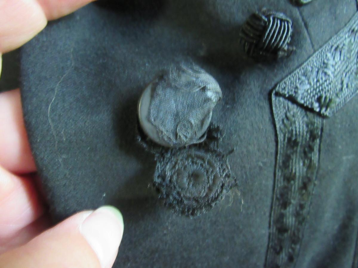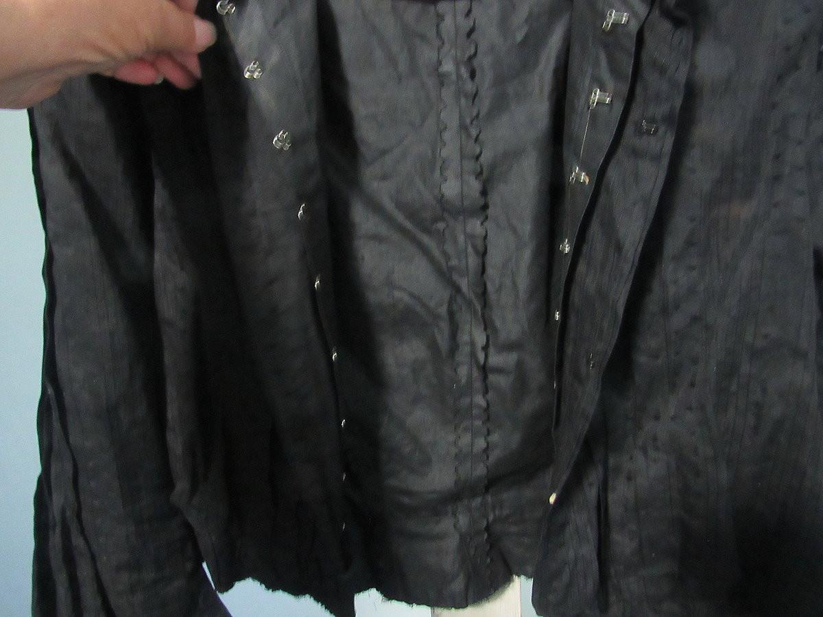 Very hard to photograph this 3 pc set with all the different patterns and textures. This set includes the lightweight sheer black top, the over-jacket with lots of braided trim and nice lining, and the skirt which is lined, and very heavy winter weight fabric. To me this is museum quality. Very little damage. Just two of the buttons on the jacket had the fabric covering come off, one is hanging there and may be able to be repaired. One is totally missing. See pics. There is some minor wear on some embellishments on the jacket, nothing too bad. Lining looks intact to me. I have no idea how they secured the skirt, I don't see a button hole or button at the waist. The skirt is very full and sweeping, very heavy and heavy weight fabric. There is a tear in the lining of the skirt, might need to be patched because it is not on a seam. The skirt looks like it has a slight train effect. The top is sheer black with fancy pattern and short waist. Hook and eye closures. There are some loose threads on the waist of the shirt. Machine and hand stitched. No labels, don't know size or maker.