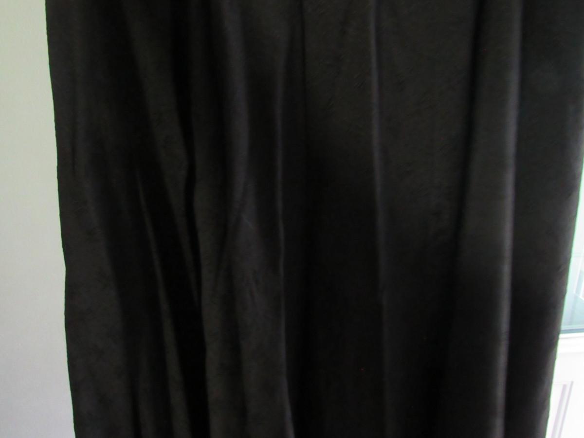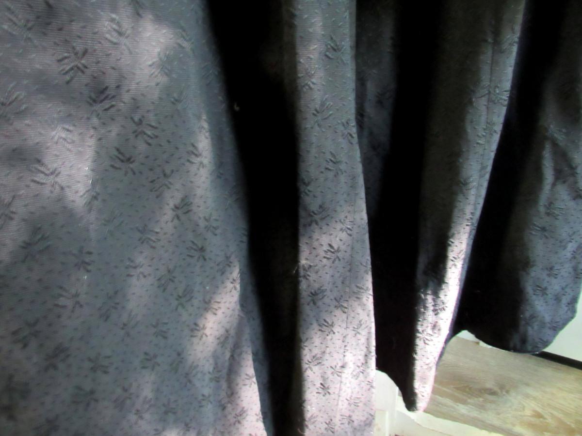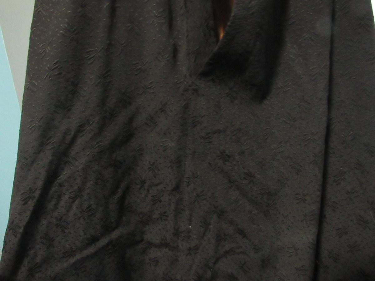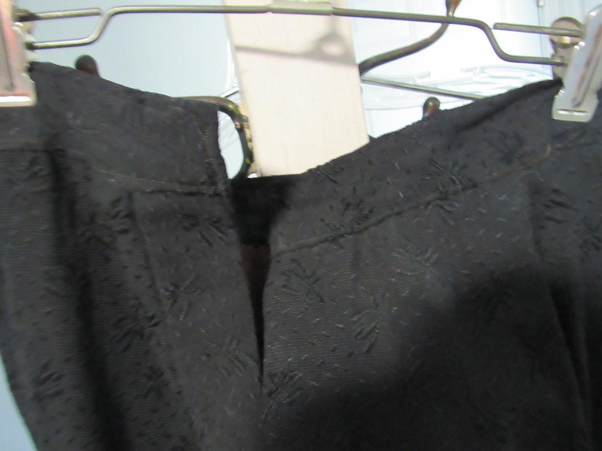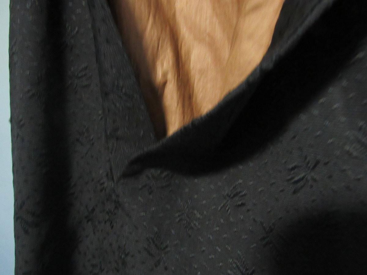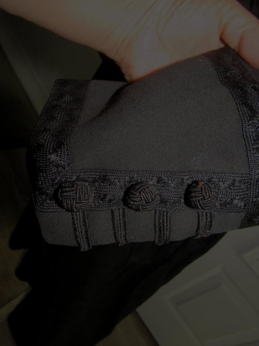 Very hard to photograph this 3 pc set with all the different patterns and textures. This set includes the lightweight sheer black top, the over-jacket with lots of braided trim and nice lining, and the skirt which is lined, and very heavy winter weight fabric. To me this is museum quality. Very little damage. Just two of the buttons on the jacket had the fabric covering come off, one is hanging there and may be able to be repaired. One is totally missing. See pics. There is some minor wear on some embellishments on the jacket, nothing too bad. Lining looks intact to me. I have no idea how they secured the skirt, I don't see a button hole or button at the waist. The skirt is very full and sweeping, very heavy and heavy weight fabric. There is a tear in the lining of the skirt, might need to be patched because it is not on a seam. The skirt looks like it has a slight train effect. The top is sheer black with fancy pattern and short waist. Hook and eye closures. There are some loose threads on the waist of the shirt. Machine and hand stitched. No labels, don't know size or maker.