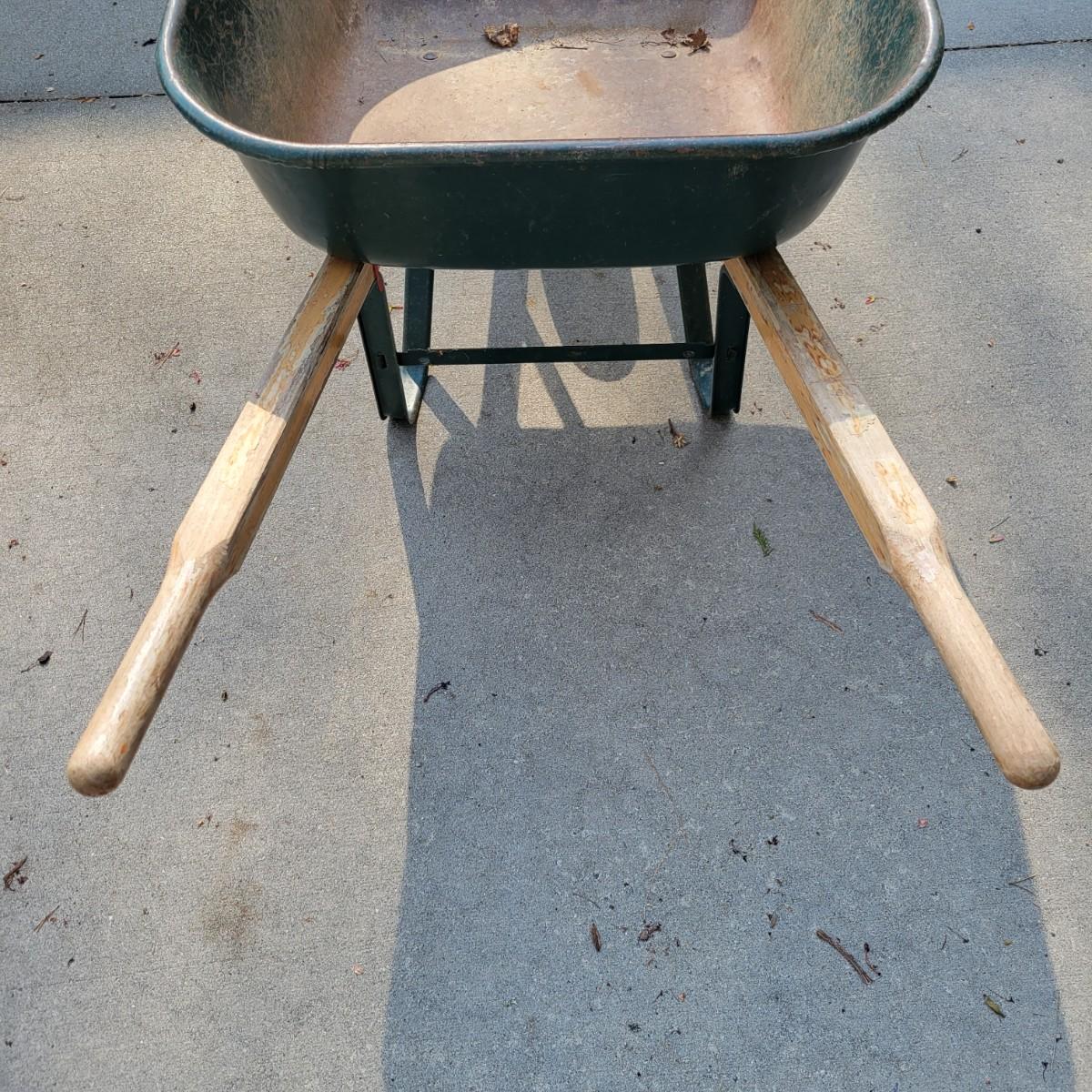 A True Temper wheelbarrow with some rust and general wear and tear associated with use. It has a steel body and the tire is holding air. Measures approximately 58" x 25.5 x 27"H. Local pickup only