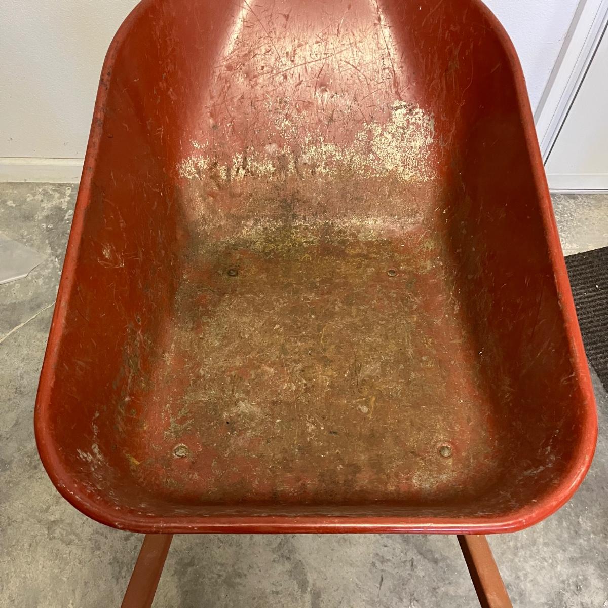 This metal bodied 6 cu. Ft wheelbarrow has wooden handles and a pneumatic tire that is flat. Some to be expected surface scratches on the inside, see image.