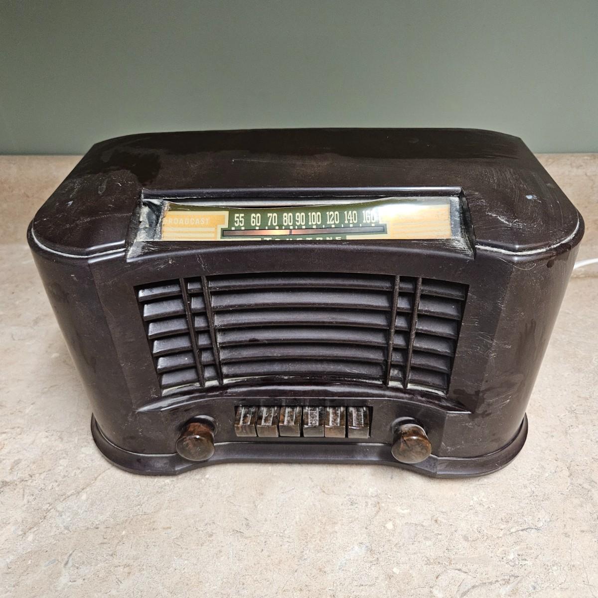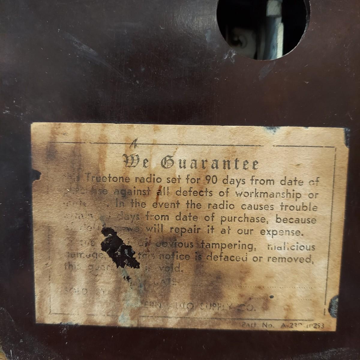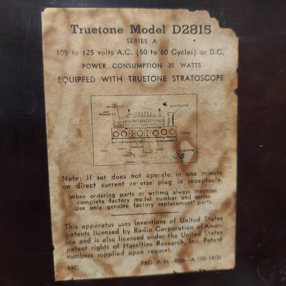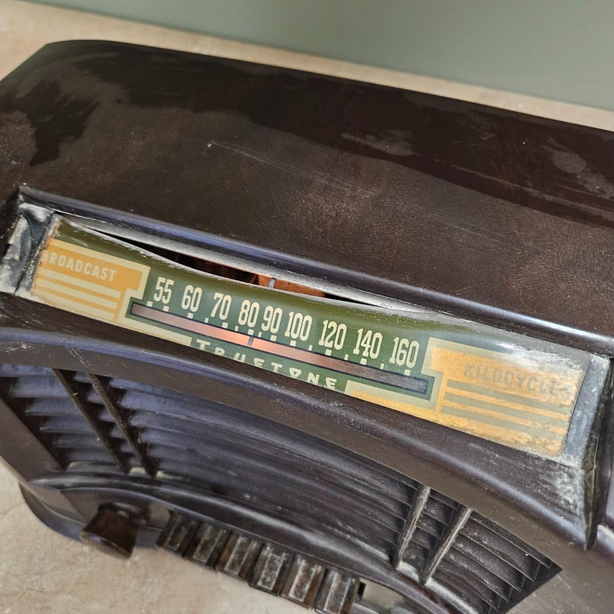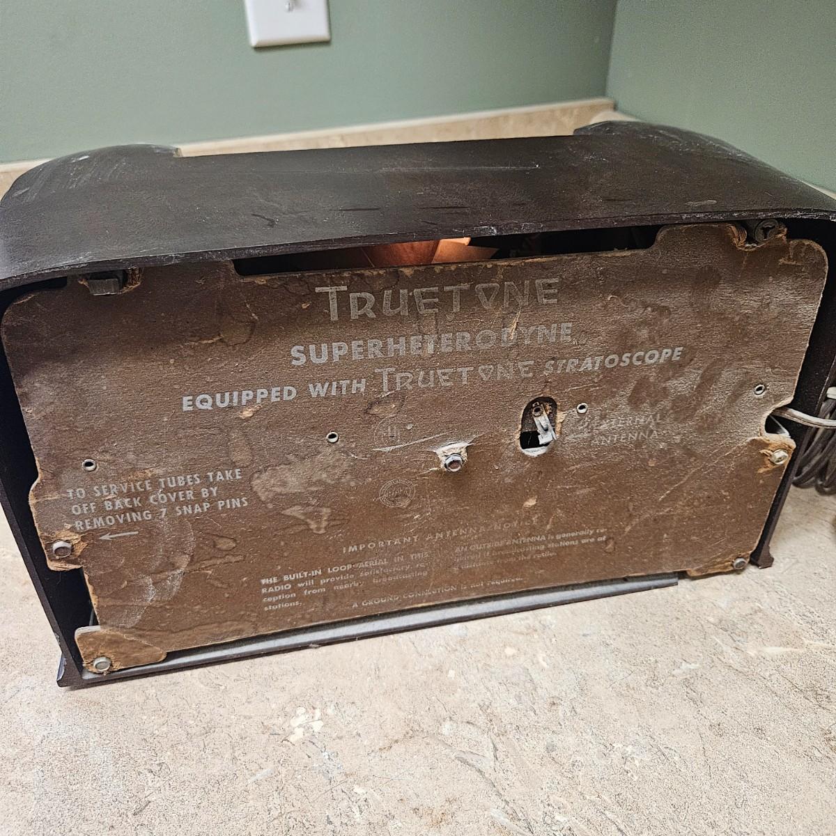 A Truetone Superheterodyne table top radio with tubes that powered on when plugged in. It has a Bakelite body and measures approximately 13.5" x 7" x 8"H. The channel display shows signs of warping from heat. Shipping available
