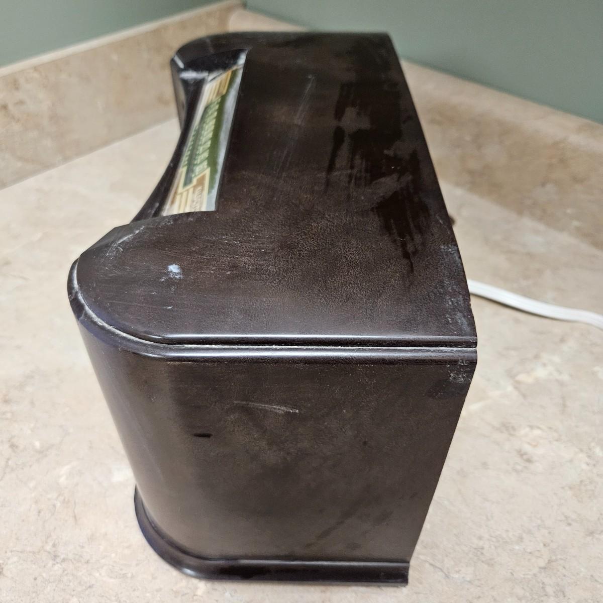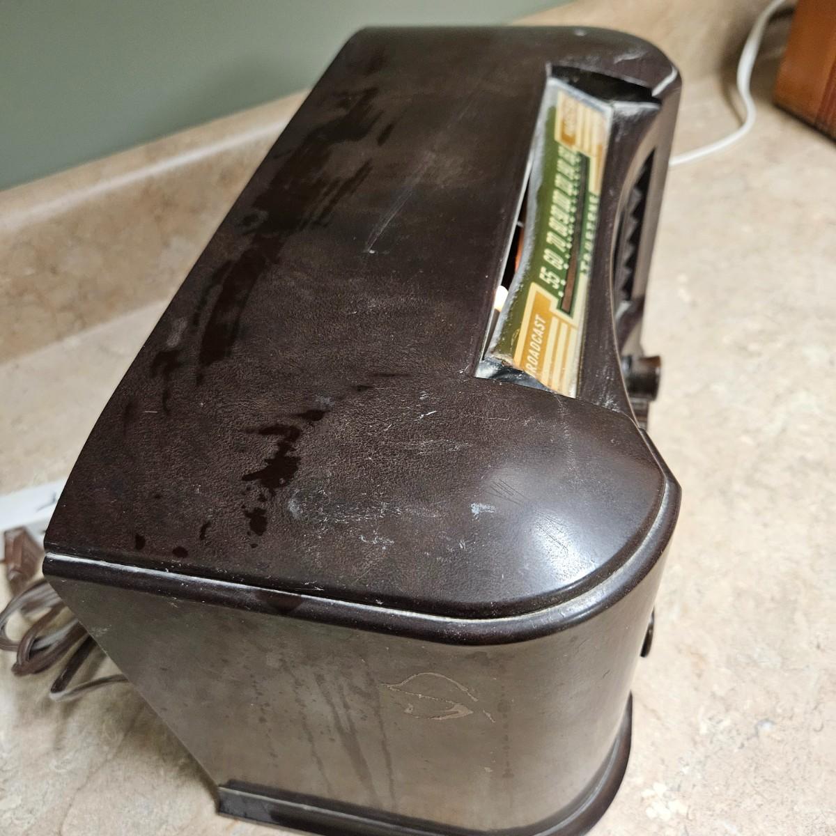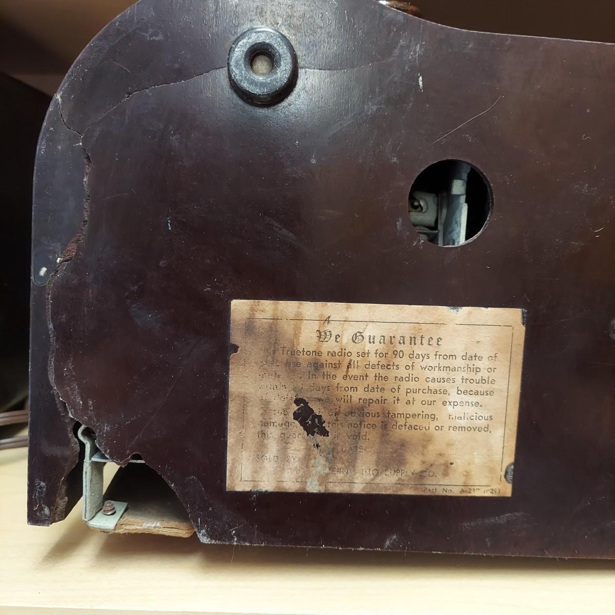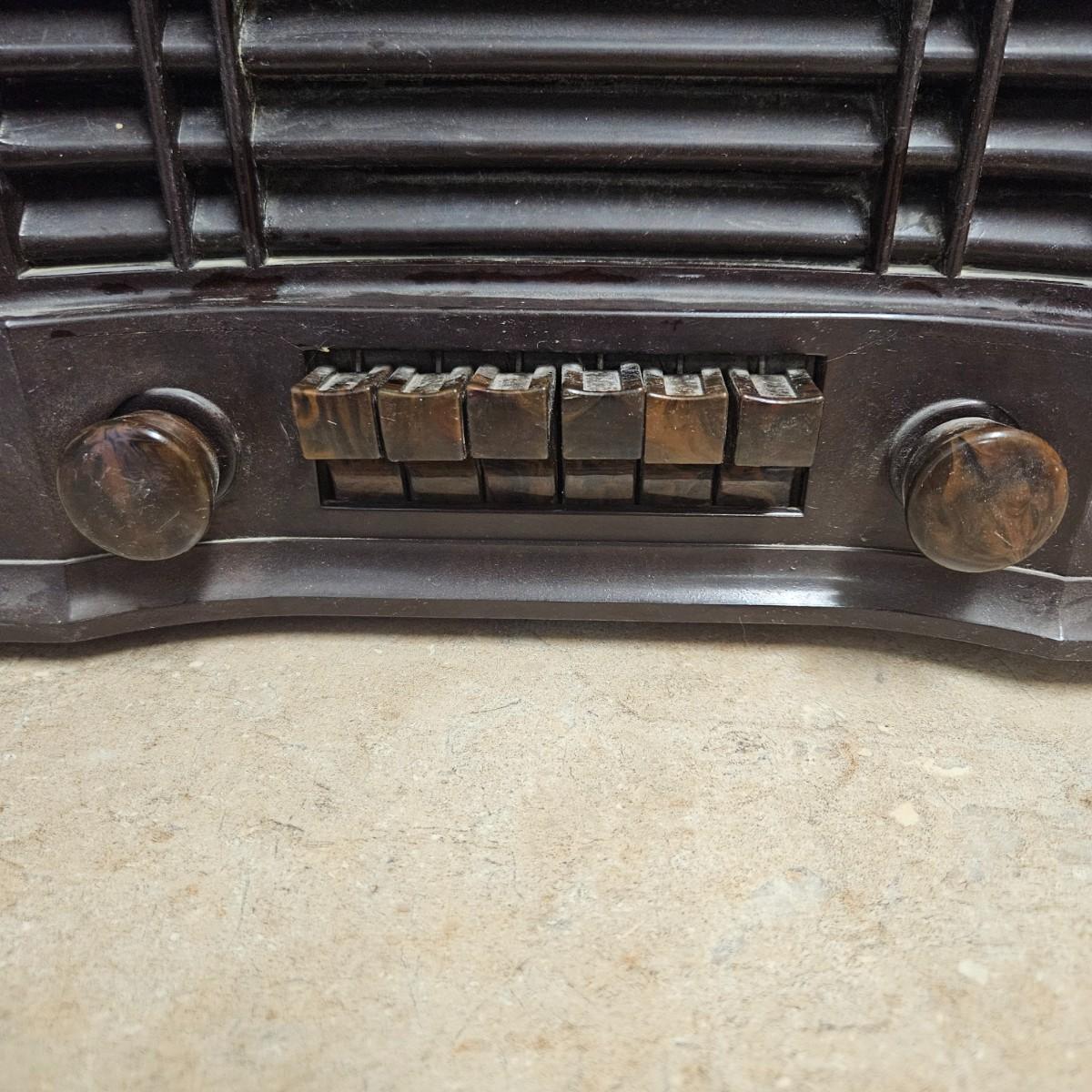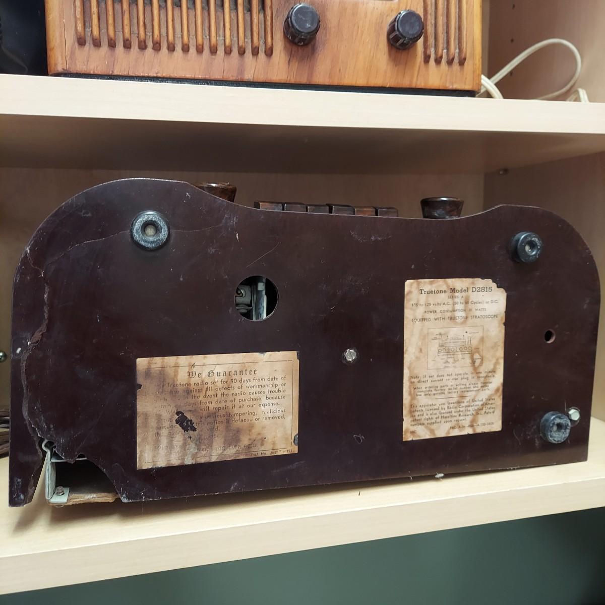 A Truetone Superheterodyne table top radio with tubes that powered on when plugged in. It has a Bakelite body and measures approximately 13.5" x 7" x 8"H. The channel display shows signs of warping from heat. Shipping available
