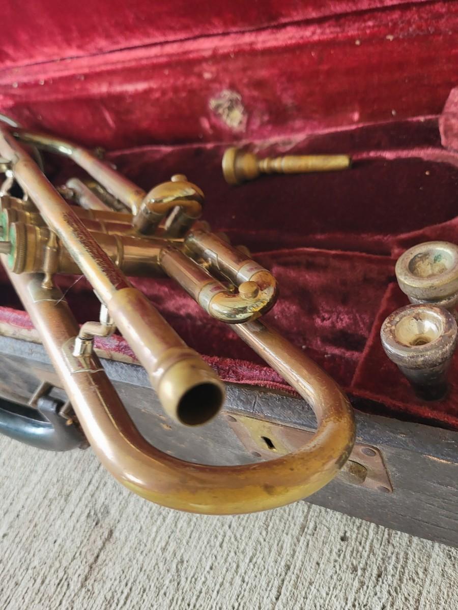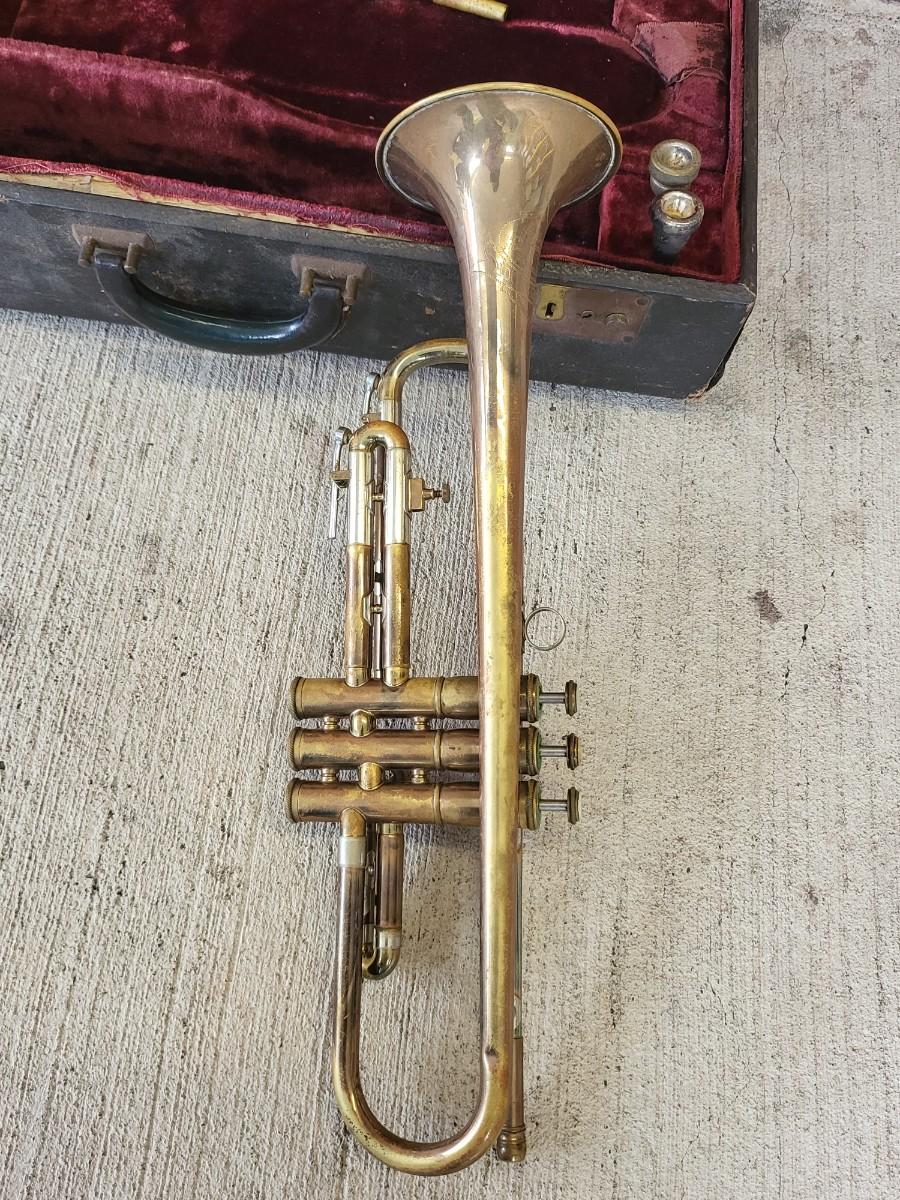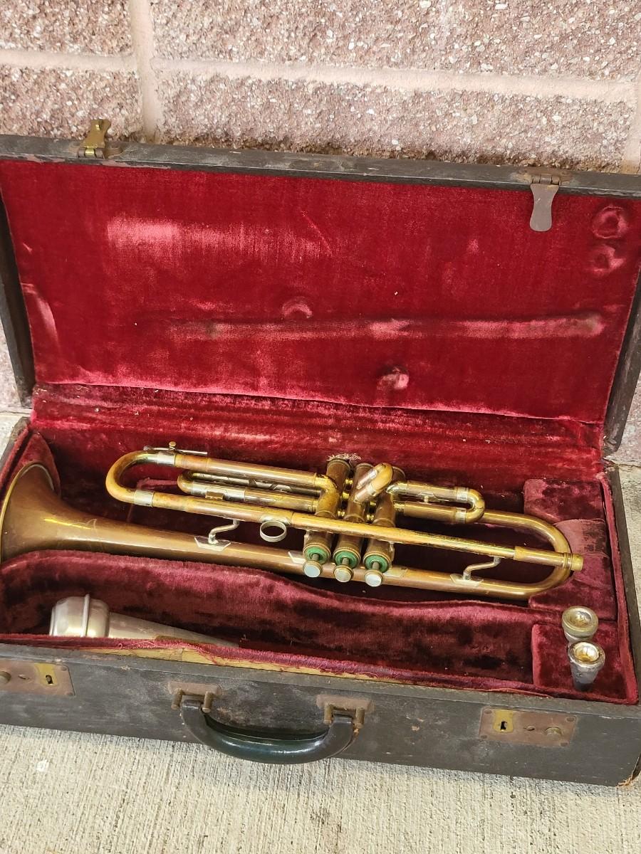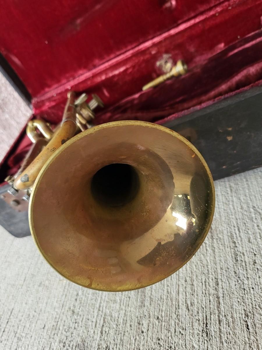 Older, Ambassador brass trumpet in velvet lined case. Needs to be cleaned. Was not tested. There is makers etching on the top part of the horn.