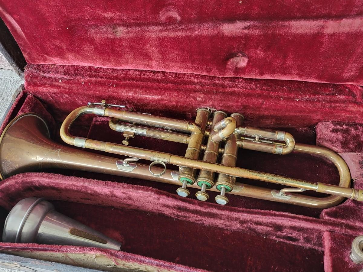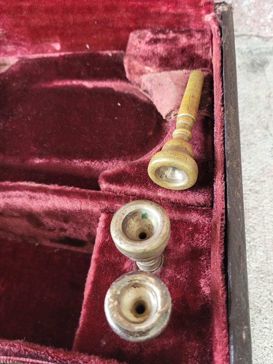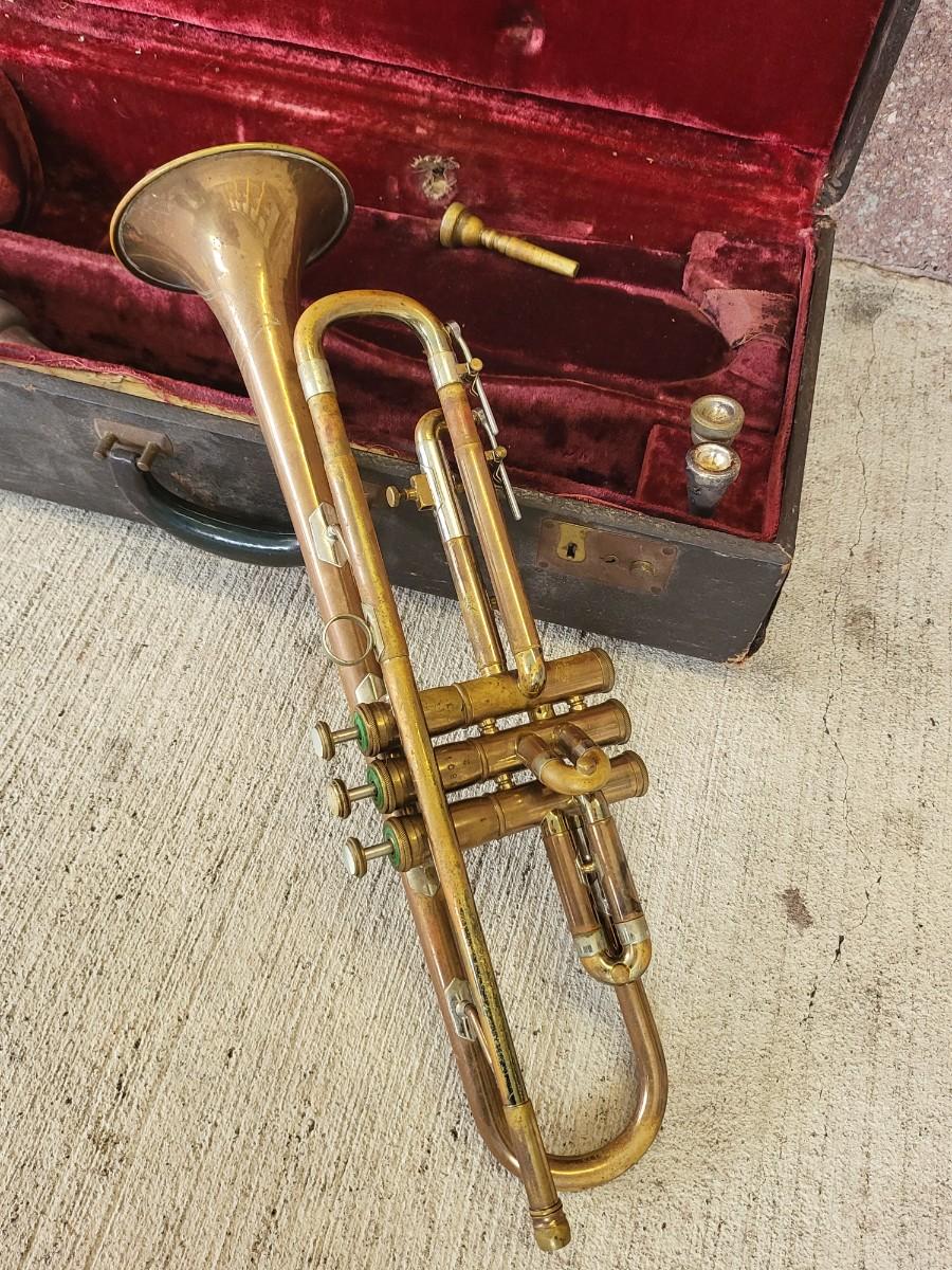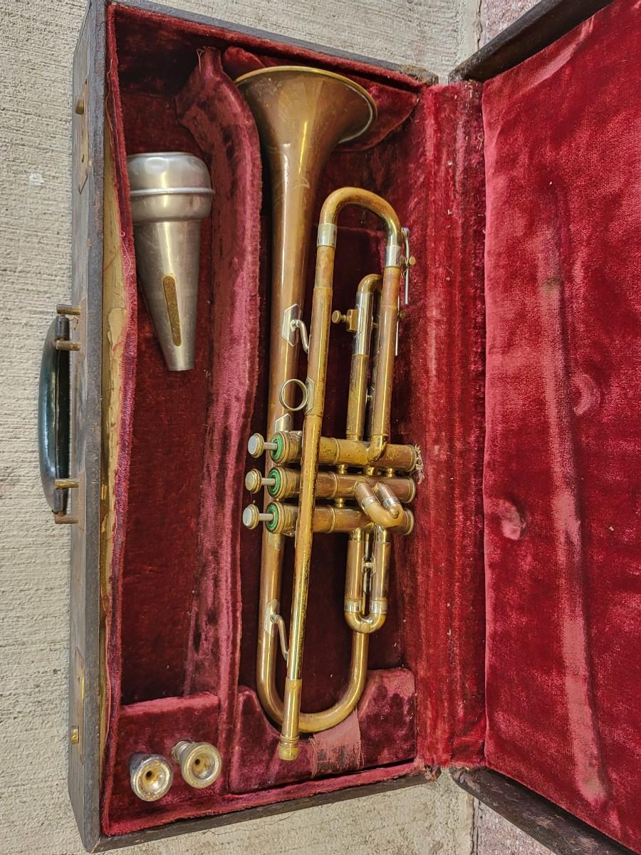 Older, Ambassador brass trumpet in velvet lined case. Needs to be cleaned. Was not tested. There is makers etching on the top part of the horn.