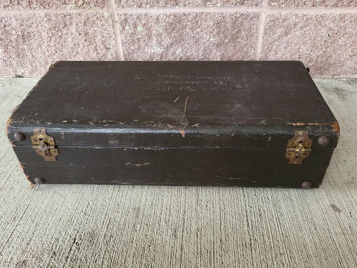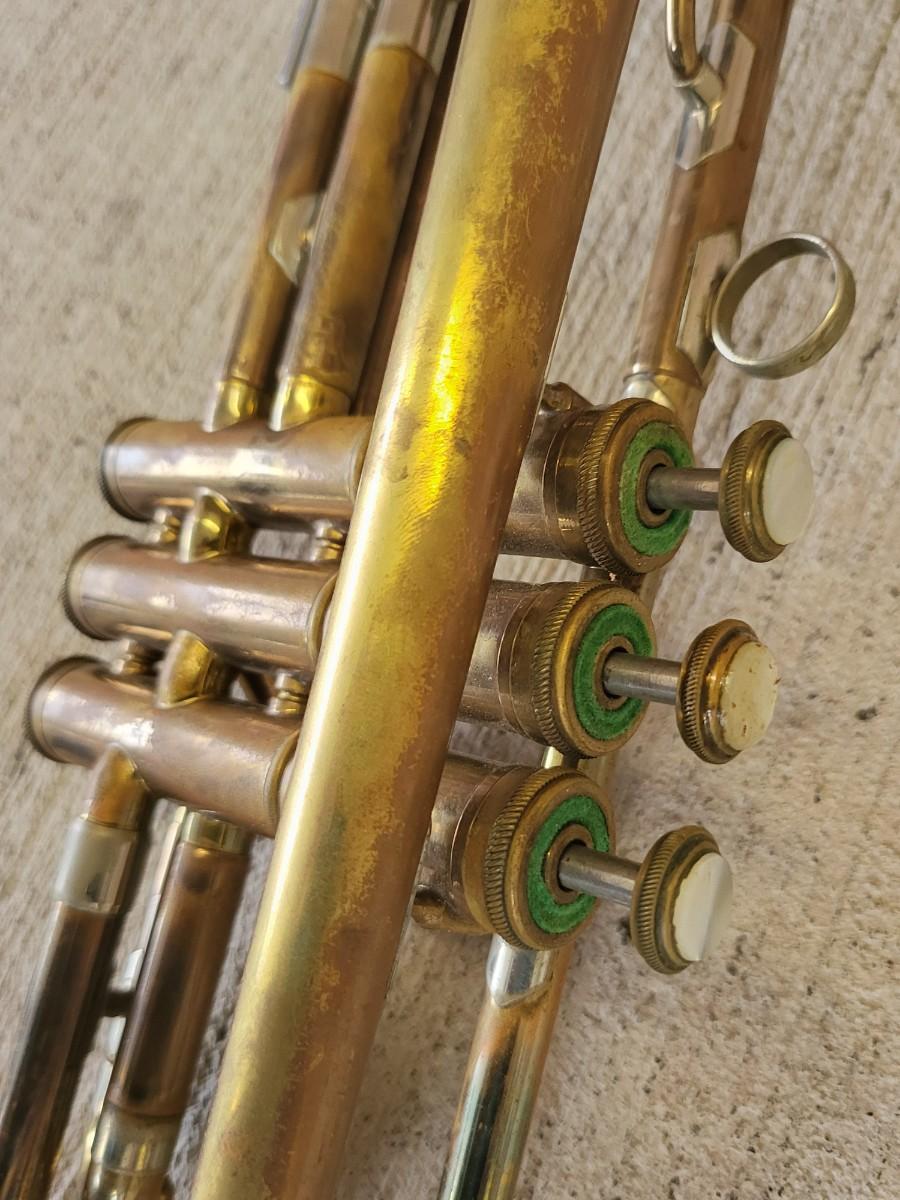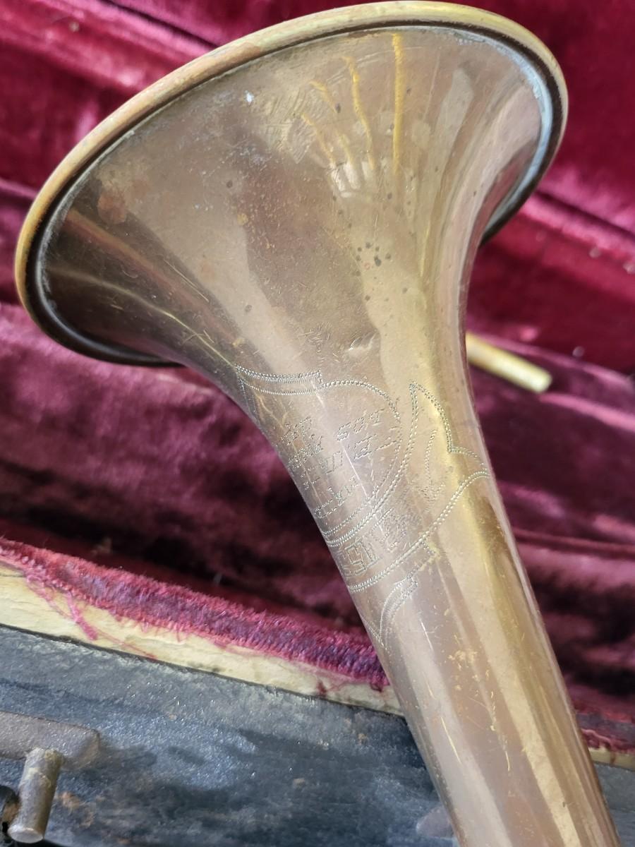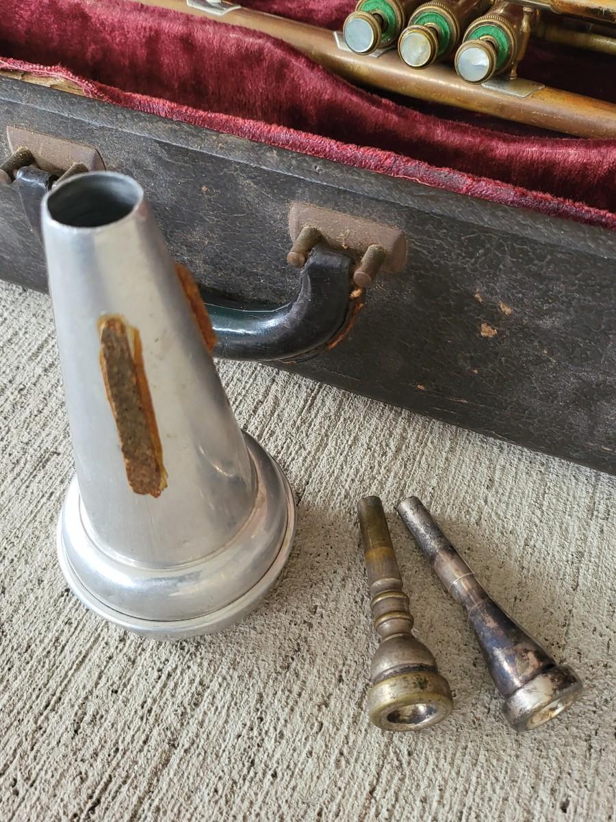 Older, Ambassador brass trumpet in velvet lined case. Needs to be cleaned. Was not tested. There is makers etching on the top part of the horn.