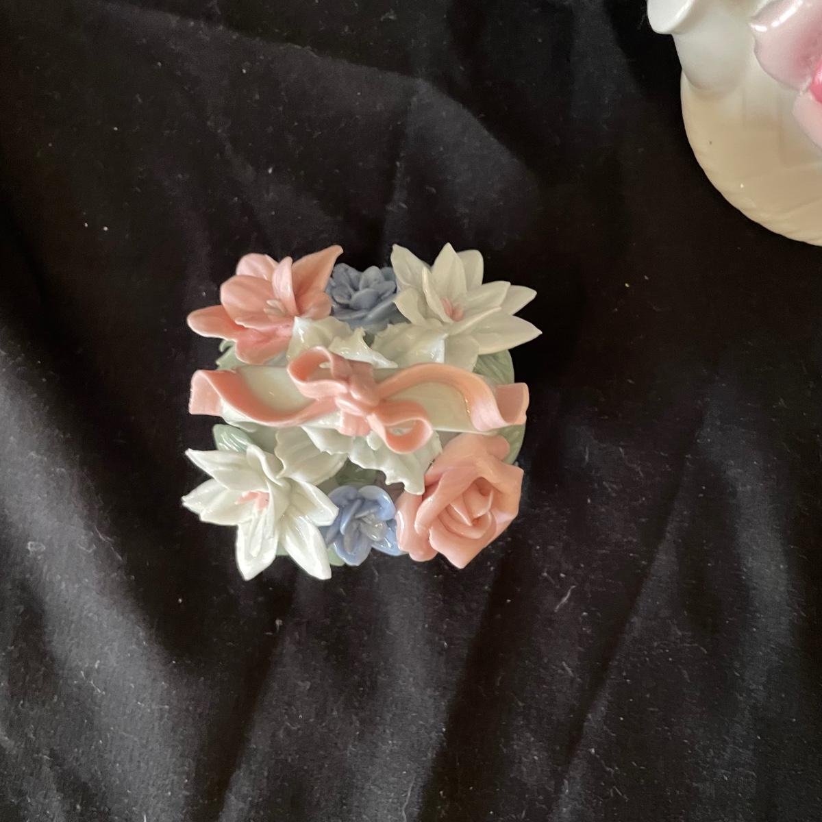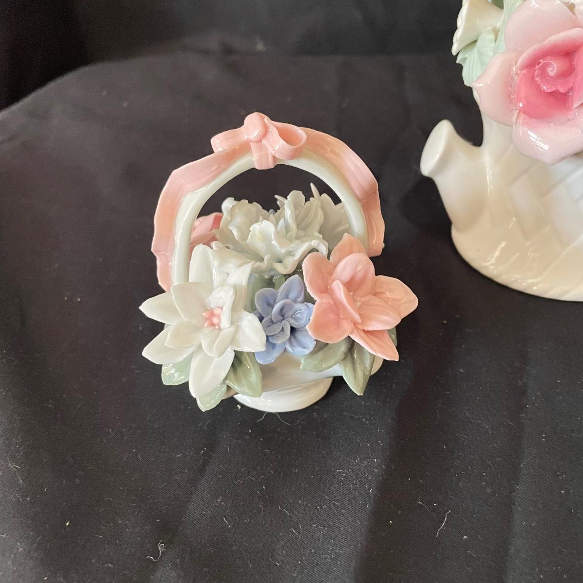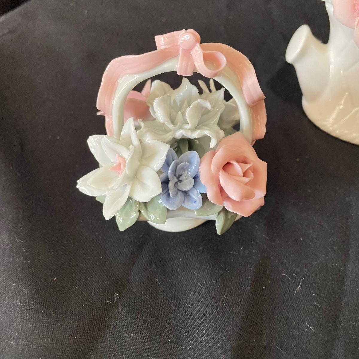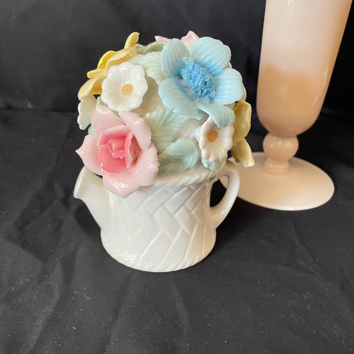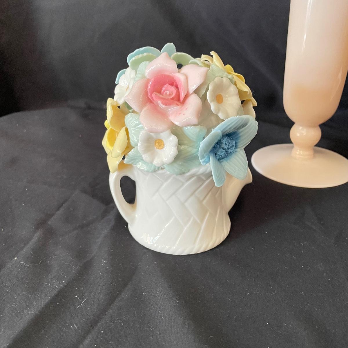 An opaque pink glass trumpet vase along with three pretty porcelain flower arrangements and Victorian Trading Co silver metal tape measure. The tape measure comes with its original box which measures 3.5”SQ x 1.5”H. The Irice watering can bud vase has a drainage hole with a plug. The other two porcelain flower have no known markings. The two-stem yellow/orange rose is about 8” long and has some very tiny chips, see photos. The 12” tall trumpet vase also has no known markings. See images. Shipping available.