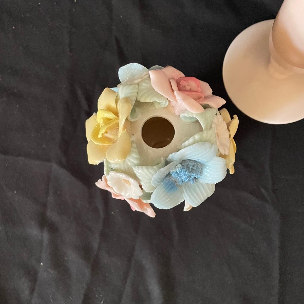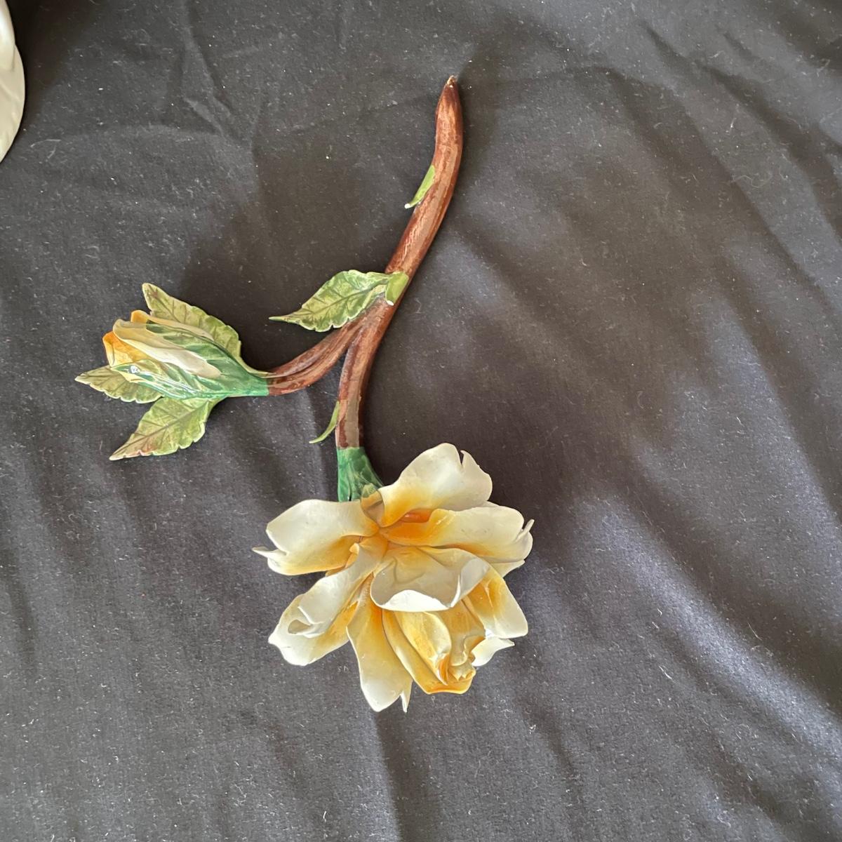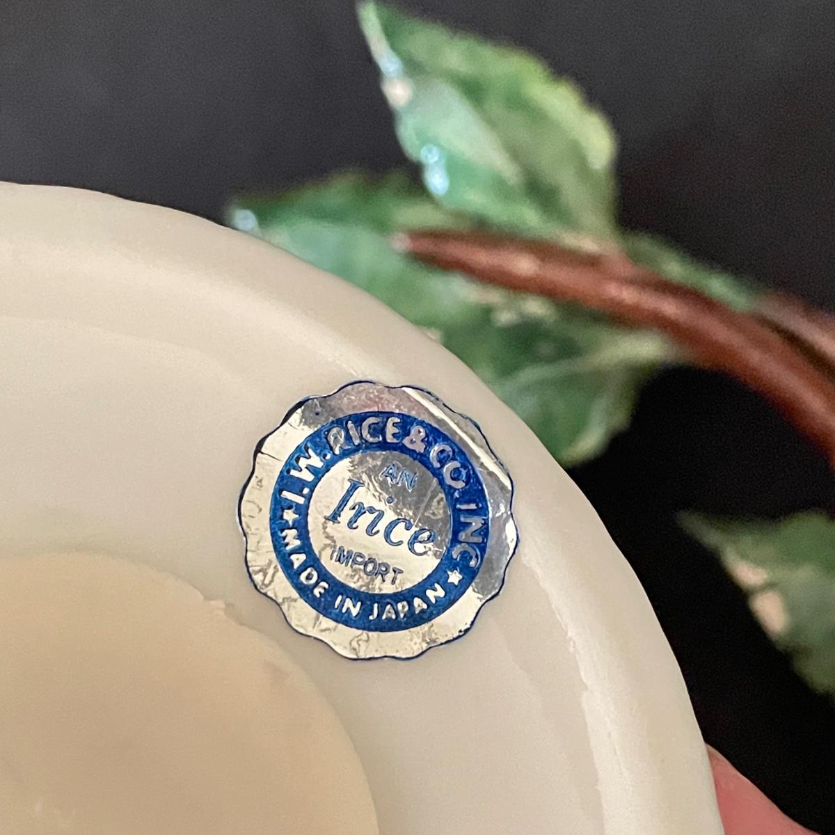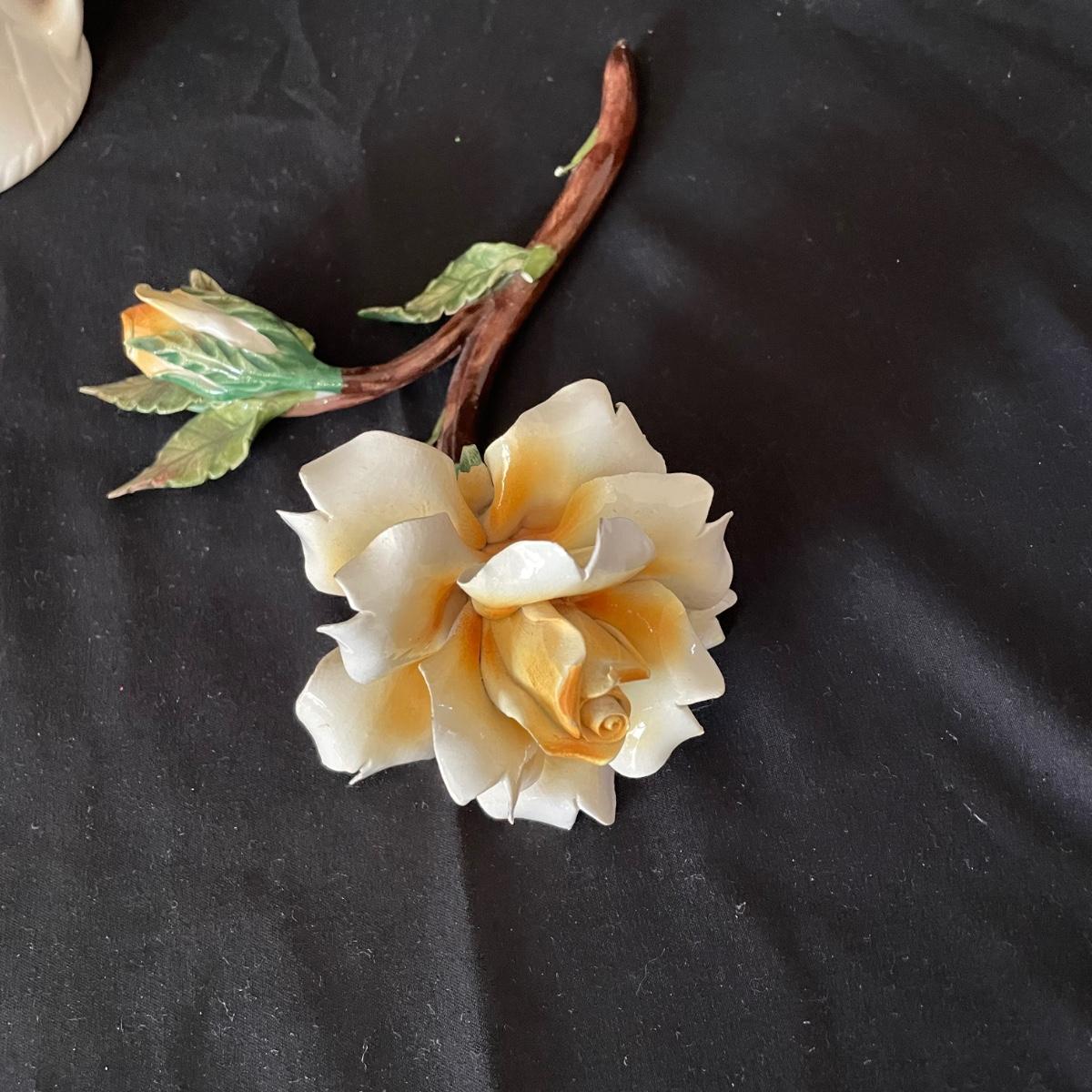 An opaque pink glass trumpet vase along with three pretty porcelain flower arrangements and Victorian Trading Co silver metal tape measure. The tape measure comes with its original box which measures 3.5”SQ x 1.5”H. The Irice watering can bud vase has a drainage hole with a plug. The other two porcelain flower have no known markings. The two-stem yellow/orange rose is about 8” long and has some very tiny chips, see photos. The 12” tall trumpet vase also has no known markings. See images. Shipping available.