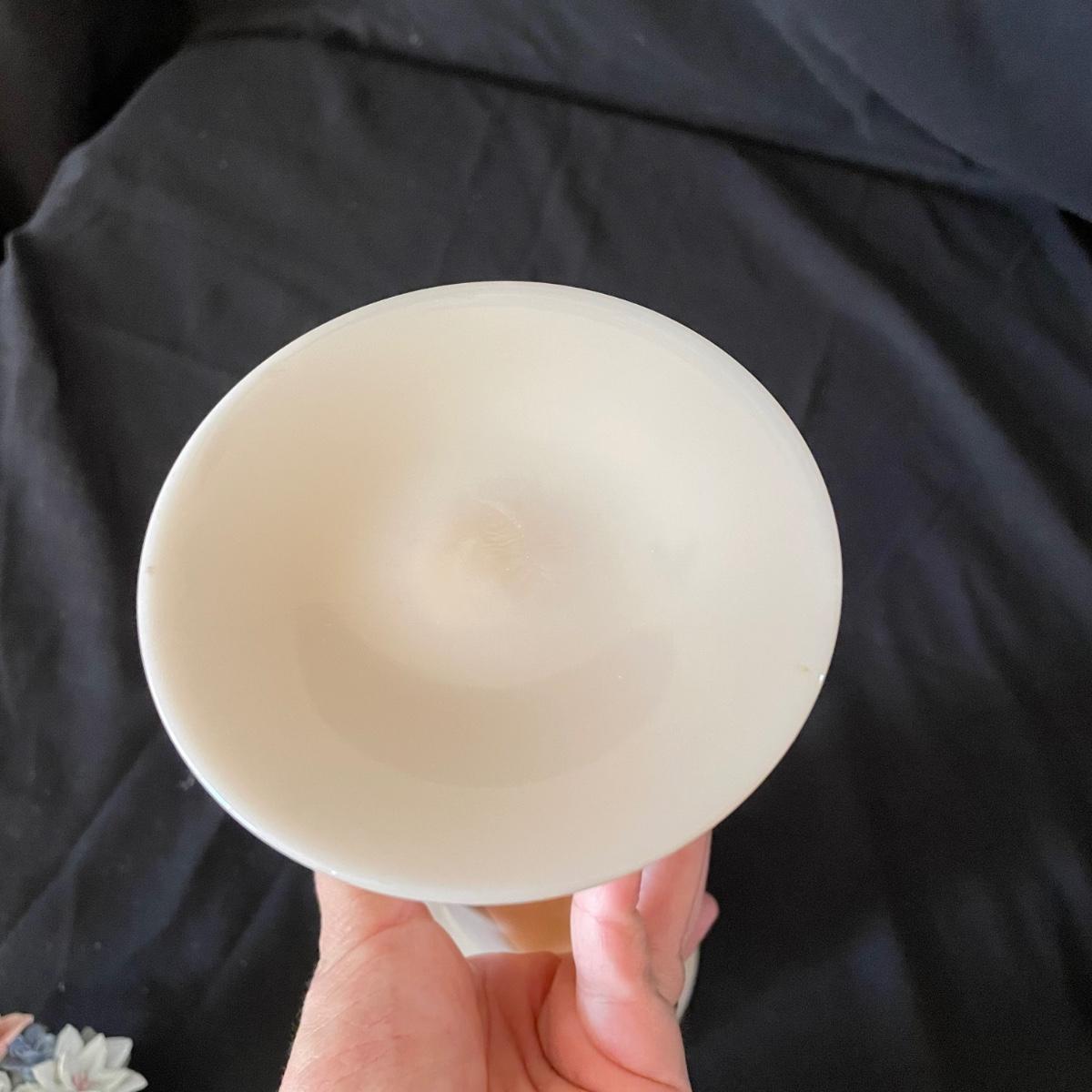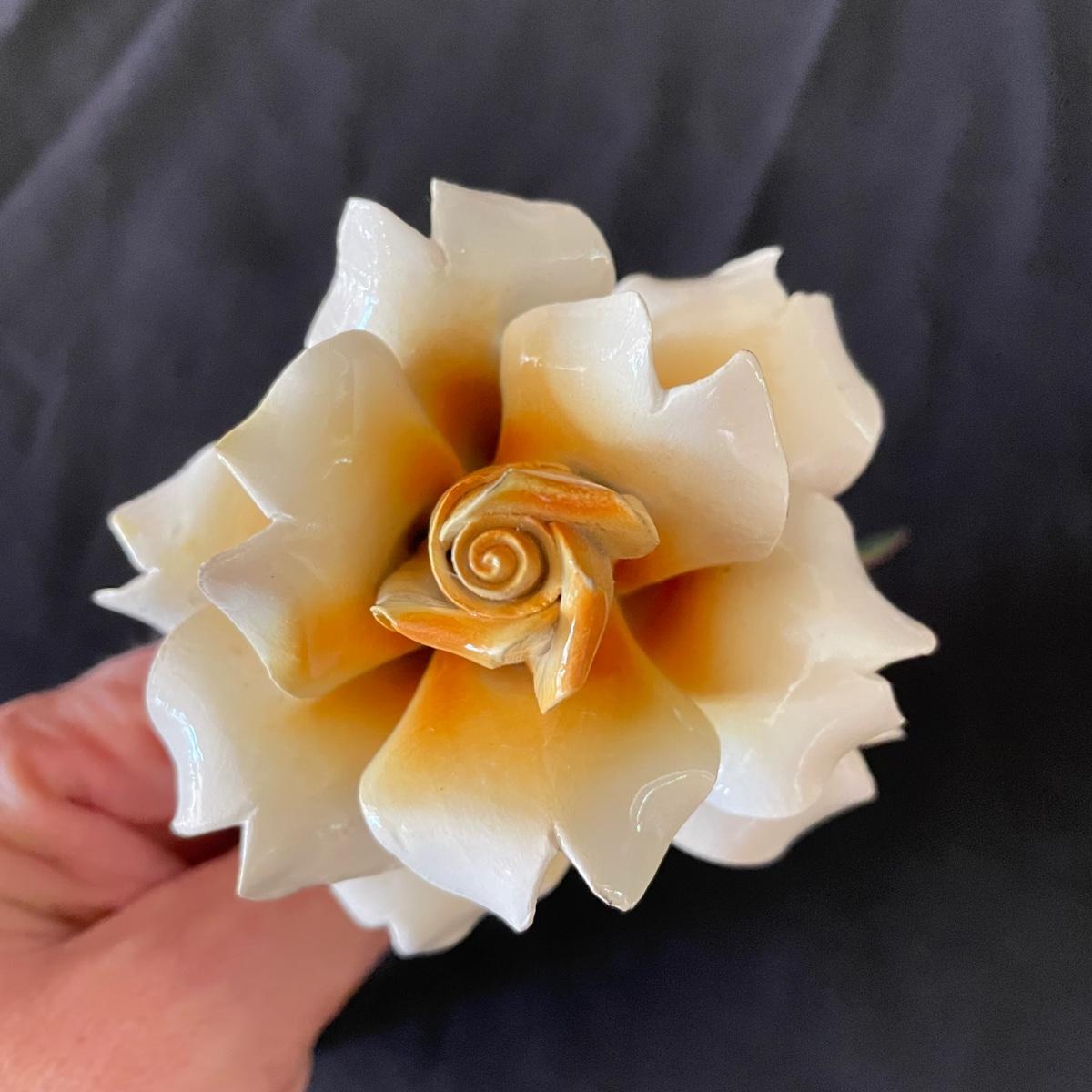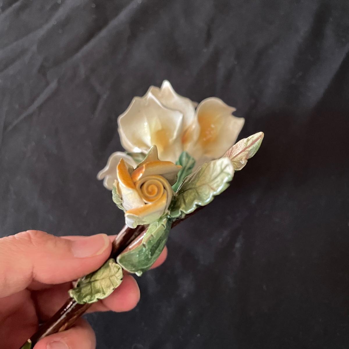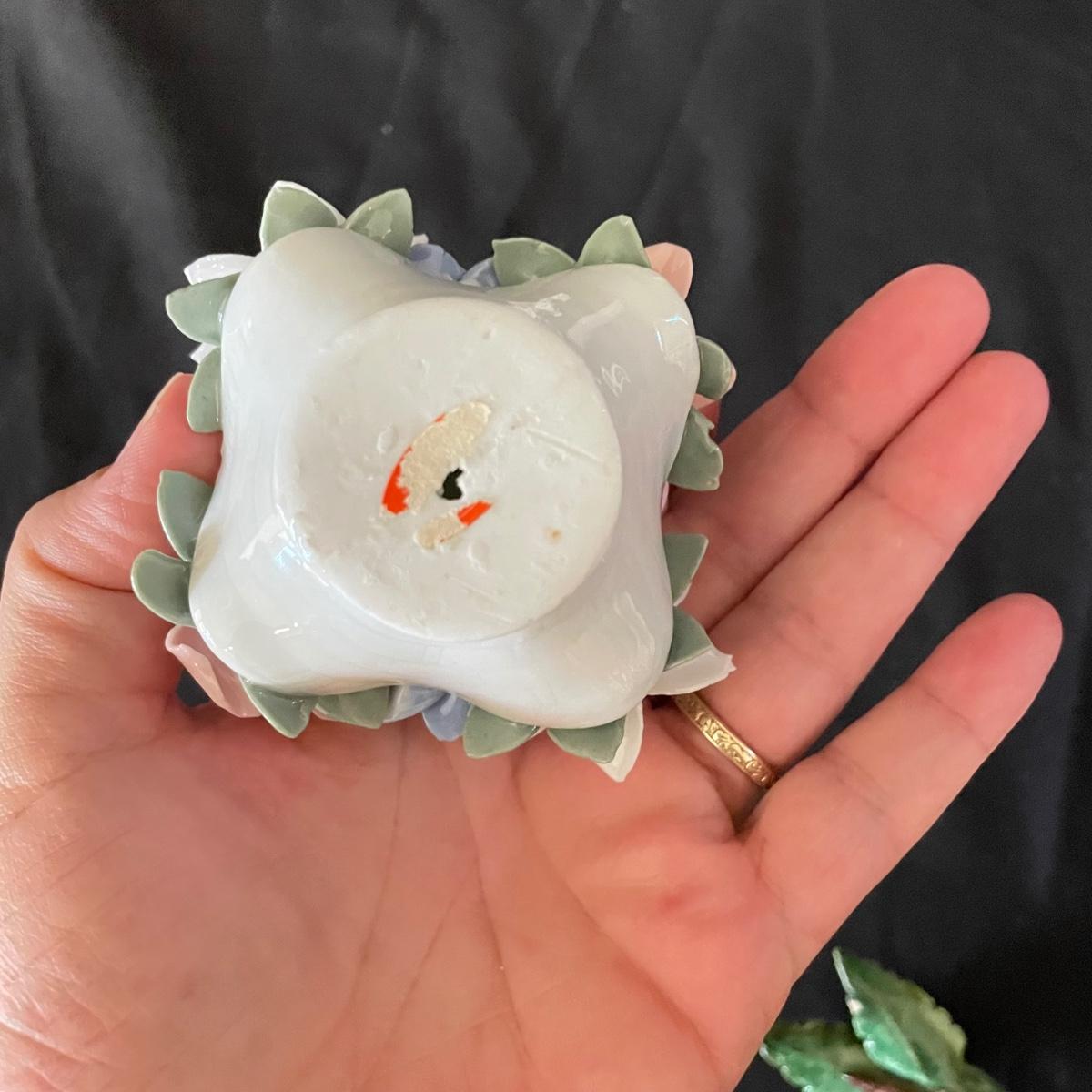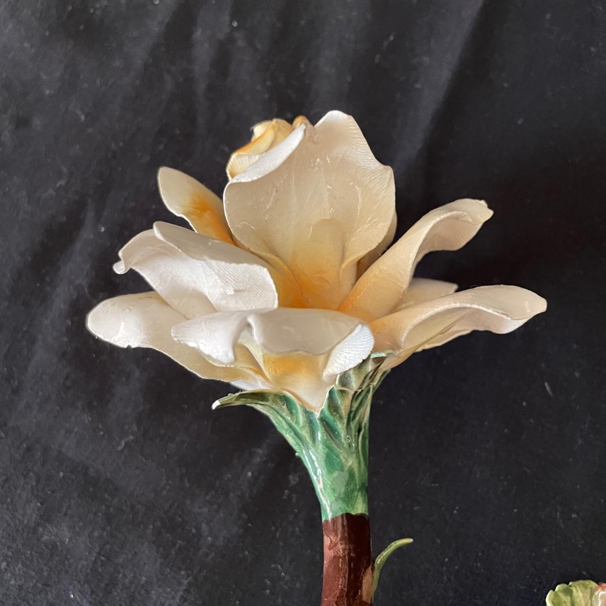 An opaque pink glass trumpet vase along with three pretty porcelain flower arrangements and Victorian Trading Co silver metal tape measure. The tape measure comes with its original box which measures 3.5”SQ x 1.5”H. The Irice watering can bud vase has a drainage hole with a plug. The other two porcelain flower have no known markings. The two-stem yellow/orange rose is about 8” long and has some very tiny chips, see photos. The 12” tall trumpet vase also has no known markings. See images. Shipping available.