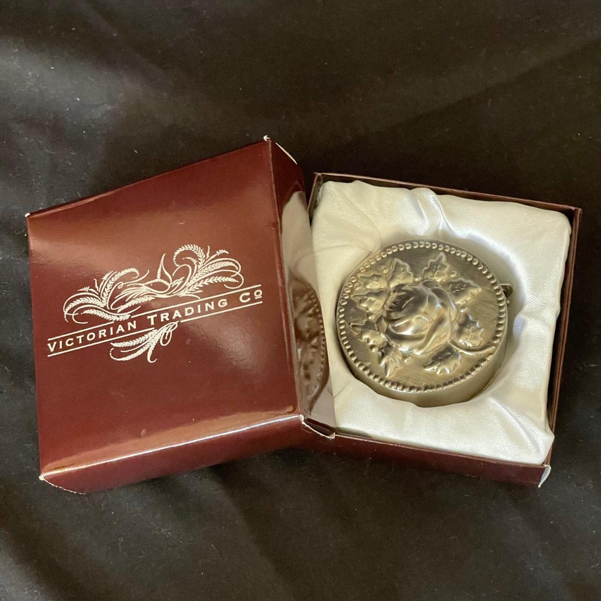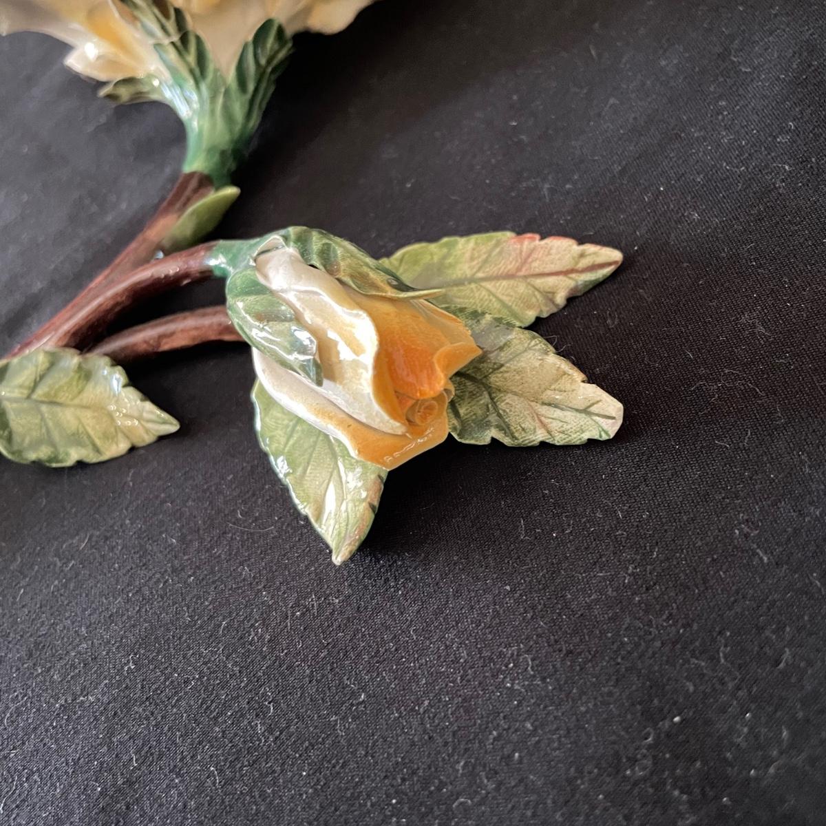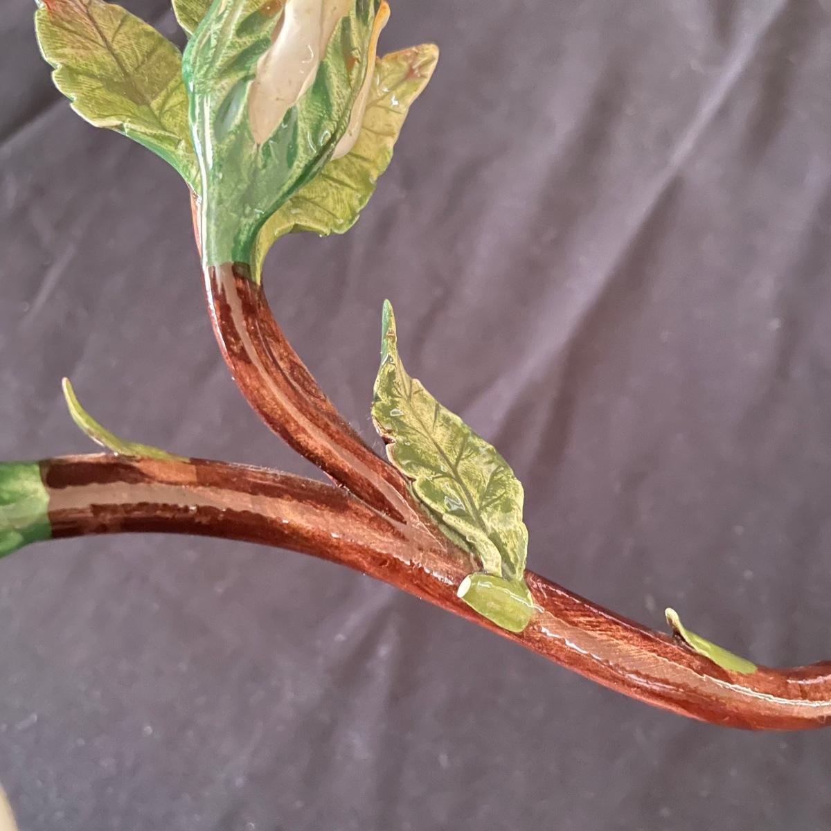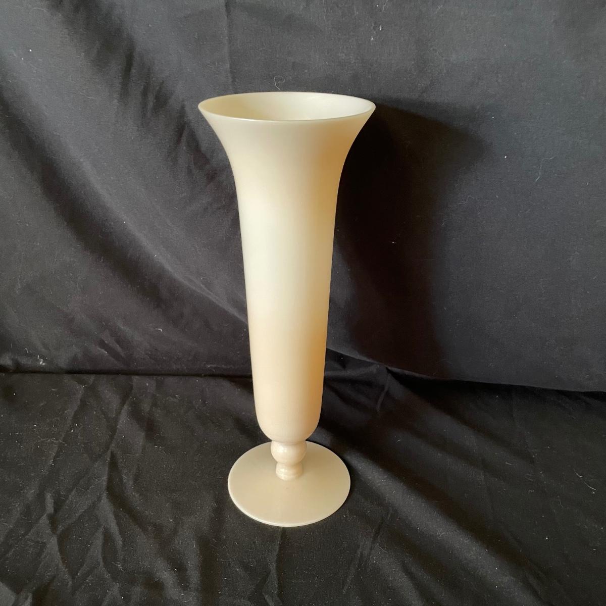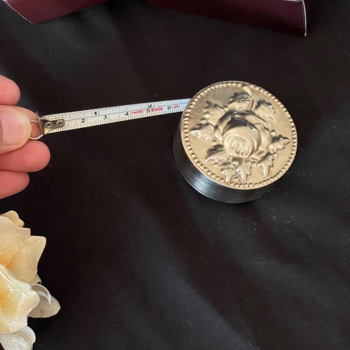 An opaque pink glass trumpet vase along with three pretty porcelain flower arrangements and Victorian Trading Co silver metal tape measure. The tape measure comes with its original box which measures 3.5”SQ x 1.5”H. The Irice watering can bud vase has a drainage hole with a plug. The other two porcelain flower have no known markings. The two-stem yellow/orange rose is about 8” long and has some very tiny chips, see photos. The 12” tall trumpet vase also has no known markings. See images. Shipping available.