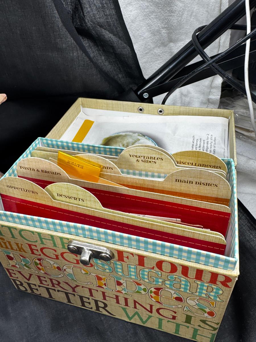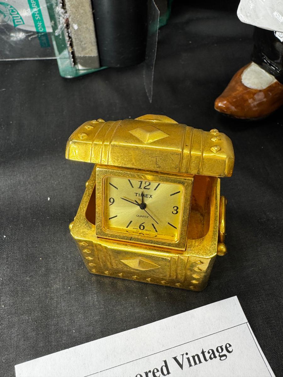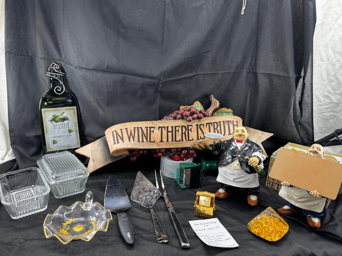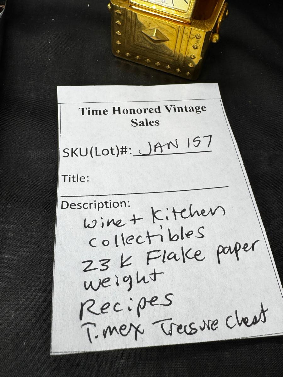 Please ignore the packing tape, not part of the lot. Serving utensils, 23K gold paperweight, vintage glass refrigerator dishes, Timex treasure chest clock, 2 kitchen butlers and 2 wine wall plaques. Special recipes in the latching recipe box.