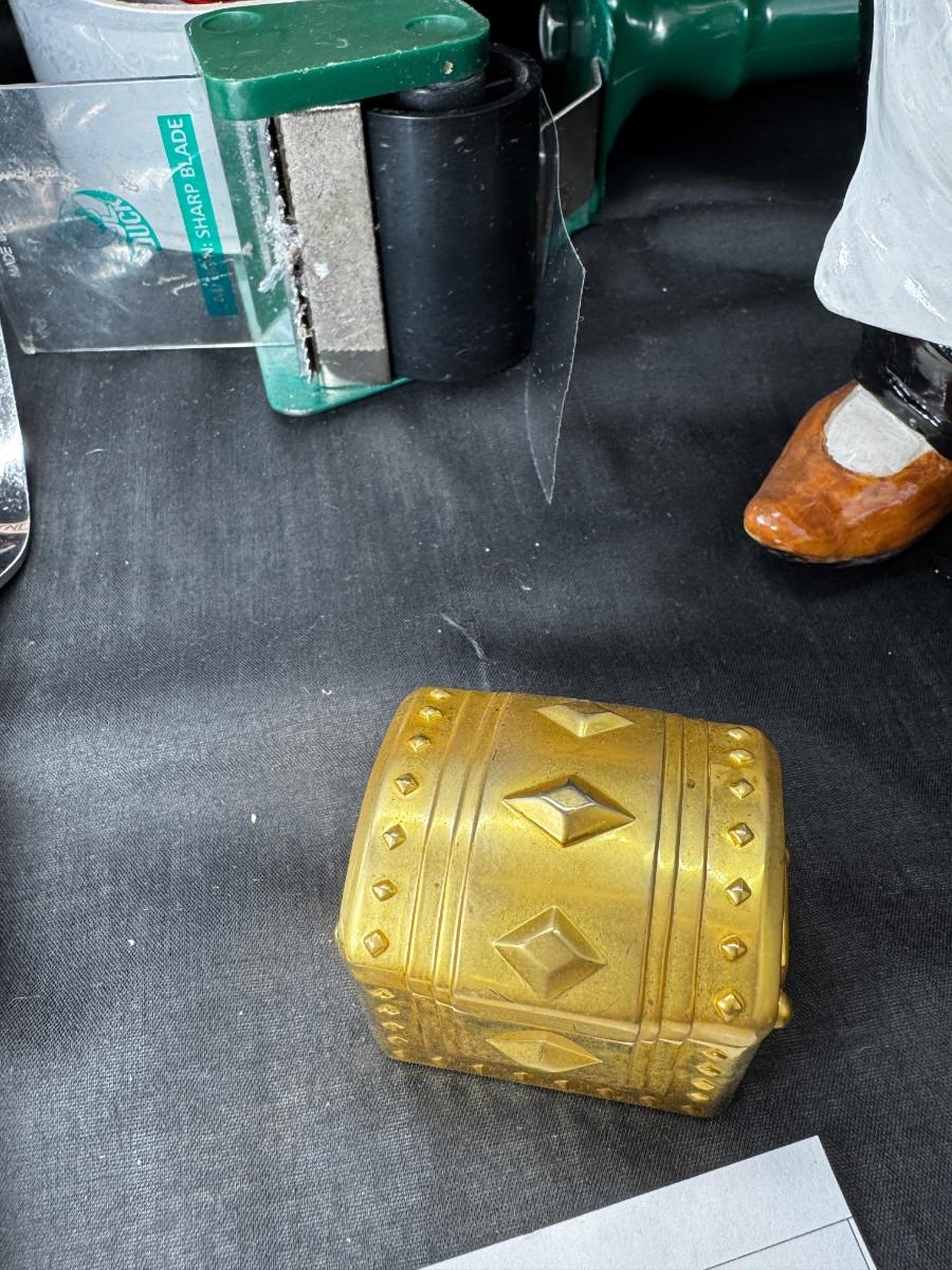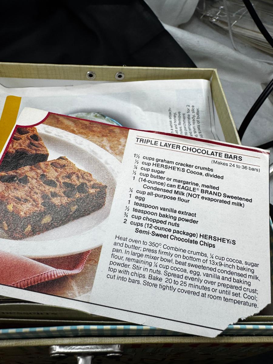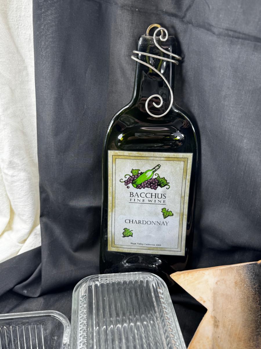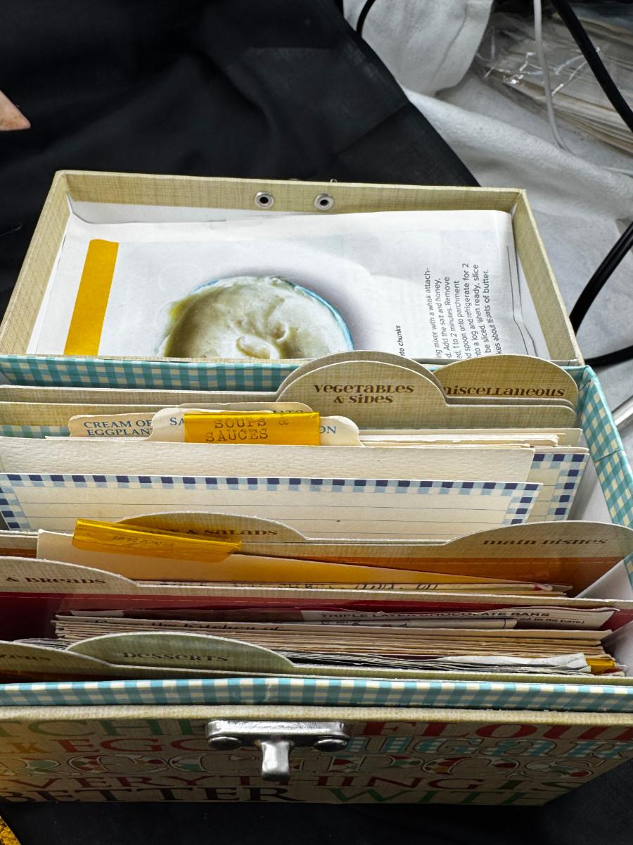 Please ignore the packing tape, not part of the lot. Serving utensils, 23K gold paperweight, vintage glass refrigerator dishes, Timex treasure chest clock, 2 kitchen butlers and 2 wine wall plaques. Special recipes in the latching recipe box.
