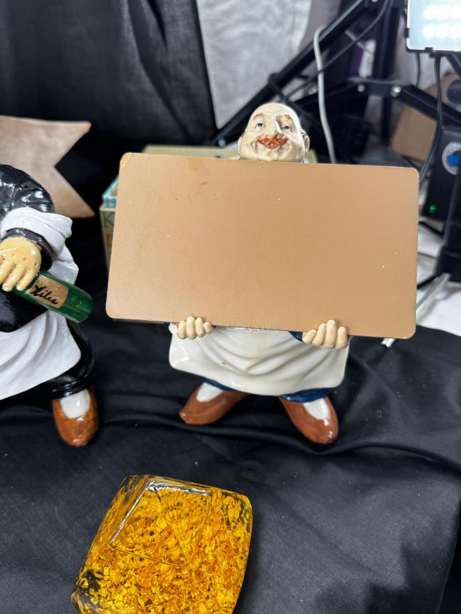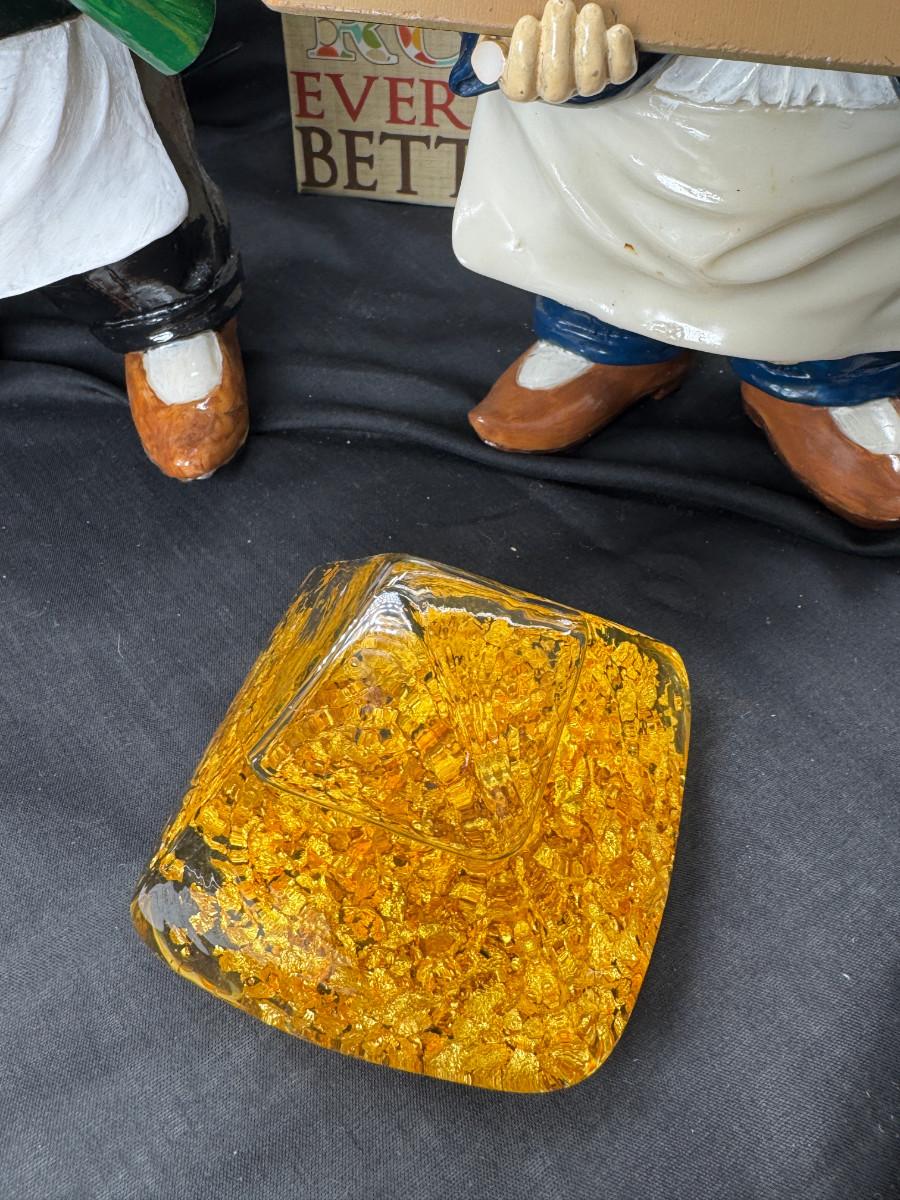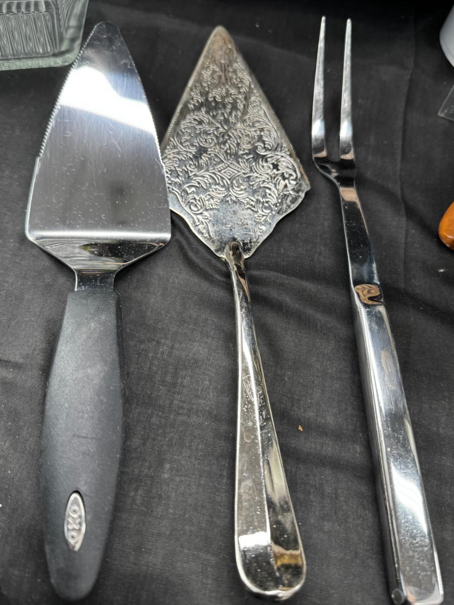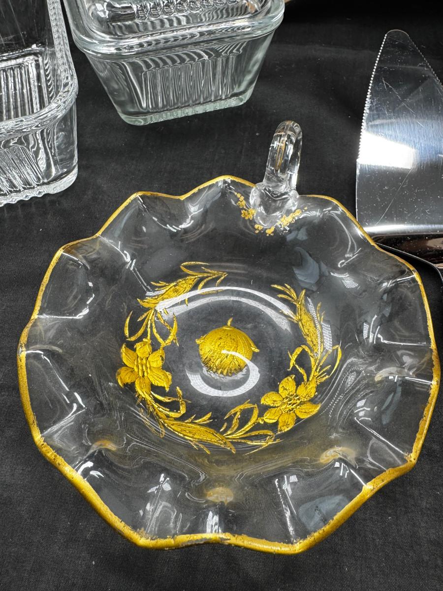 Please ignore the packing tape, not part of the lot. Serving utensils, 23K gold paperweight, vintage glass refrigerator dishes, Timex treasure chest clock, 2 kitchen butlers and 2 wine wall plaques. Special recipes in the latching recipe box.