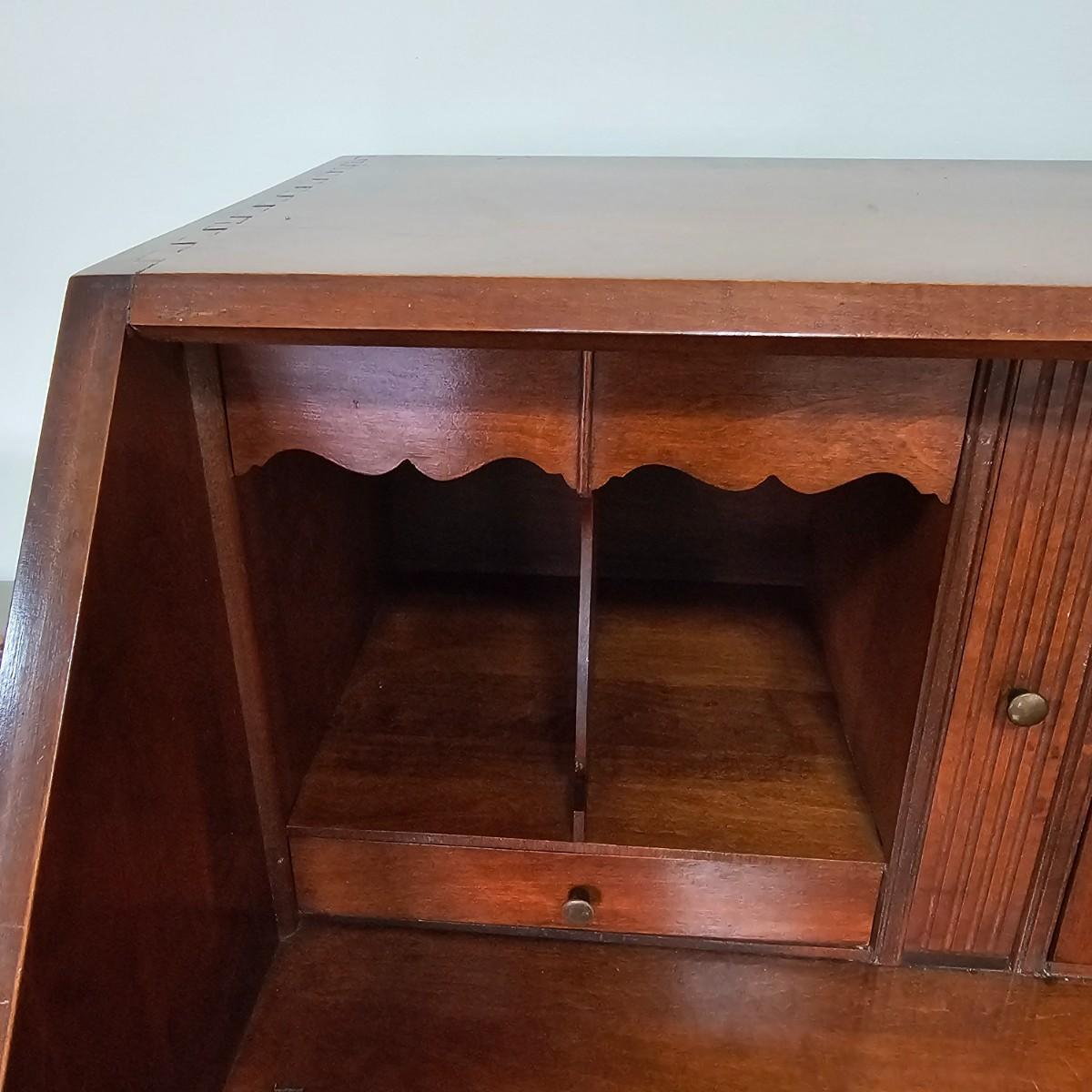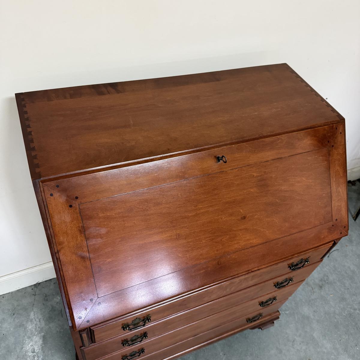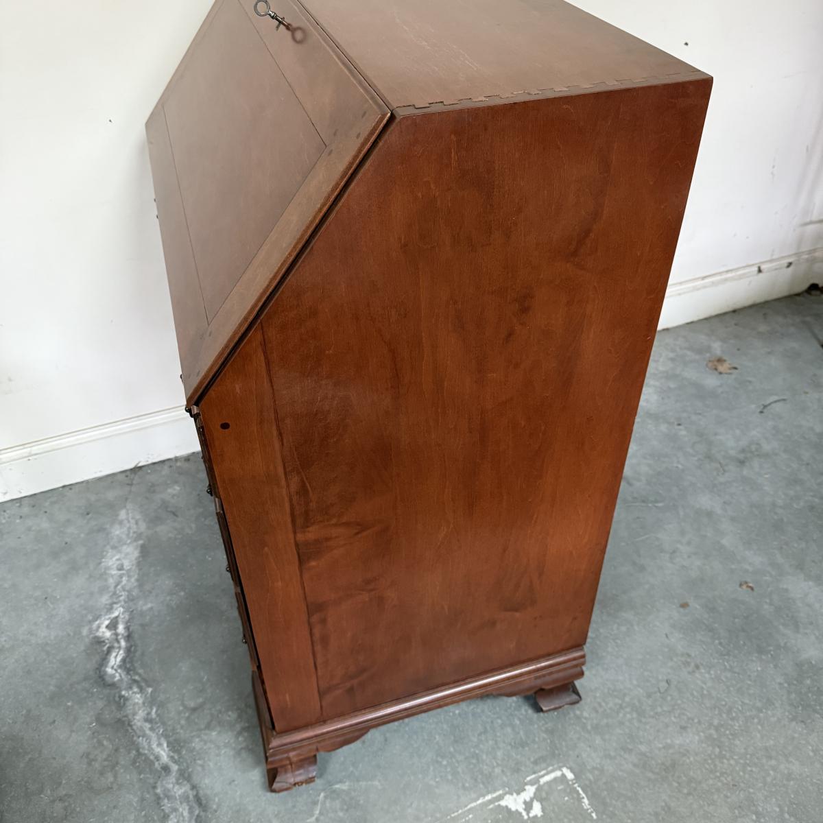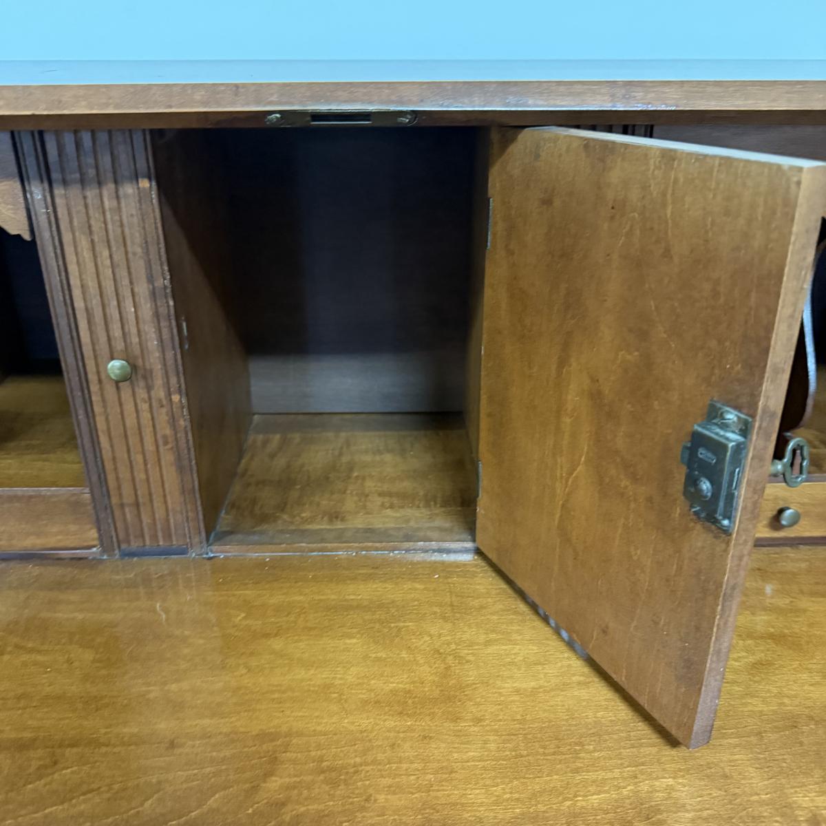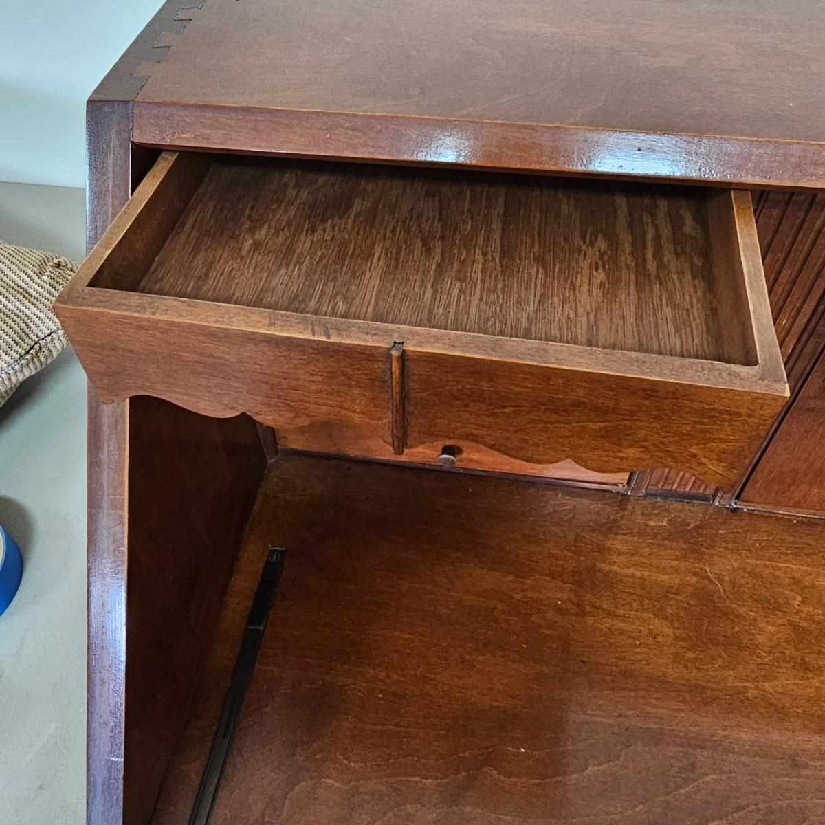 Beautiful wooden Trutype brand secretary desk features dovetailed construction throughout. The desk rolls very smoothly and easily on casters. It measures 32.75” x 21” x 41.5”H. Two keys are included and both locking mechanisms function.