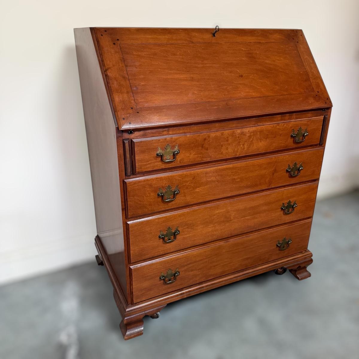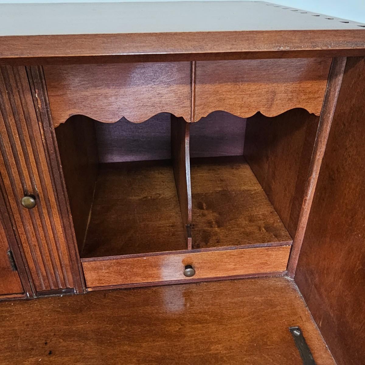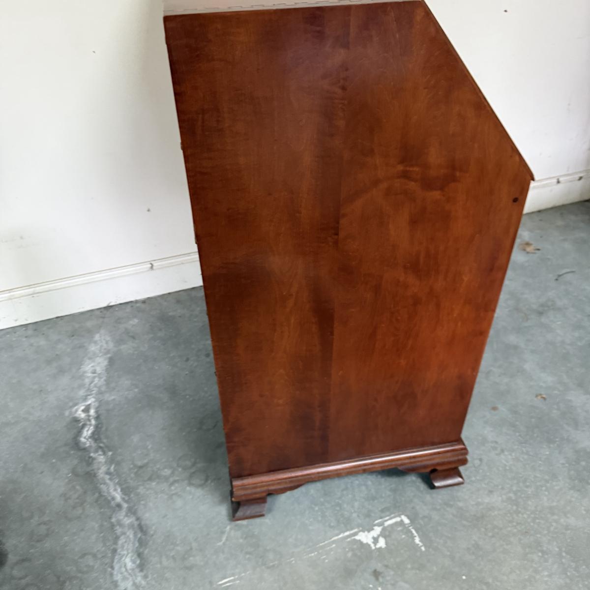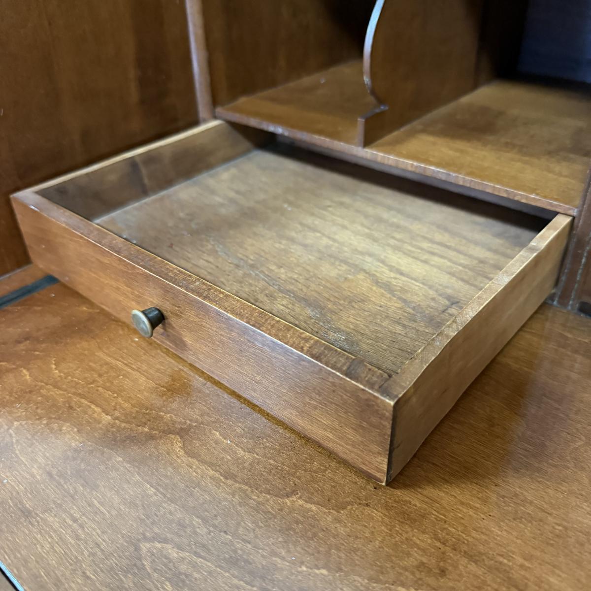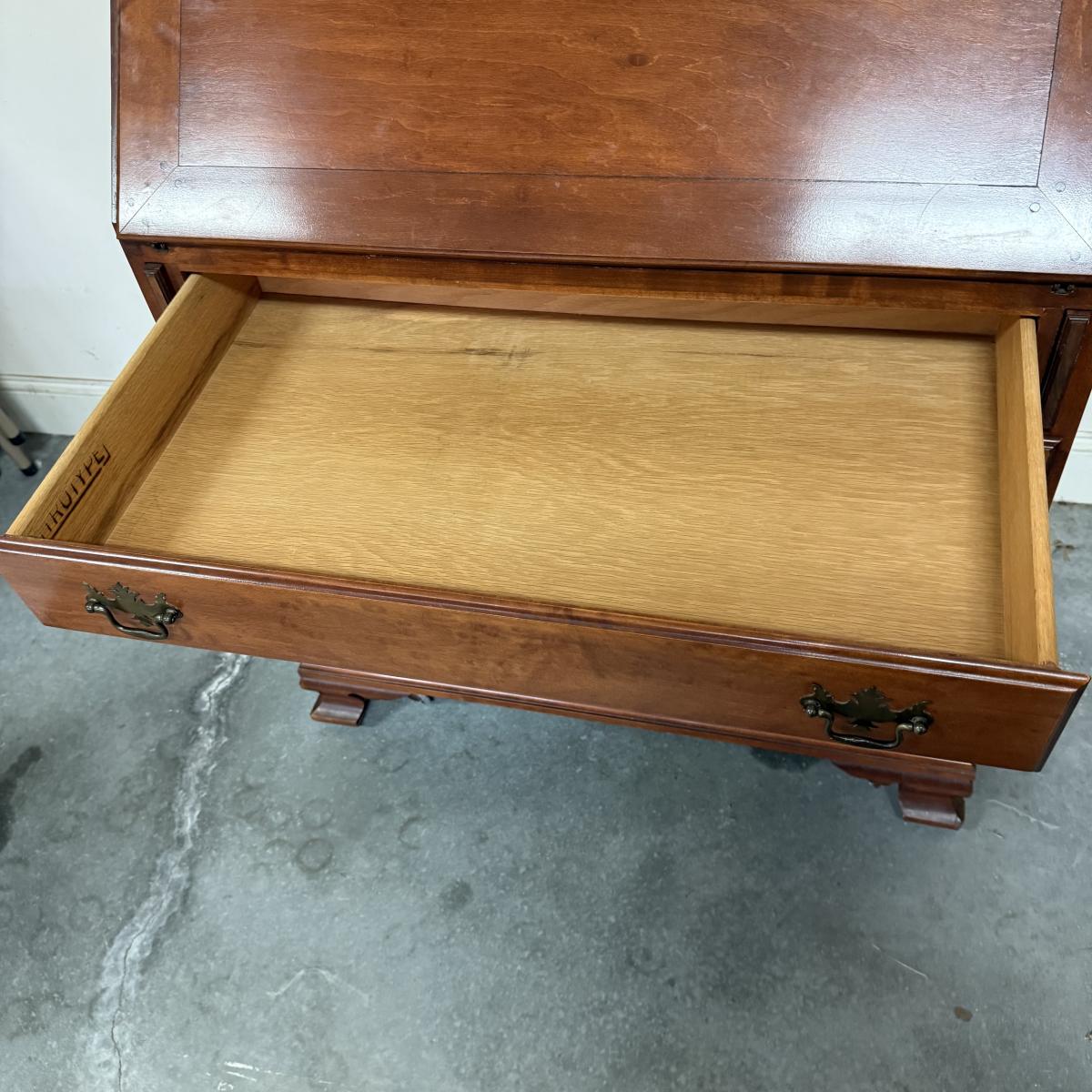 Beautiful wooden Trutype brand secretary desk features dovetailed construction throughout. The desk rolls very smoothly and easily on casters. It measures 32.75” x 21” x 41.5”H. Two keys are included and both locking mechanisms function.